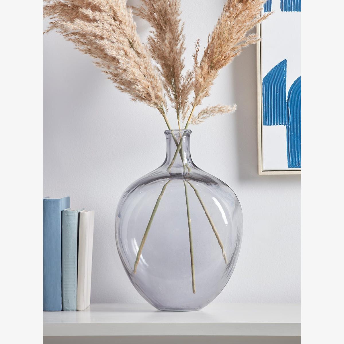 Simple, but full of character, this bottle vase has a lovely round tummy and elegant smoked finish. The broad base and slim neck makes it the perfect vessel for tall blooms or some artfully arranged pampas stems.