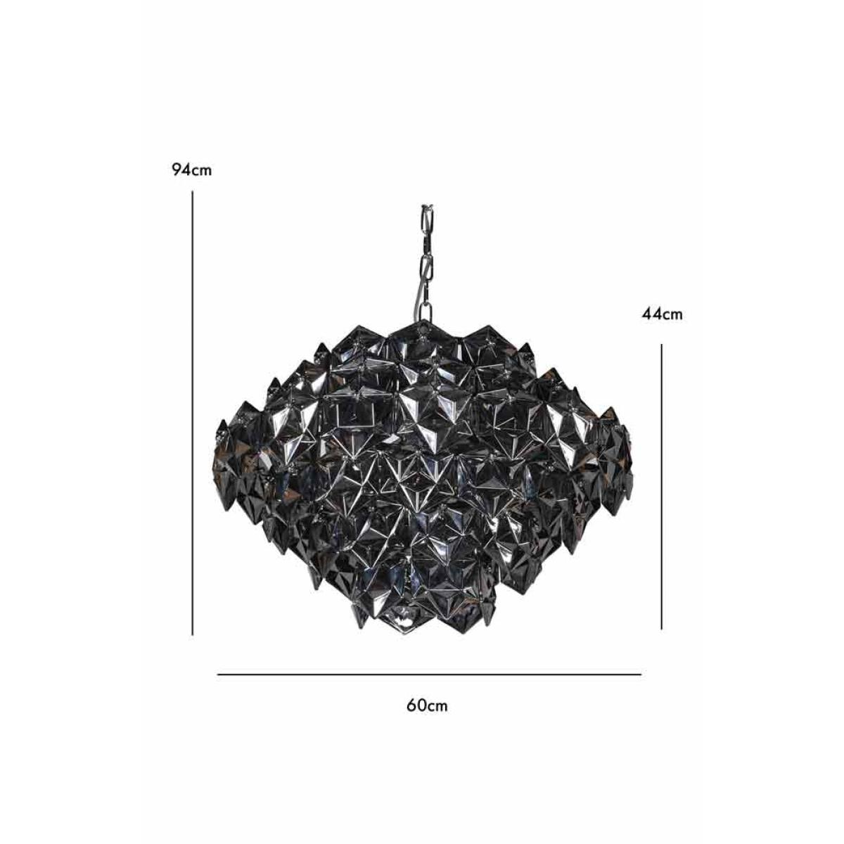 About The Smoked Showstopping Multi-Layer Glass Chandelier Back but in black and looking as stunning as ever, the Smoked Showstopping Multi-Layer Glass Chandelier will add extraordinary statement style to your interior décor. Showcasing utter grandeur this glass crystal chandelier features an array of smoky grey glass crystals arranged in tiers that give it magnificent glitz and glamour. Measuring 44cm in height and 60cm in diameter with an 80cm length flex, this artisan chandelier takes 7 light bulbs to illuminate its enchanting design in all its glory. Please note, this light fixture cannot be used with our bulbs and the base level of sockets presents a tight fit so please handle with care. We recommend having a qualified electrician install this light. Why We Think You’ll Love The Large Tiered Chandelier Showcasing spectacular visual interest, this gorgeous light exudes the look of a striking 3D light display. It’s also a totally eye-catching textural piece that’ll help to create a visual balance against the soft furnishing in your décor. This extraordinary pendant shade radiates an enchanting warm glow that’ll flow through the layers of glass crystal giving your space wow factor and a wonderful theatrical appearance. Where To Style The Magnificent Smoked Glass Chandelier Showcasing an extraordinary grand look, this unique glass chandelier would look magnificent taking centre stage in a living room scheme. Pair with soft furnishings around the room to break the striking look of the glass chandelier whilst simultaneously uplifting it with a luxurious and glamorous feel. Or curate an utterly unforgettable entrance by displaying it in a hallway as the first light feature you see when people walk through the door.