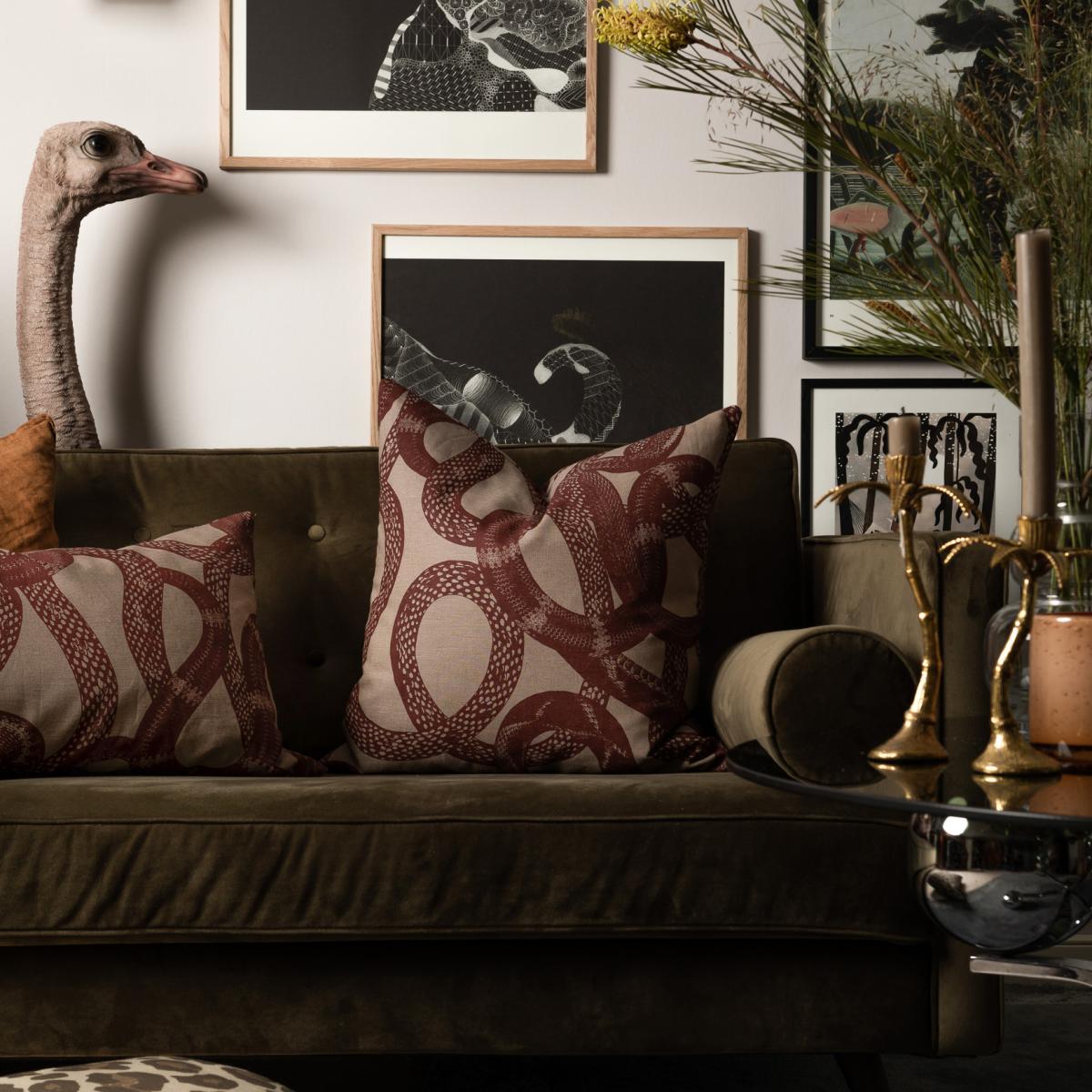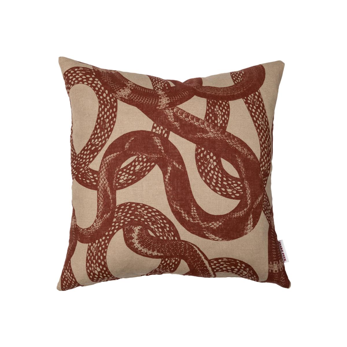 I love this snake motif cushion for its bold, graphic design and warm colour palette. It works particularly well in modern or Scandinavian-style interiors where it can add a touch of visual interest and personality to a neutral sofa or bed. The beige-rust red tones make it versatile enough to pair with earthy tones, subtle patterned fabrics, or even plain textiles for a layered look. Practical styling tips include combining it with other textured cushions or placing it alongside natural materials like wood or rattan furniture to create a cosy yet contemporary space. Its size makes it perfect for use as an accent piece, whether on a lounge chair or a bed, for a pop of colour and pattern without overwhelming the overall look.