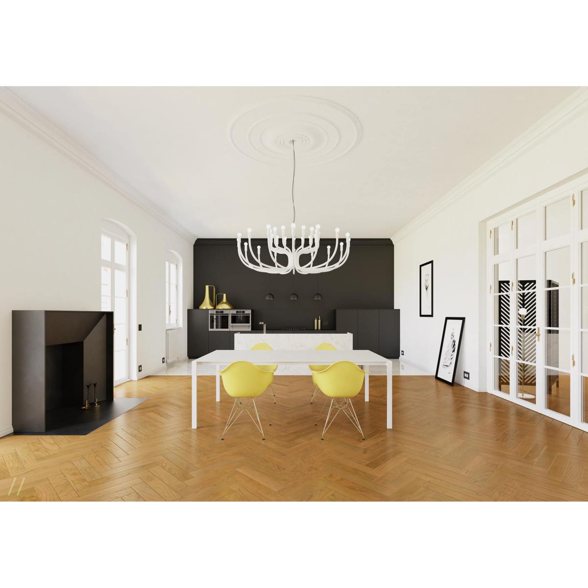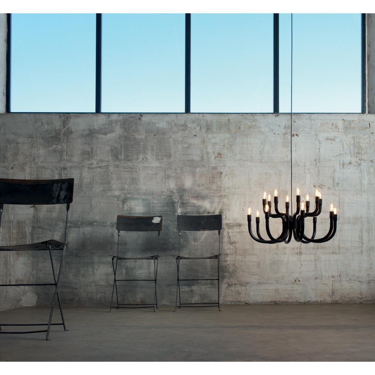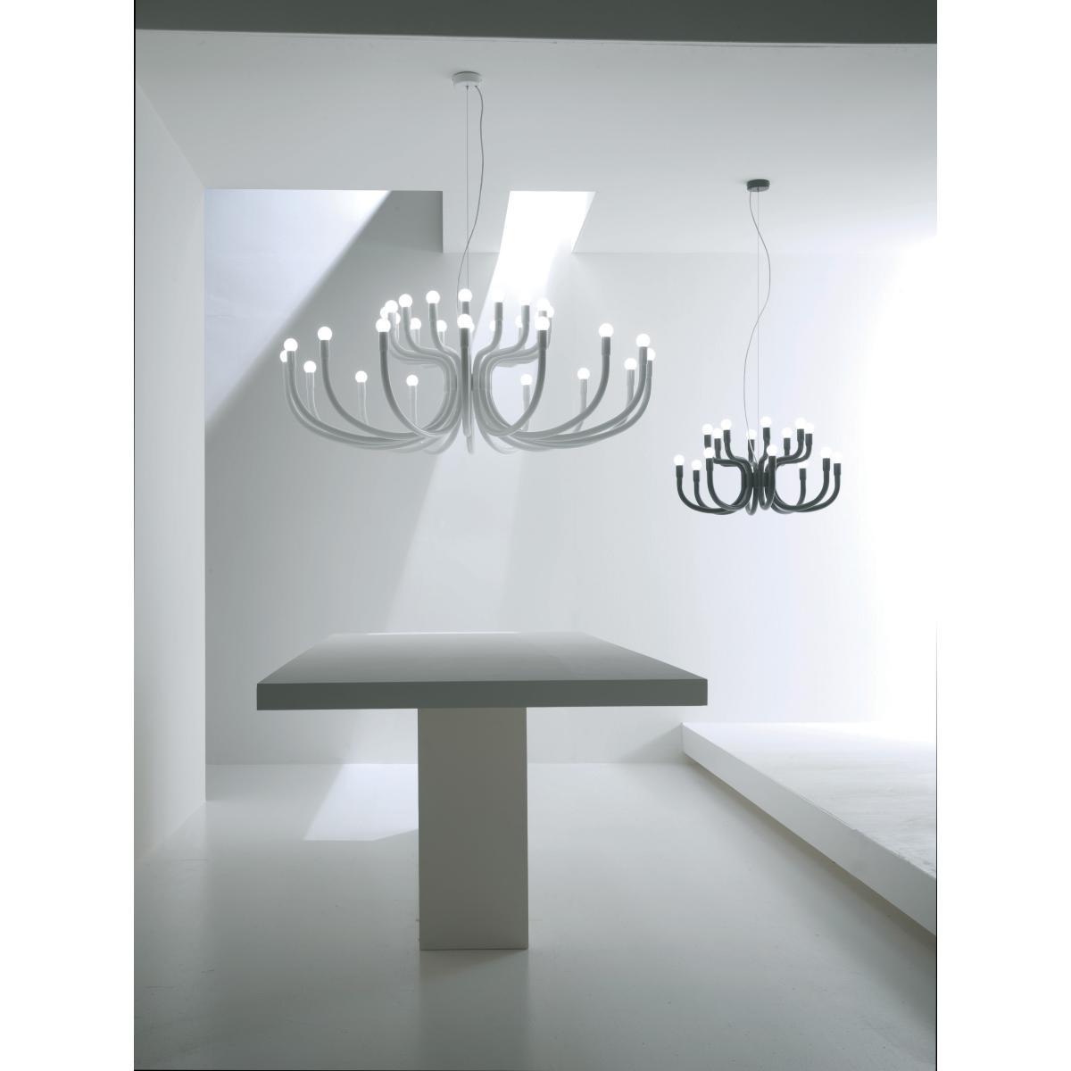Its profile reminds one among the most ancient chandeliers in rich and baroque palaces, whereas its metamorphosis towards the most extreme simplicity allows and inspires different kind of spaces, always keeping alive its presence.