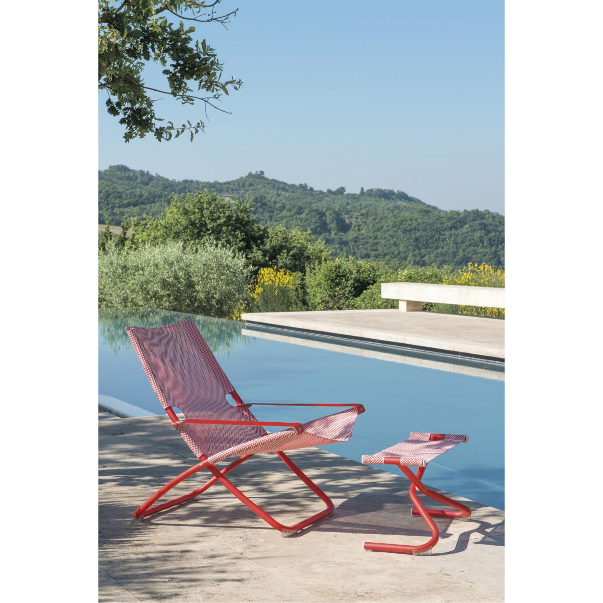 Snooze pouf / footrest combines a tubular steel frame with Emu-Tex fabric available in a wide range of colours. This extremely resistant outdoor technical fabric is ripstop and treated anti-UV. It is heat resistant and also easy to maintain, it can be washed with soap and water. The flexibility of the fabric and quality of the entire product provide optimal comfort.