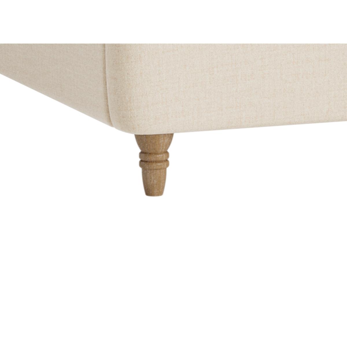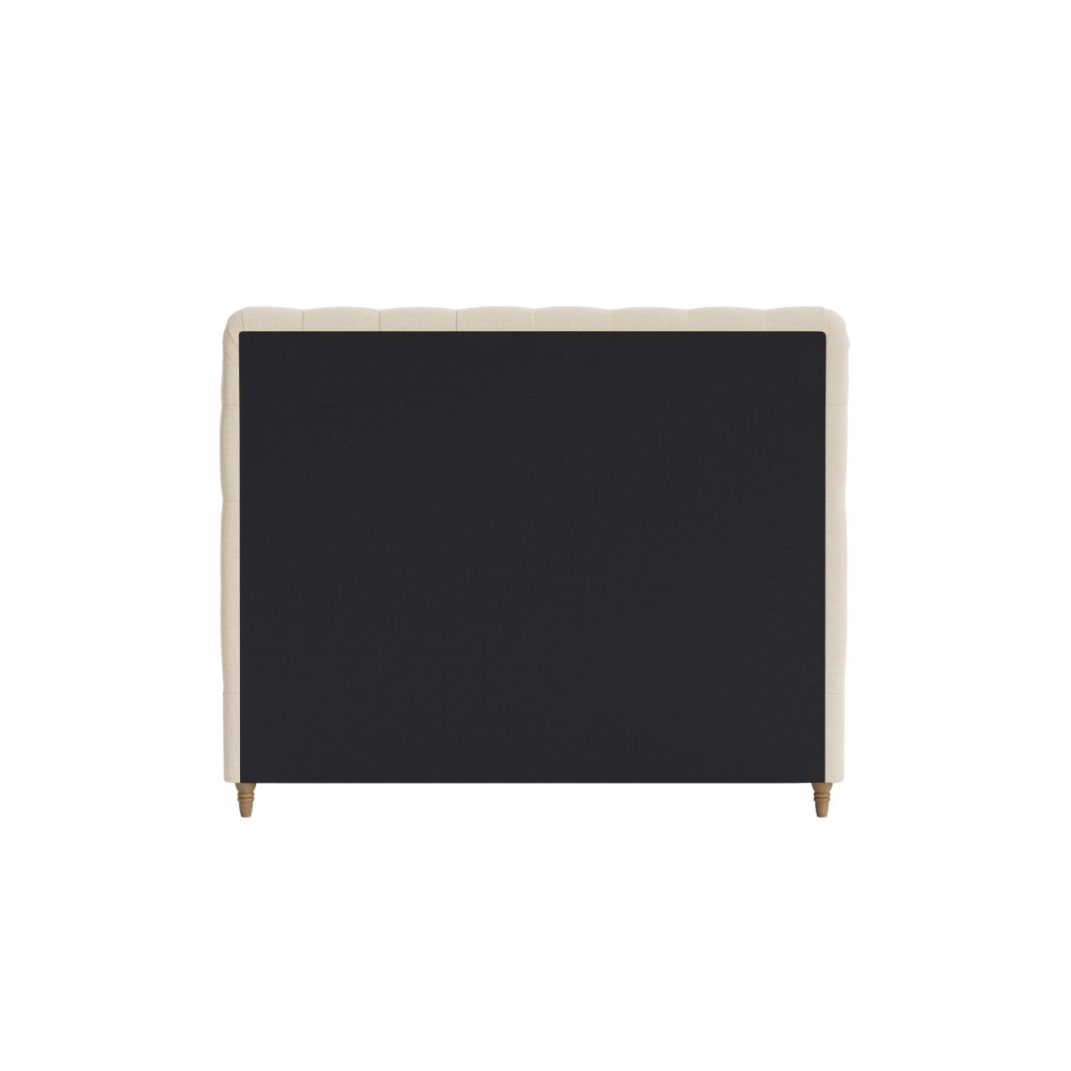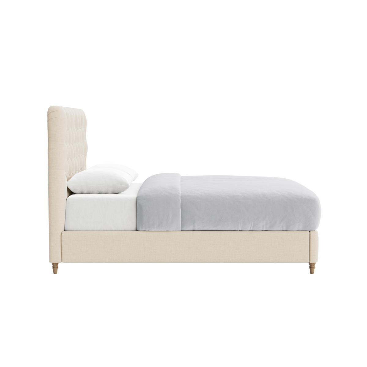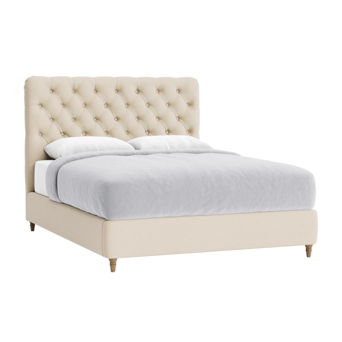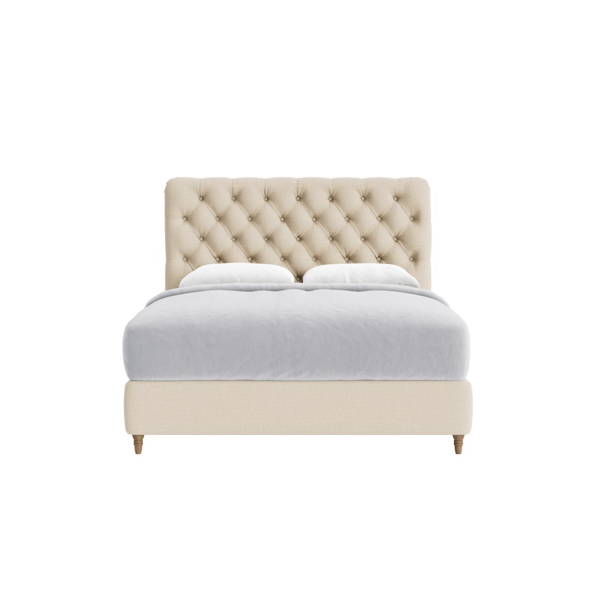 This bed's grandeur comes from traditional buttons and keeping the headboard fabric slightly relaxed. Job done.