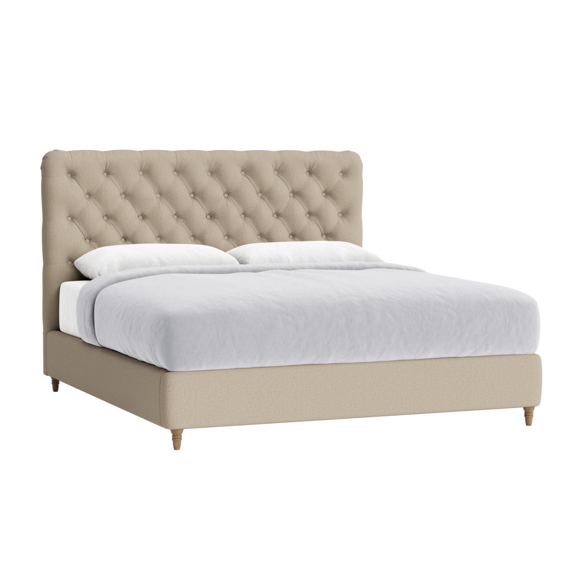 This bed's grandeur comes from traditional buttons and keeping the headboard fabric slightly relaxed. Job done.