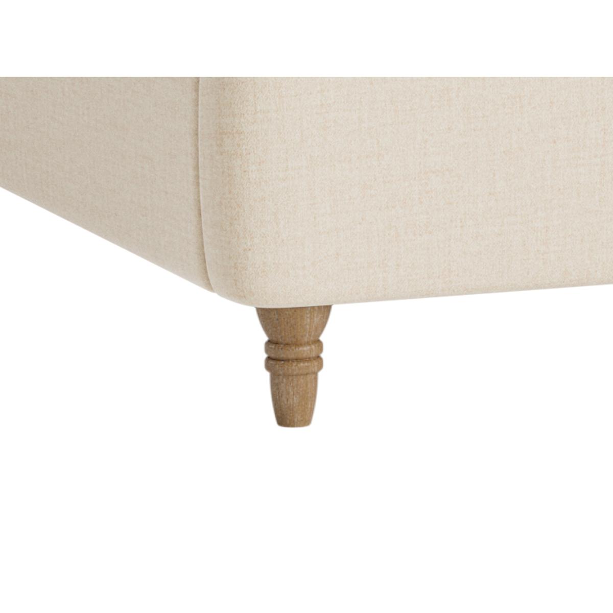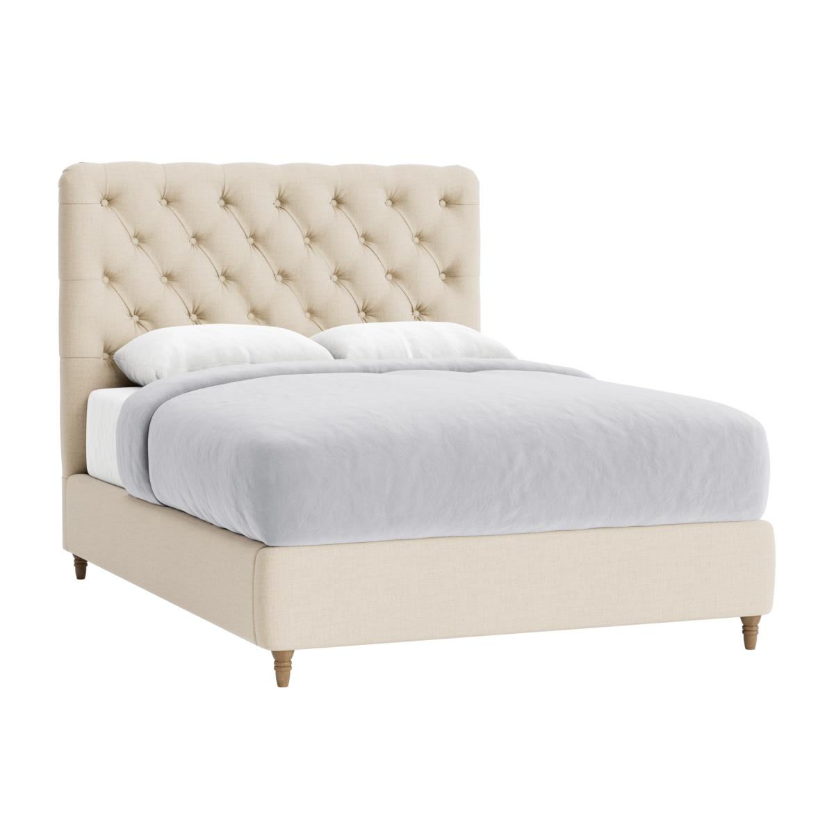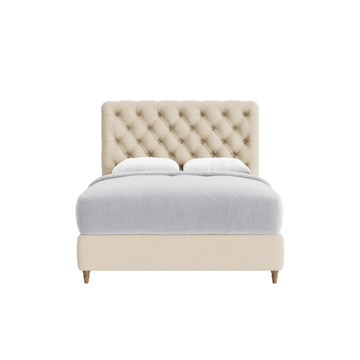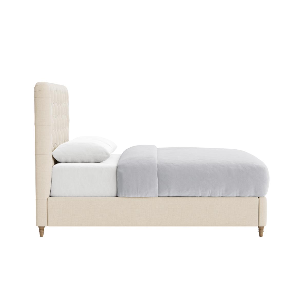 I love this bed frame because of its classic tufted headboard and versatile neutral tone, making it a great focal point in both traditional and contemporary interiors. It works especially well in cosy bedrooms or those styled with romantic, vintage, or modern minimalist themes. To style around it, consider layered bedding with textured throws or patterned cushions to add visual interest. Practical tips include placing a bedside table on each side for balance and functionality, and letting the soft fabric and warm hue serve as a calming backdrop for more colourful or patterned decor options. It’s a well-designed piece that balances comfort and style effortlessly.