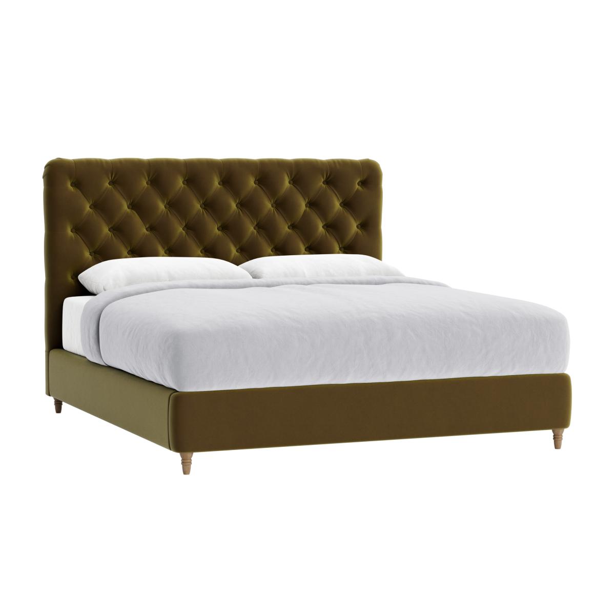 This bed's grandeur comes from traditional buttons and keeping the headboard fabric slightly relaxed. Job done.