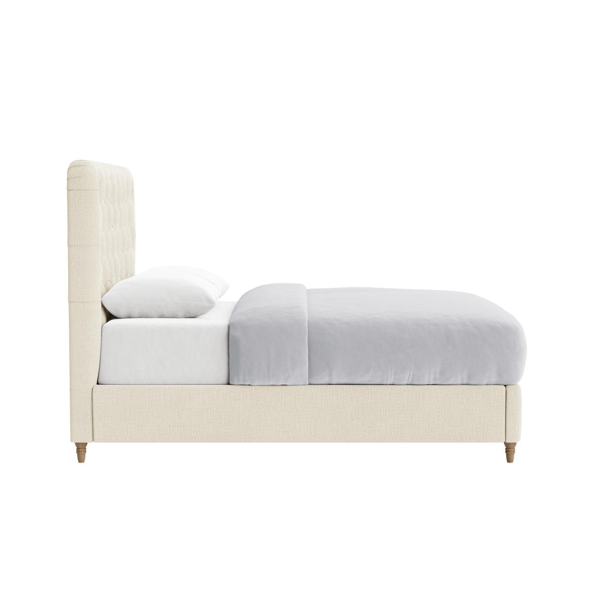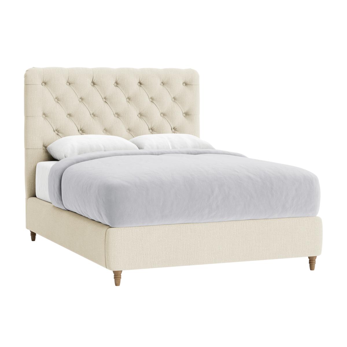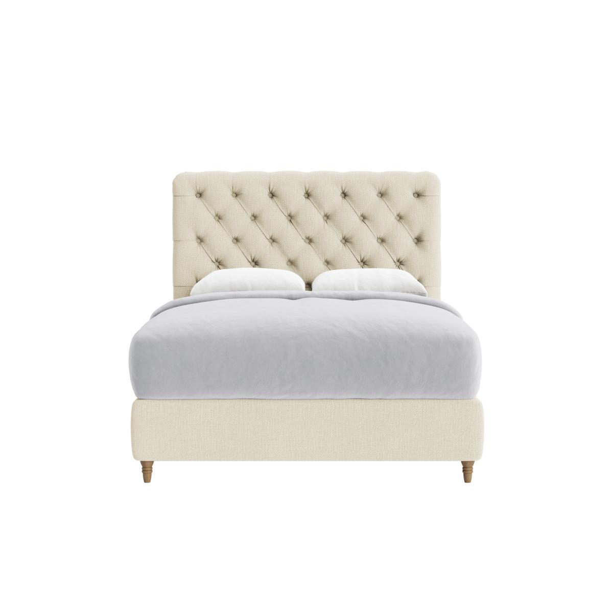 This bed's grandeur comes from traditional buttons and keeping the headboard fabric slightly relaxed. Job done.