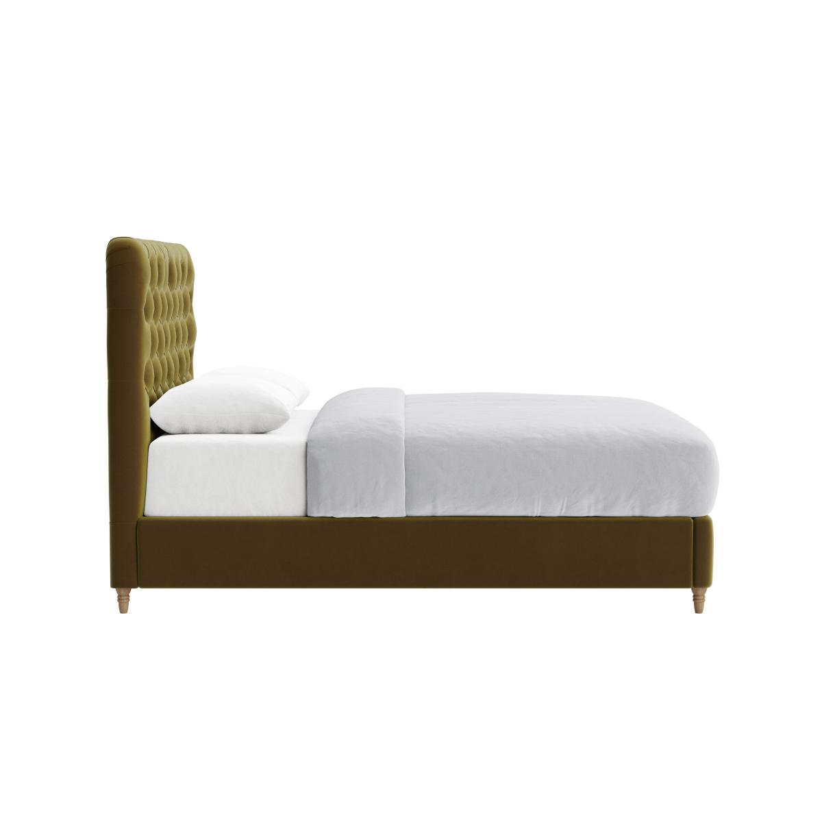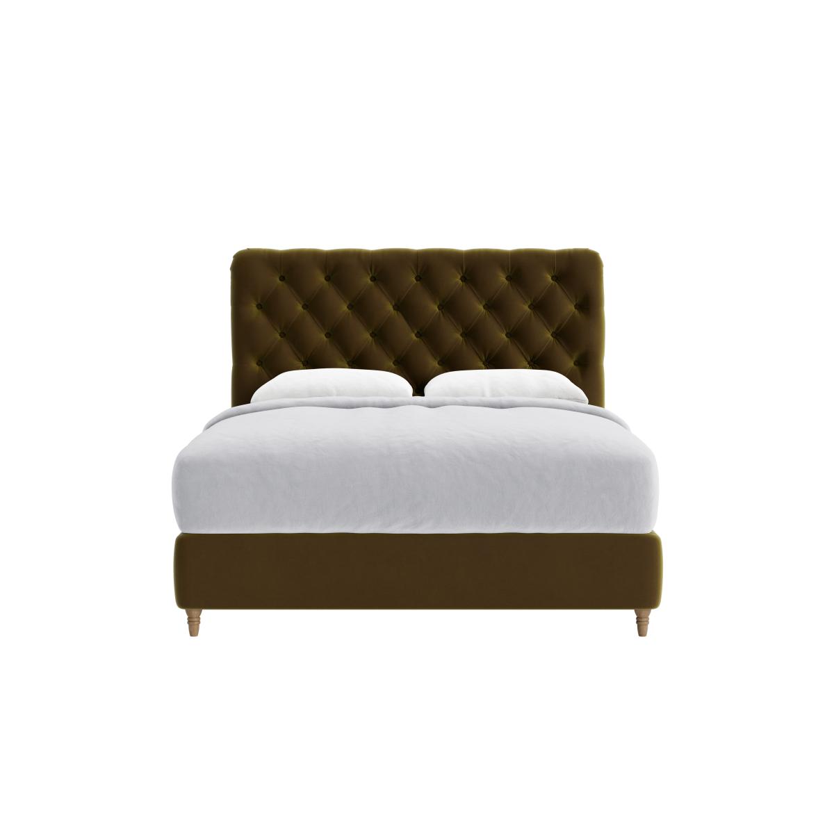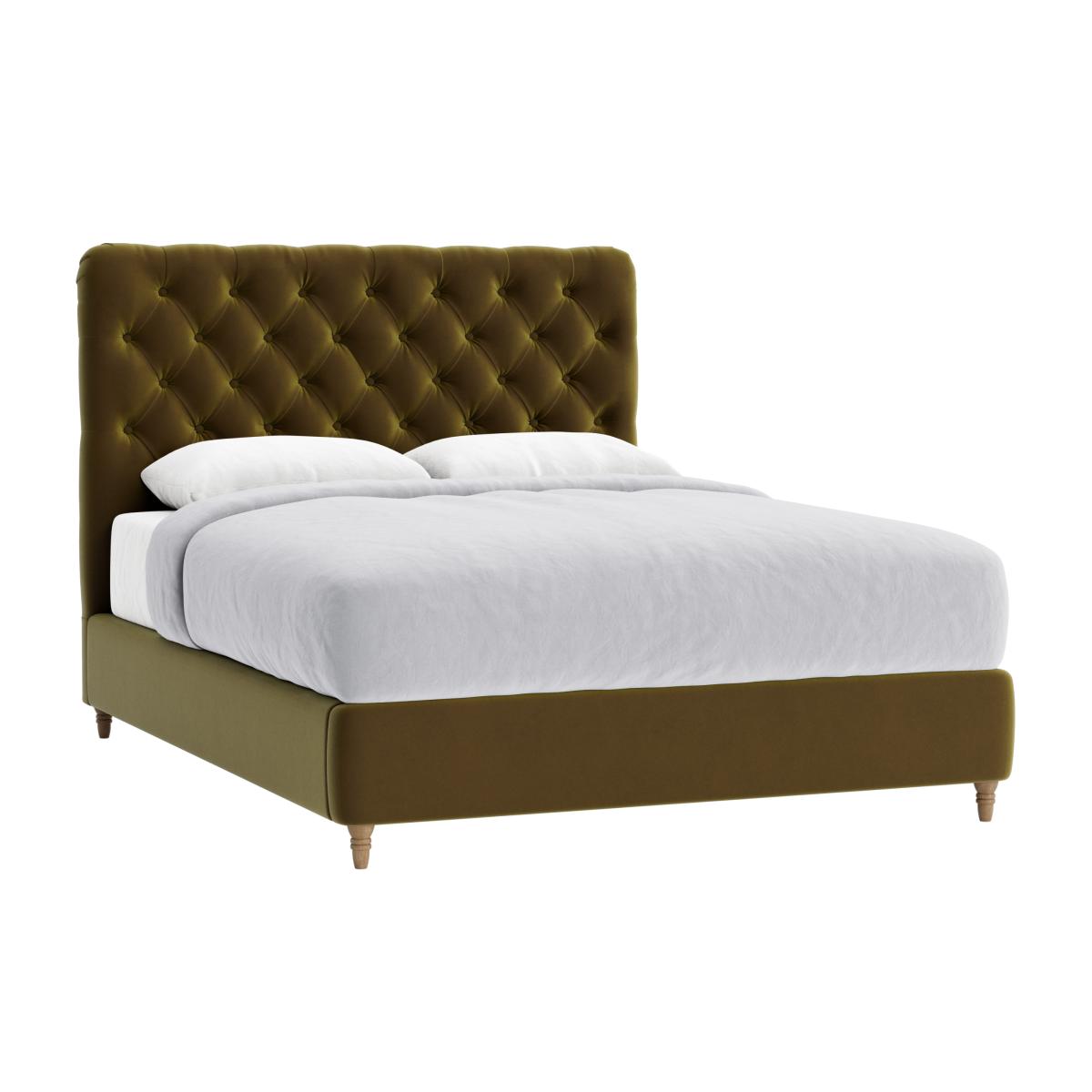 This bed's grandeur comes from traditional buttons and keeping the headboard fabric slightly relaxed. Job done.