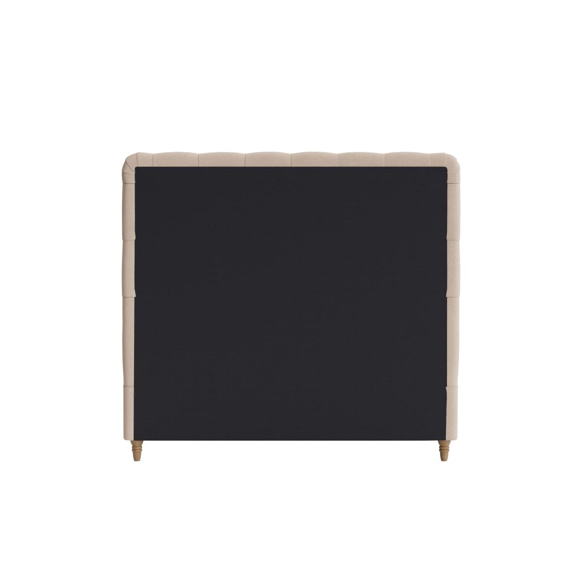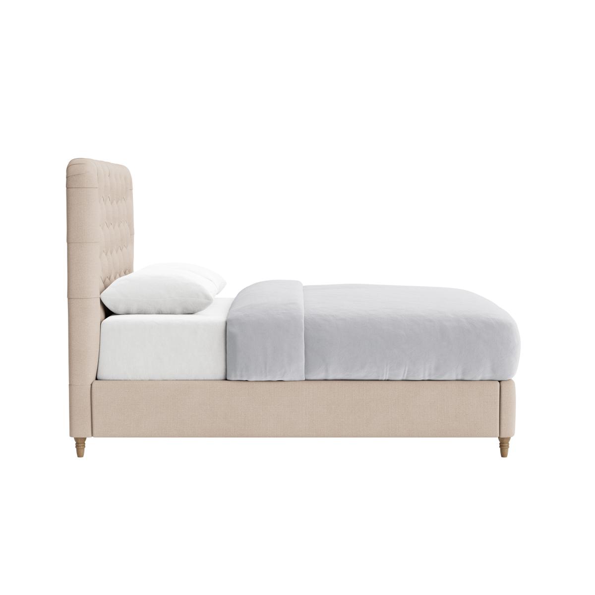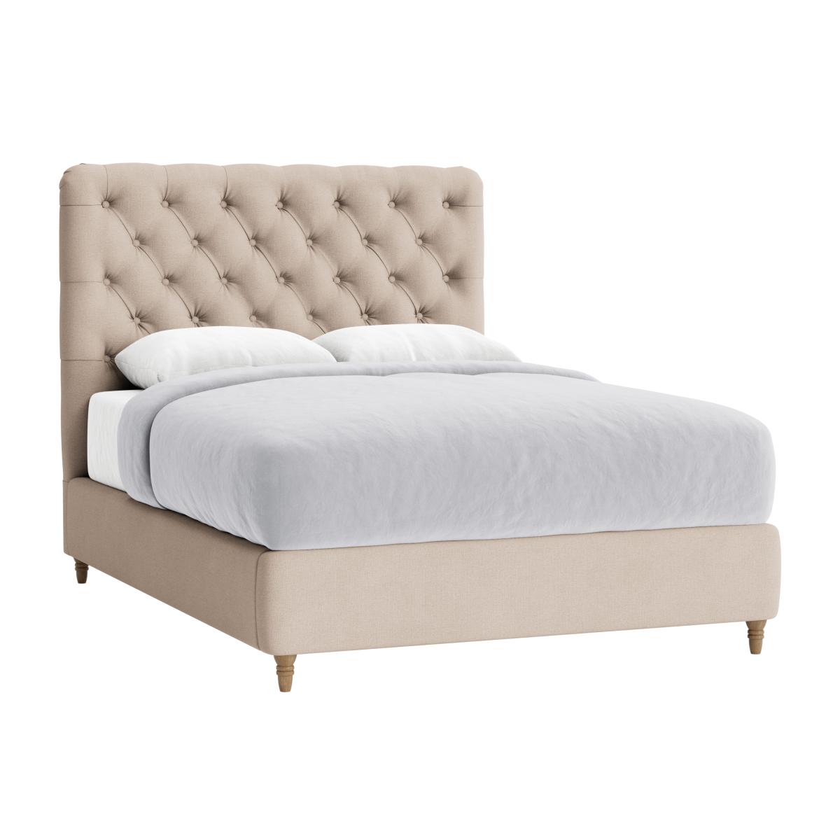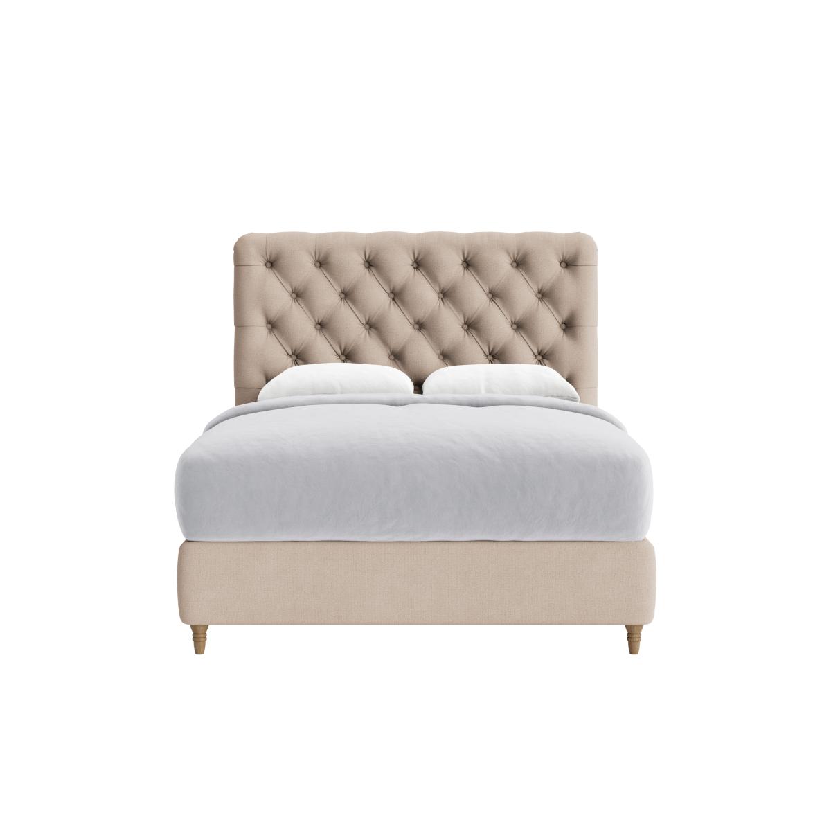 This bed's grandeur comes from traditional buttons and keeping the headboard fabric slightly relaxed. Job done.