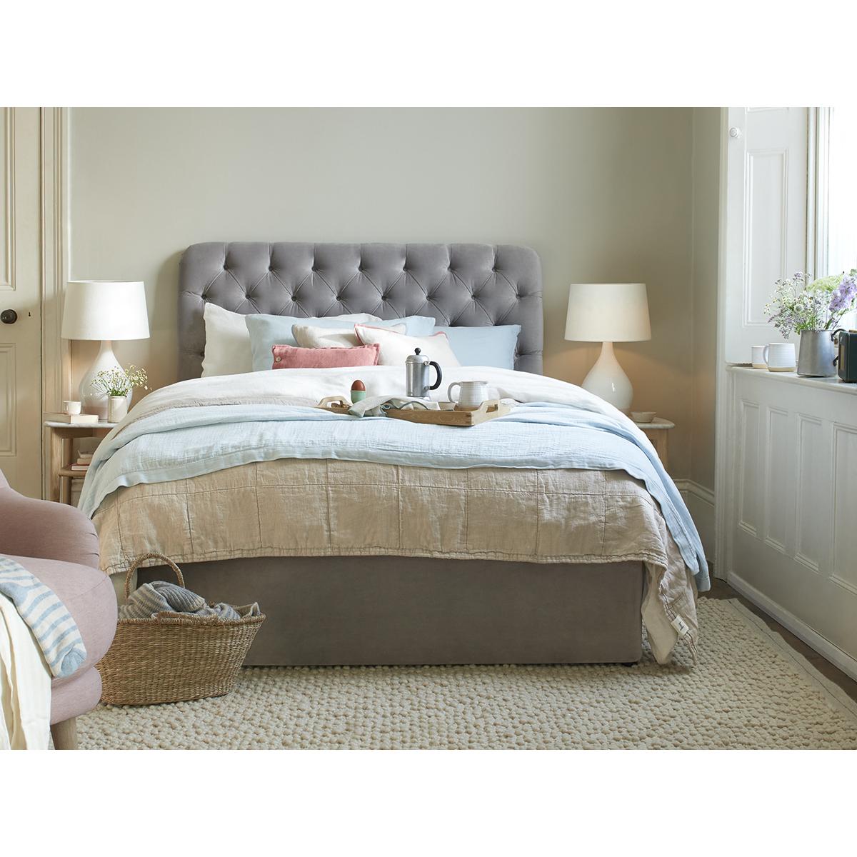 A lovely button back headboard with extra squish for that fresh from the oven feeling.