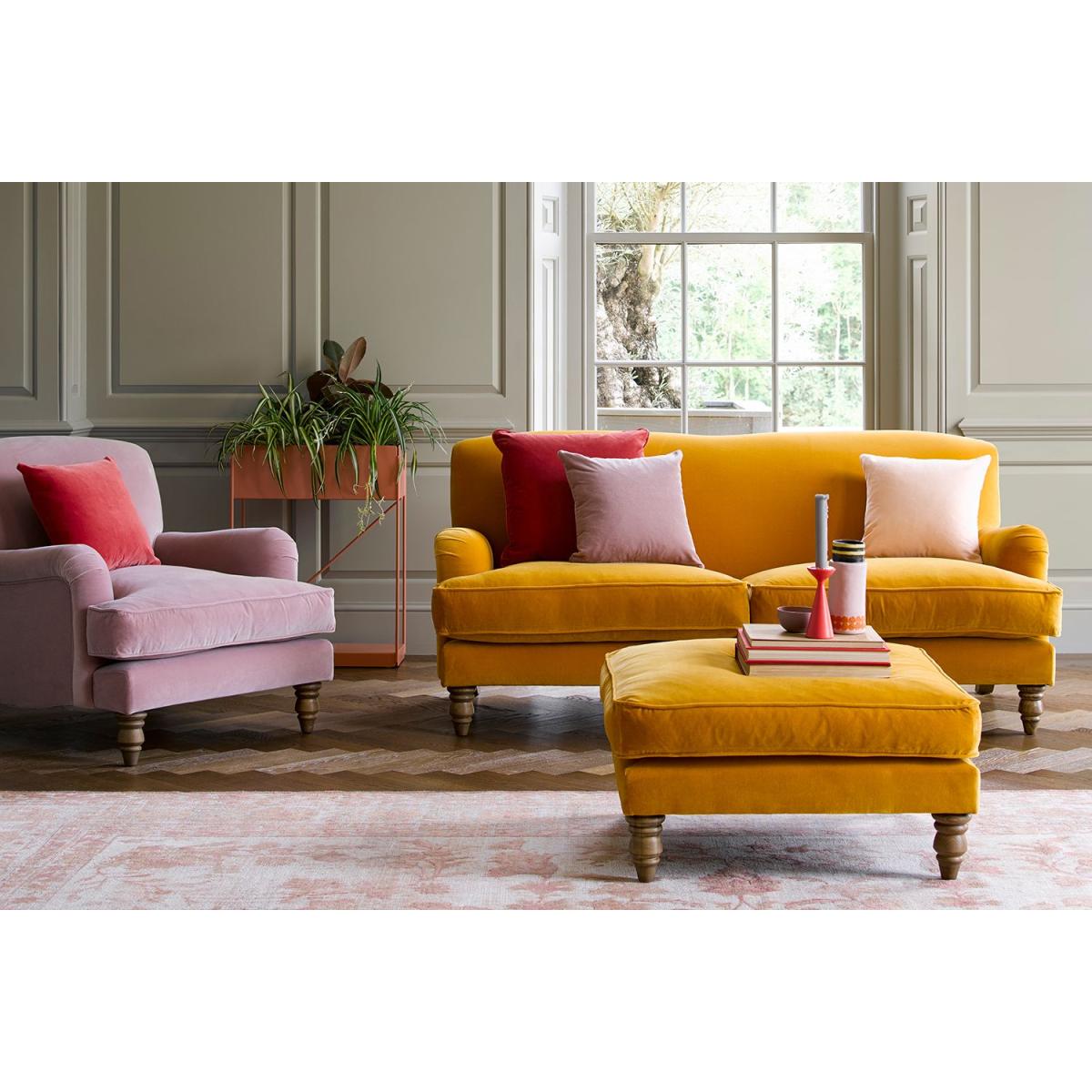 I really like this sofa because its bold pomegranate velvet instantly adds colour and texture to any living space. It works particularly well in eclectic, vintage-inspired or modern interiors when you want a statement piece. The seat's generous proportions offer comfort, making it ideal for family rooms or cosy sitting areas. For styling, try pairing it with neutral-toned throws and cushions to let the velvet pop, or mix with patterned fabrics for a curated look. Practical tips include placing it against a plain wall to highlight its colour and texture, and pairing it with a contrasting rug or coffee table for balanced visual interest. Its classic yet contemporary design makes it a versatile choice for adding personality to your home.