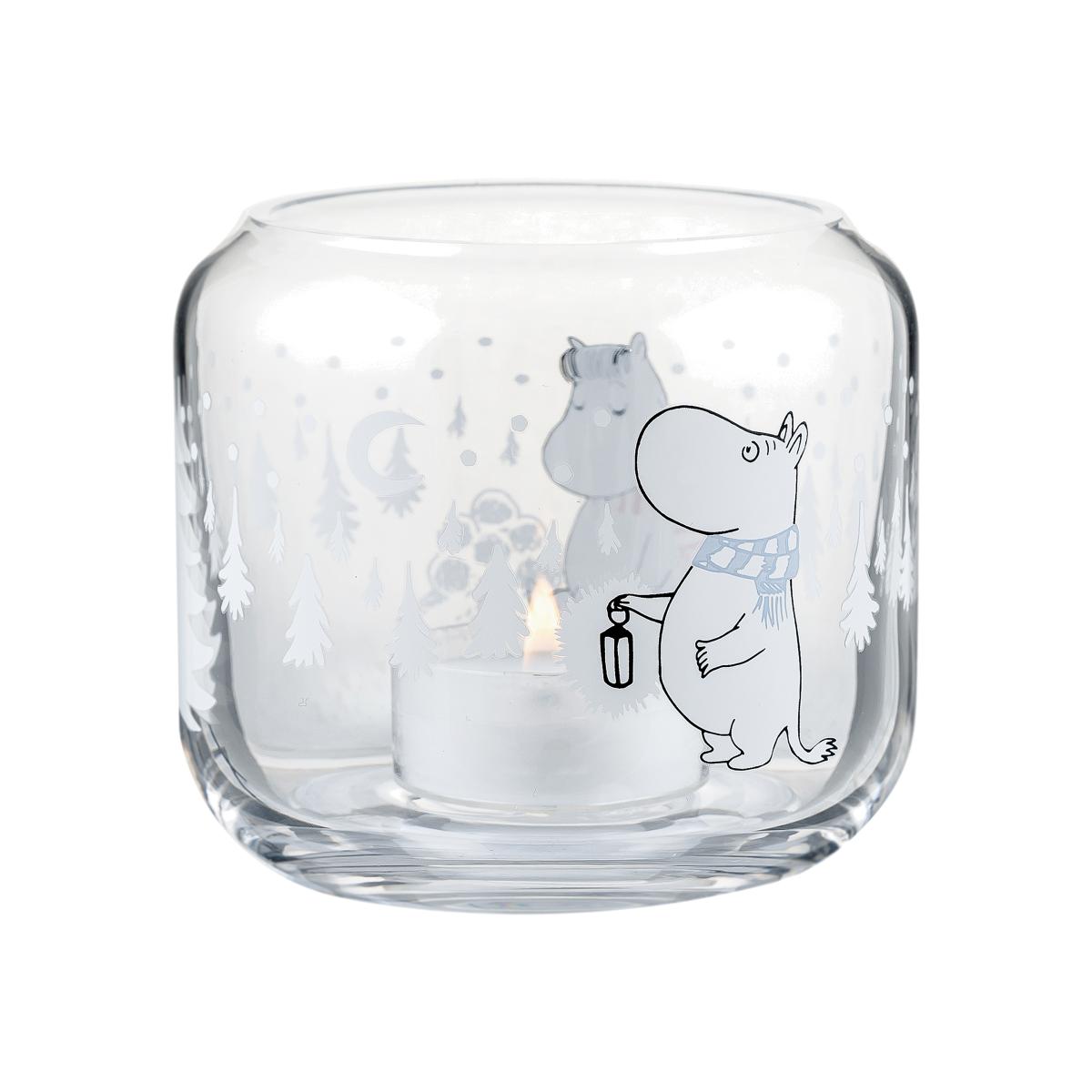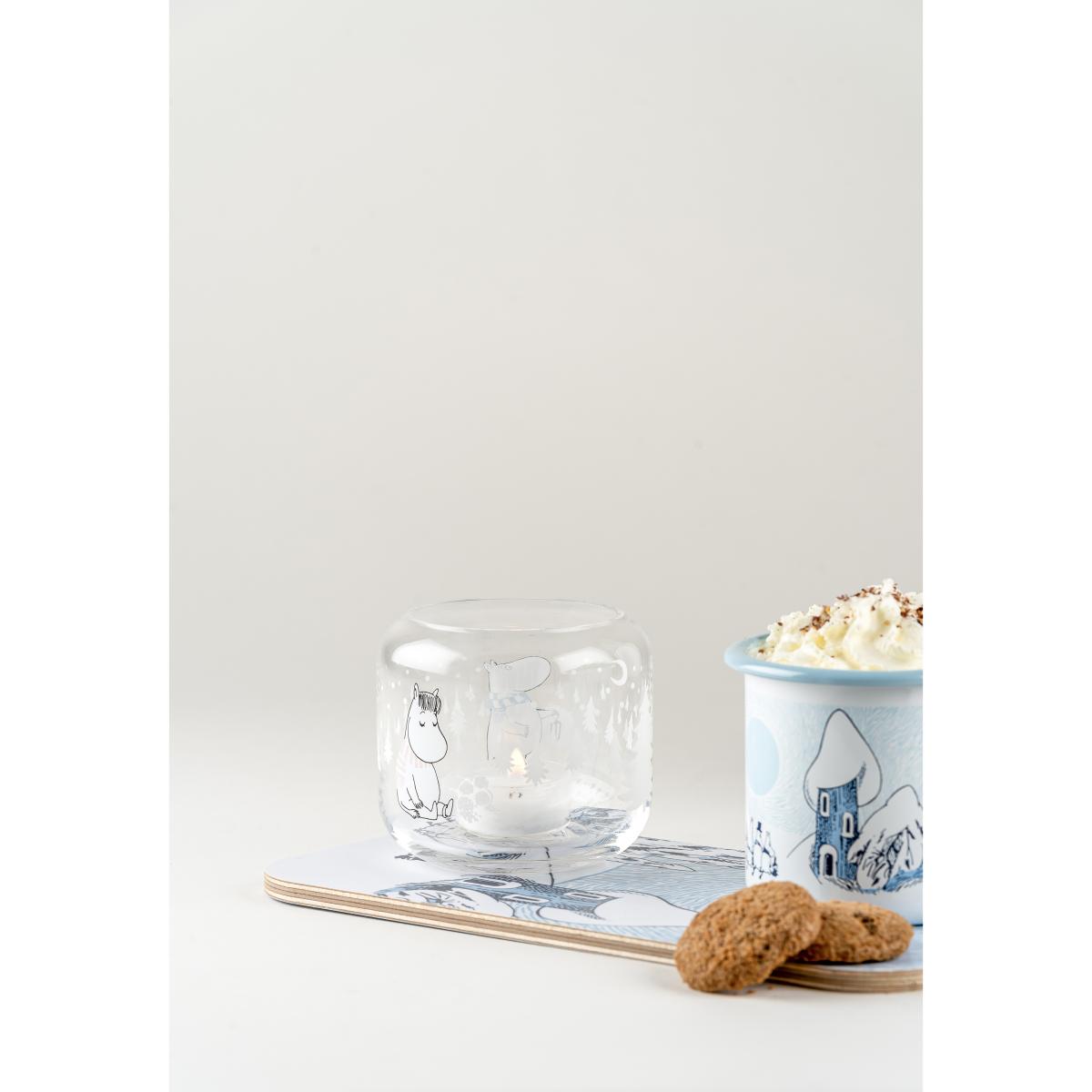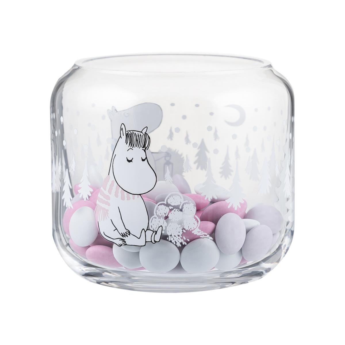 Snowfall lantern Ø9 cm from Finnish Muurla has a winter design depicting Moomin and Snork maiden surrounded by trees and snow. The small glass container can be used as a lantern or as a jar for nuts and adds a lovely element to the kitchen or living room.