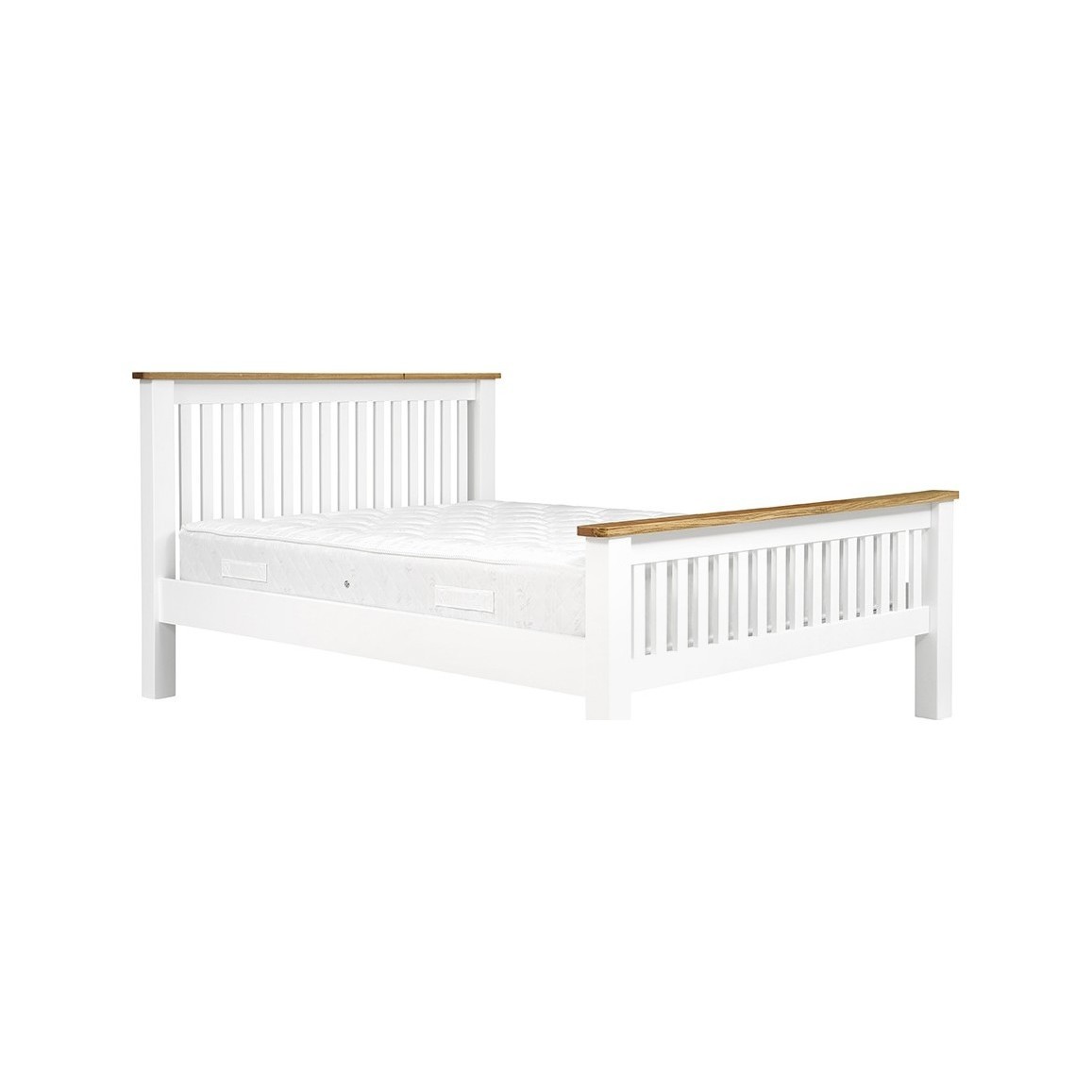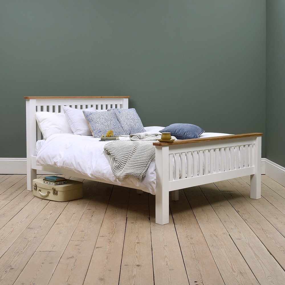 Perfect for long lie-ins this stunning king size bed will make a magnificent centrepiece for an master bedroom. Its clean, contemporary lines will complement any decor style and its brilliant white paint finish is contrasted perfectly by the oak and oak veneer tops on the slatted head and footboards.