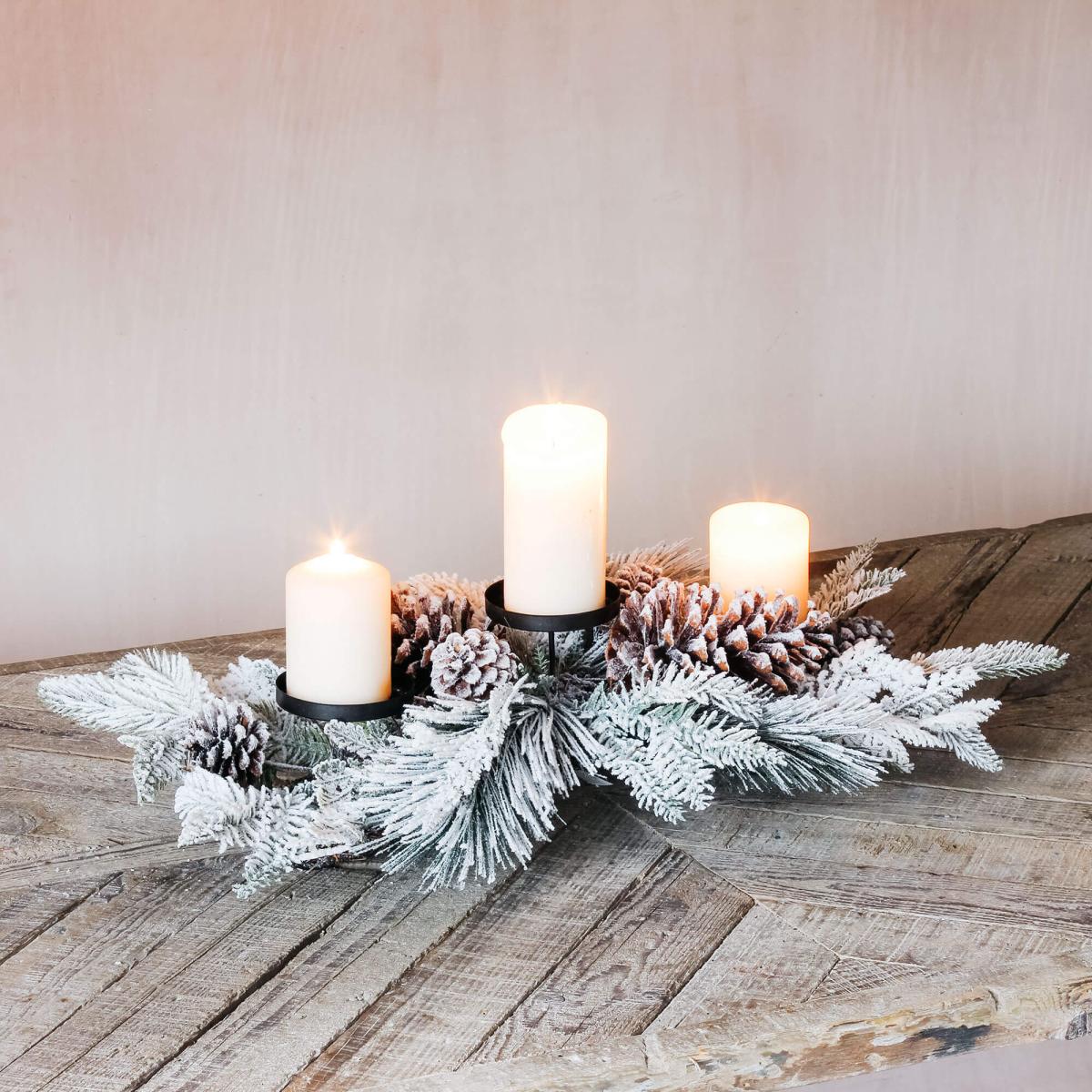 For candlelit evenings in snowy cabins, pine cones and fir tree stems add a wintry touch to this three tiered candle holder. H16 x L60 x W40cm. Made of plastic, polyester, wire and natural pinecones. Suitable for three candles up to 9cm each. Due to the nature of the design, the exact colour and finish may vary.