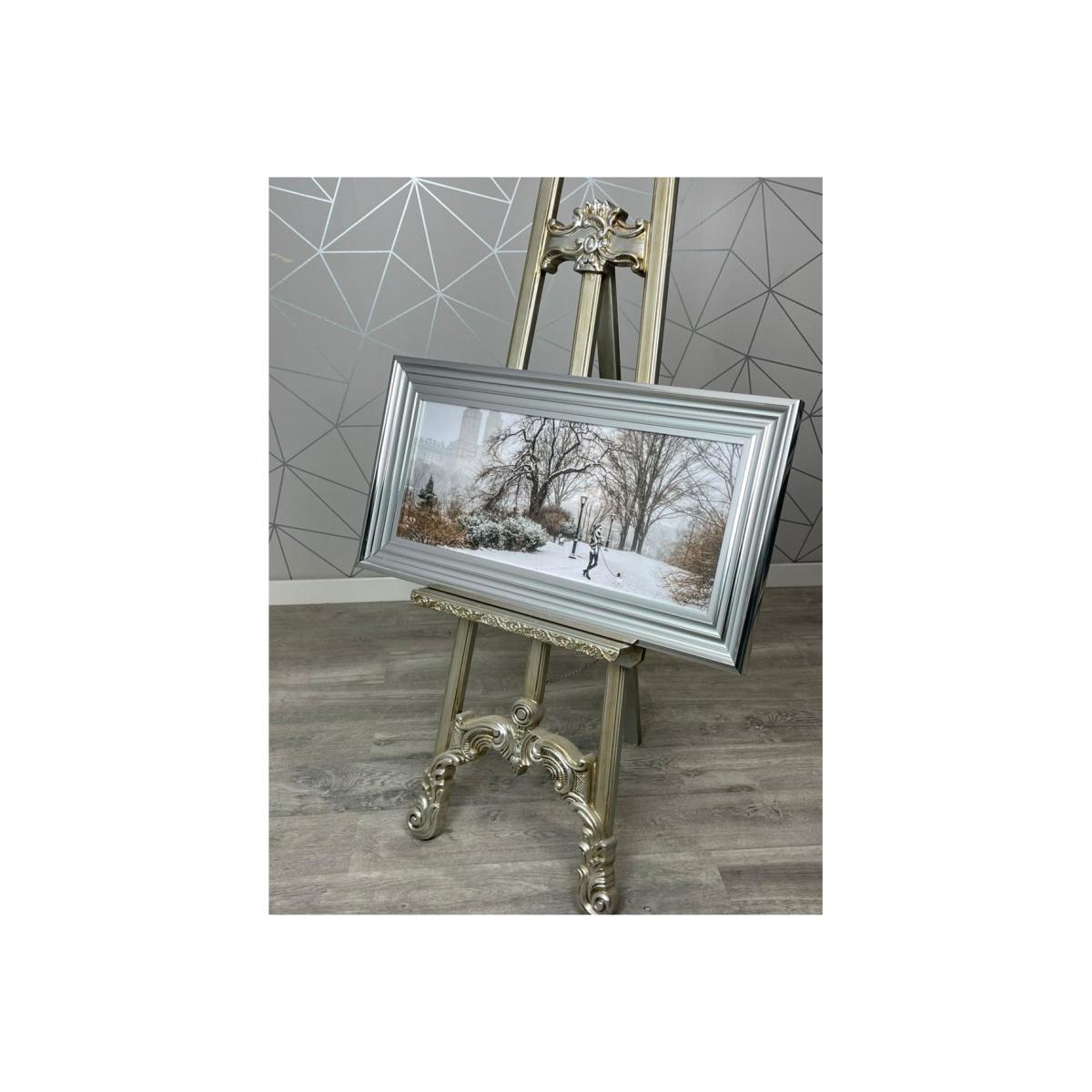Scenic winter walk featuring bevelled silver frame. This piece of art showcases a scenic winter day in the park. Paired with a contemporary wooden silver frame, this wall art will compliment both contemporary and traditional interiors,.