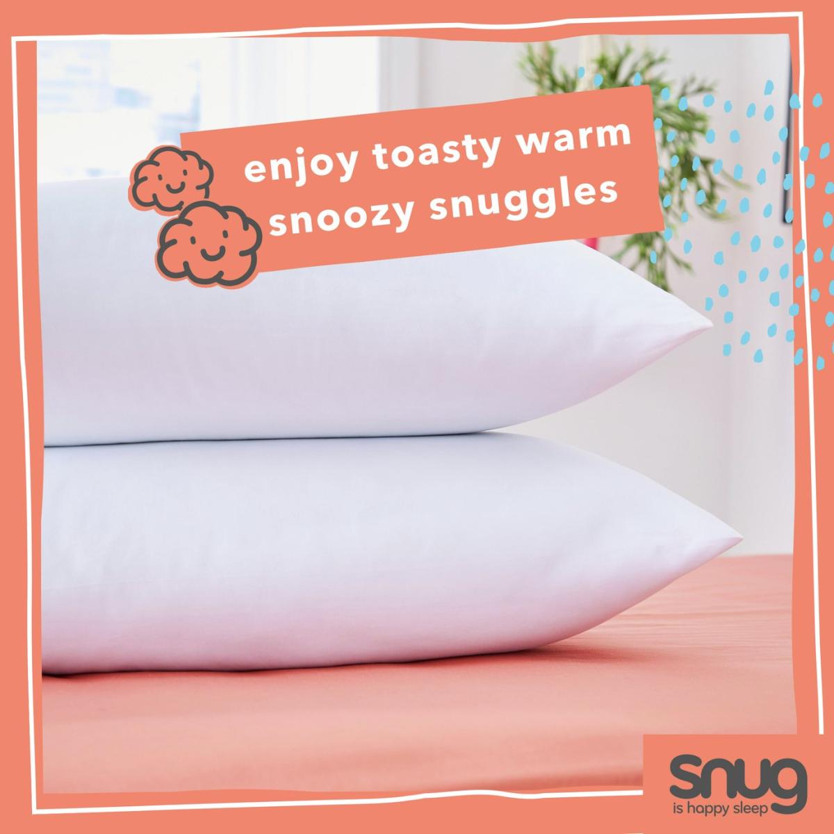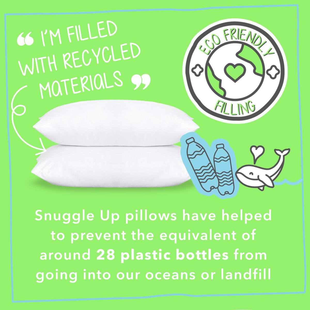 Snug Snuggle Up pillows are generously filled with a high loft to make them extra snuggly! We've crafted them to a medium/firm support so people who sleep in all positions can enjoy them. We've got you; your bedding is filled with recycled materials giving our lovely planet a helping hand. We care so you can be carefree, the squidgy fibres were once plastic bottles that have enjoyed a wonderful makeover. Our packaging is made from 30% recycled materials and can be fully recycled. Use one pillow for soft-medium comfort or use both for more support. Pack quantity: 2. Cover made from 100% microfibre. Filling made from 100% polyester. Medium pillow. Suitable for back sleepers. Size L48, W73cm. 1kg. Machine washable. Suitable for tumble drying. Non-allergenic. Manufacturer's 2 year guarantee.