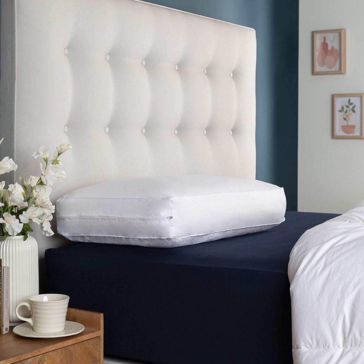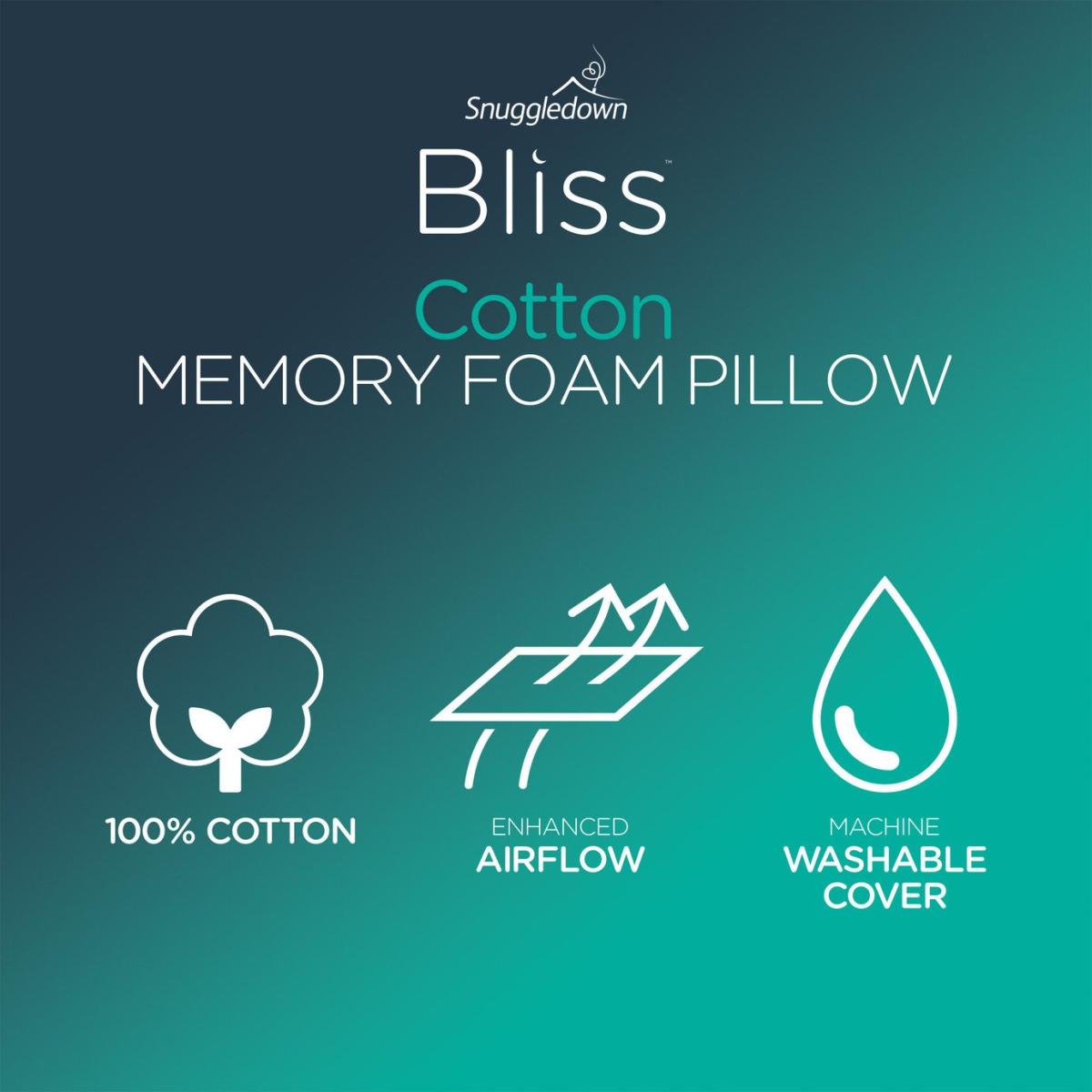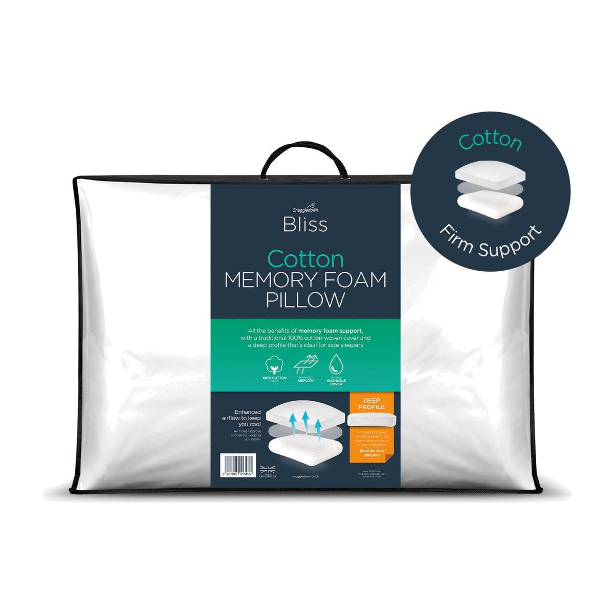 The Snuggledown Bliss Cotton Touch Memory Foam Firm Support Pillow is beautifully soft and comfortable. The soft touch 233 thread count cotton premium cover adds a touch of luxury. The ventilated memory foam core reduces heat build-up keeping you cool, comfortable and supported all night long. It naturally adjusts to the heat of your body and shapes to the contours of your head and neck to ensure your spine is aligned as you sleep. This means you can relax into a great night's sleep and wake up free from aches and pains. With a deep profile and firm support, you will benefit greatly from this pillow if you're a side sleeper. The shape eases pressure on your shoulders and gently encourages correct spinal alignment and posture. Easycare, the cover can be zipped off and can be machine washed and tumble dried. Pack quantity: 1. Cover made from 100% cotton percale. Filling made from 100% memory foam. Memory foam. Firm pillow. Suitable for side sleepers. Size L38, W64cm. Machine washable covers. Suitable for tumble drying. Non-allergenic.