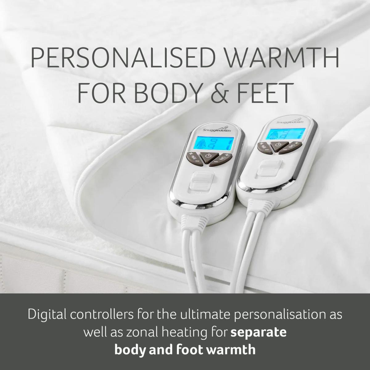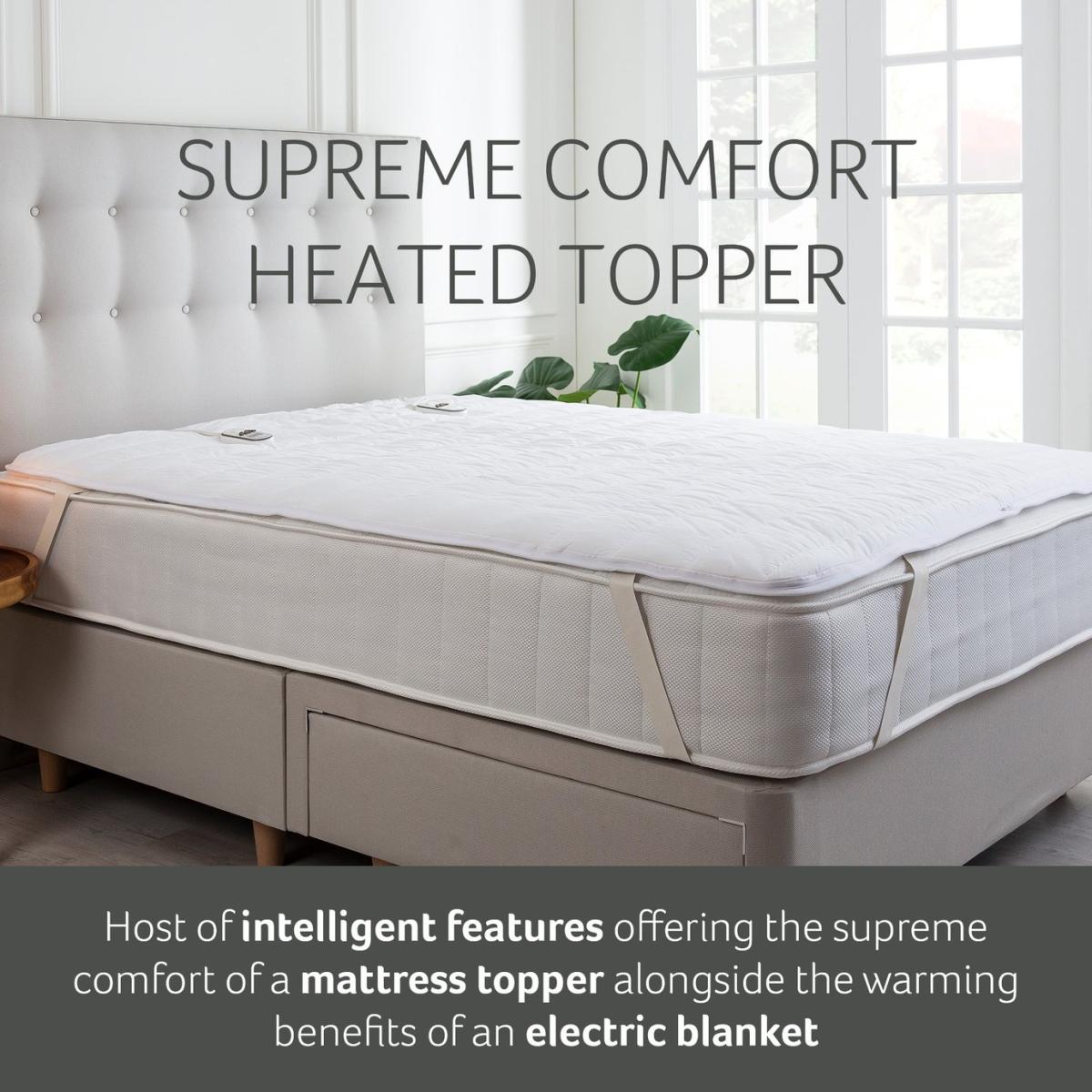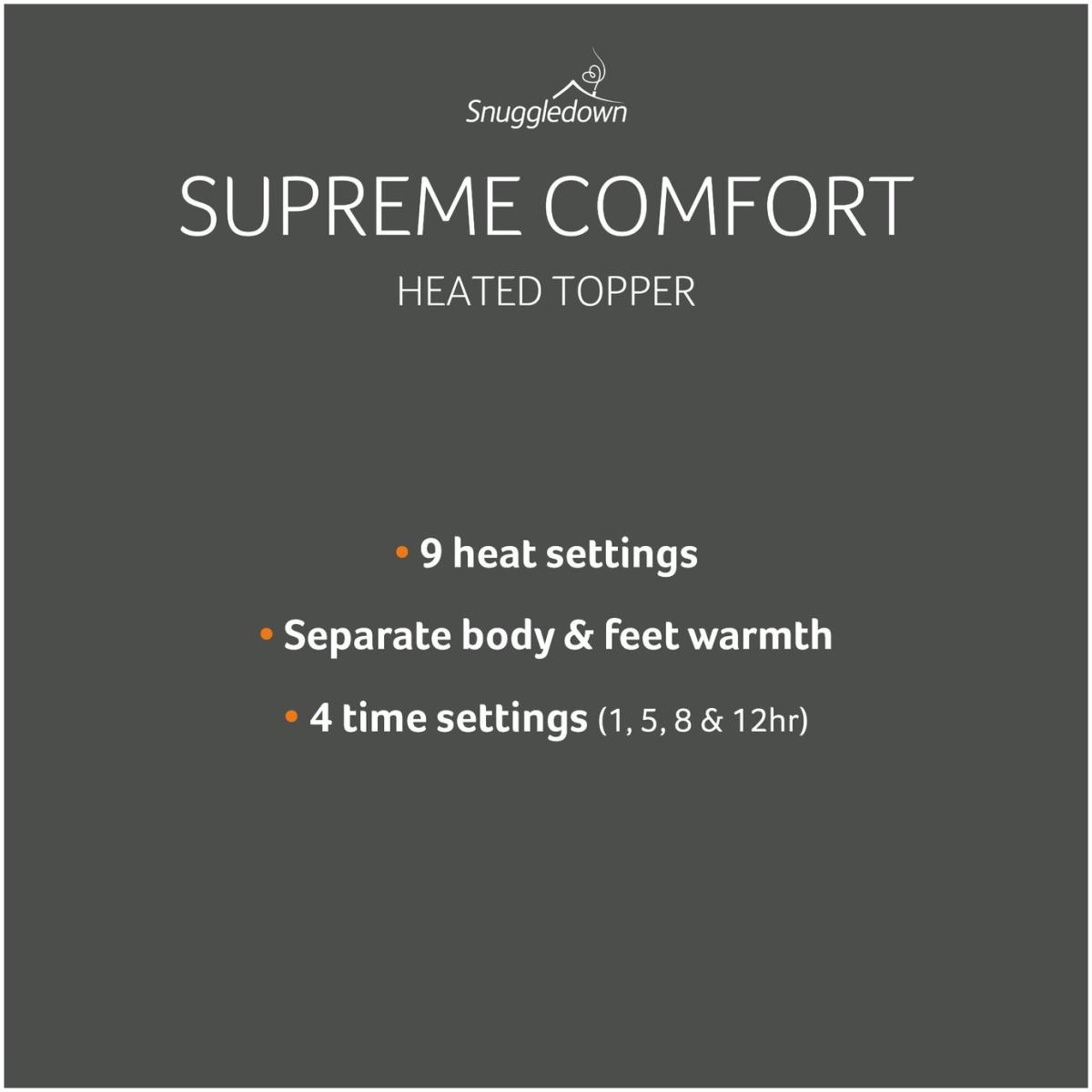 The Snuggledown Intelligent Warmth Supreme Heated Topper offers all the benefits of an electric blanket with the comfort of a topper. The 3cm luxury cotton topper offers maximum comfort. The easy-use dual detachable controller has 9 heat settings and four time settings 1hr, 5hr, 8hrs, 12hrs. The Climate Comfort technology allows you to set a separate temperature for body and feet. Whats more the product is Easy Care it can machine washed, tumble dried and comes with reinforced easy-fit elasticated straps suitable for a mattress depth of 35cm. Features: Made from cotton. Corner straps. Dual digital detachable controls. 9 heat settings. Timer with auto shut off. Suitable for all night use. Extra foot warmth. Multi-zone heating areas - allows the heat setting to be different on each quarter of the bed. Low energy consumption. Safety features: Overheat protection. BEAB approved - safety verified by an independent third party. General information: Reusable storage bag. Size W150, L200cm - suitable for king size bed. Machine washable and suitable for tumble drying. 2 year manufacturer's guarantee.