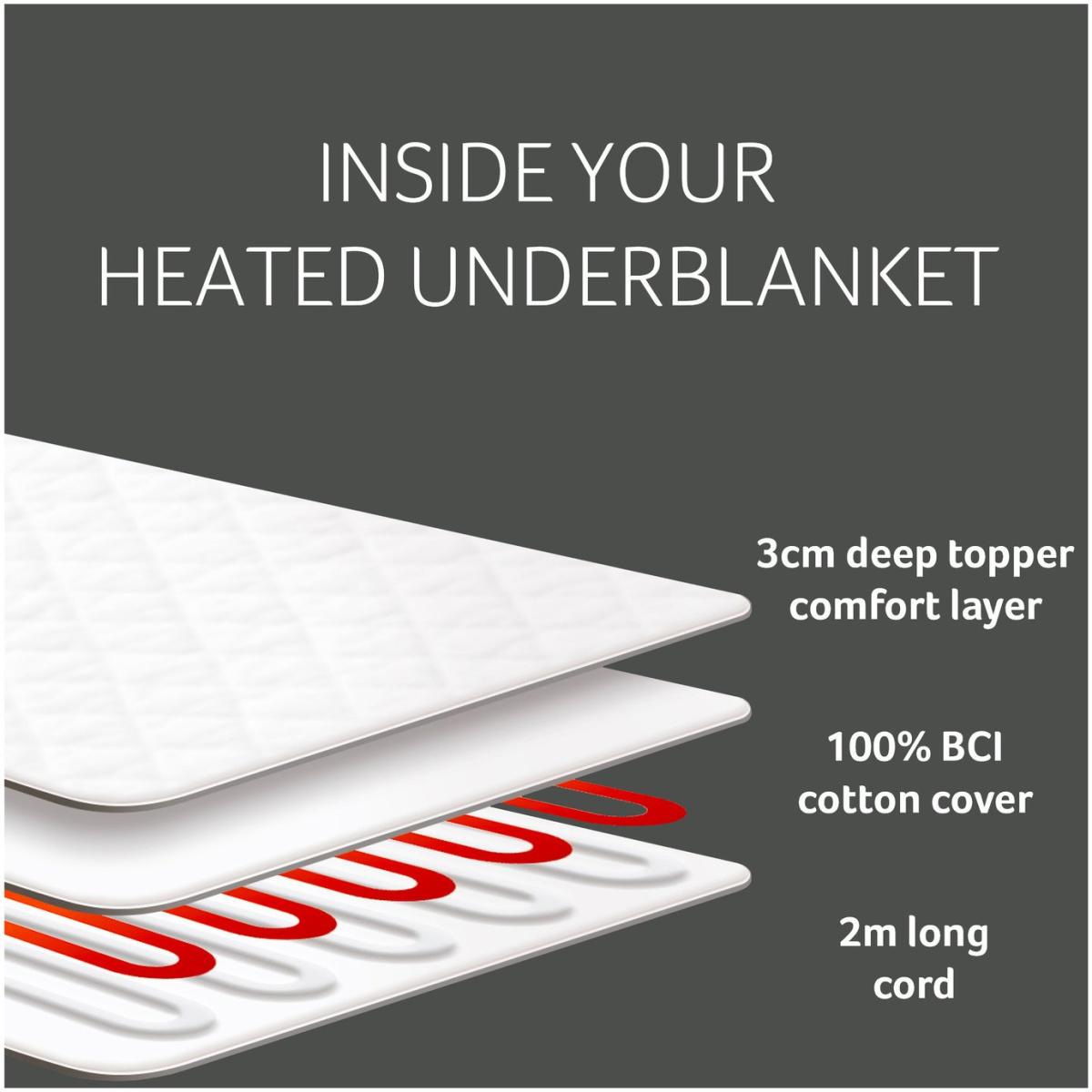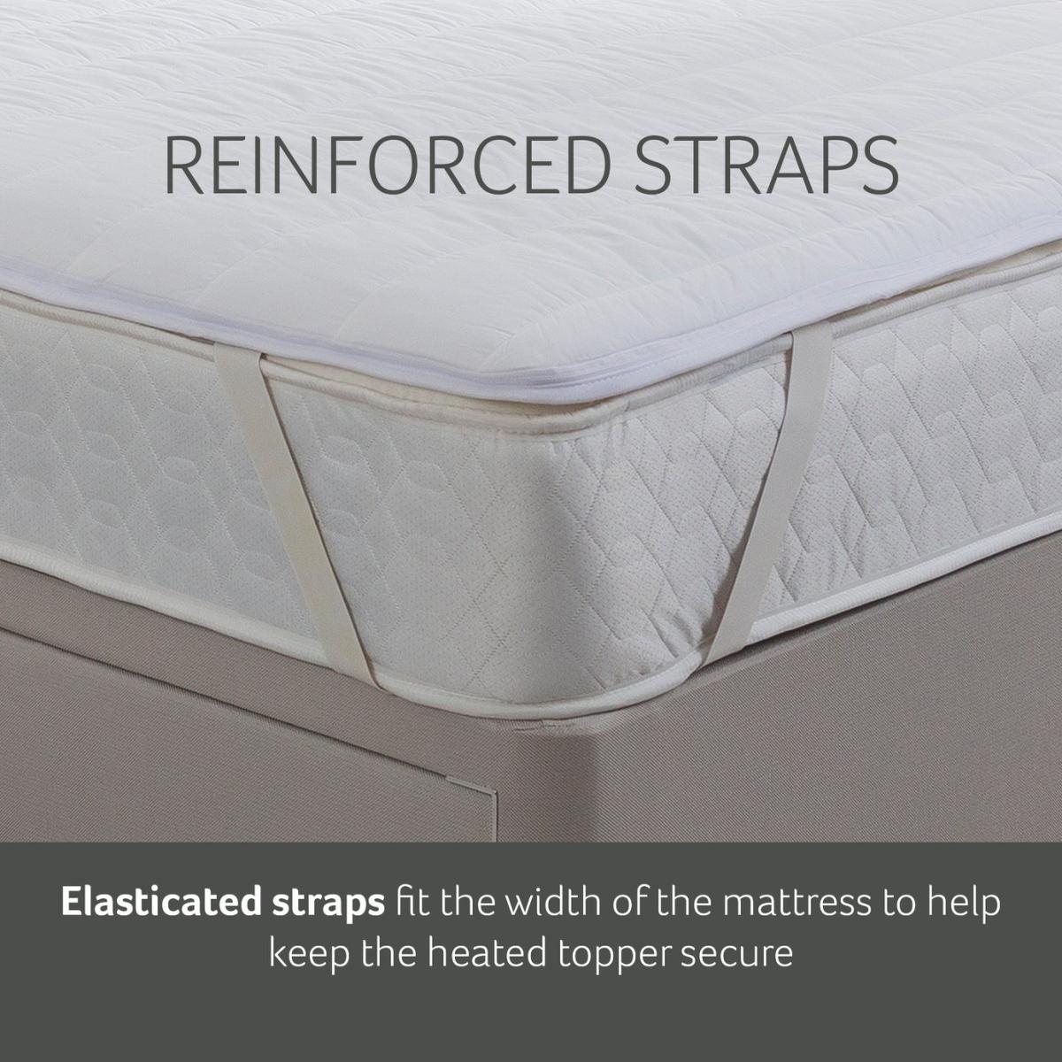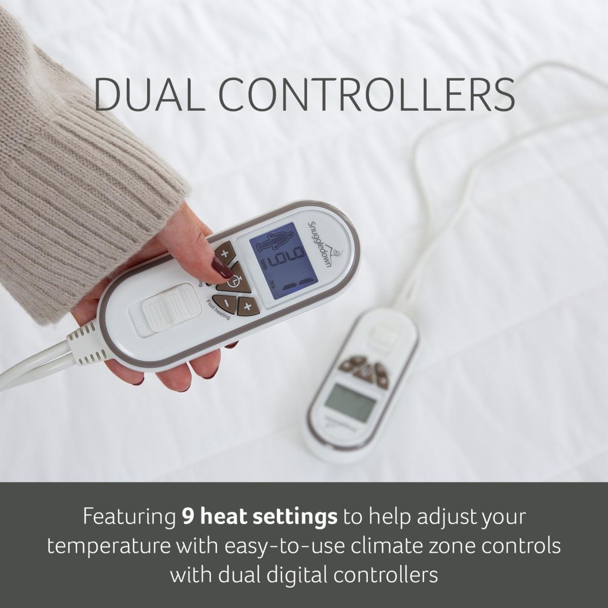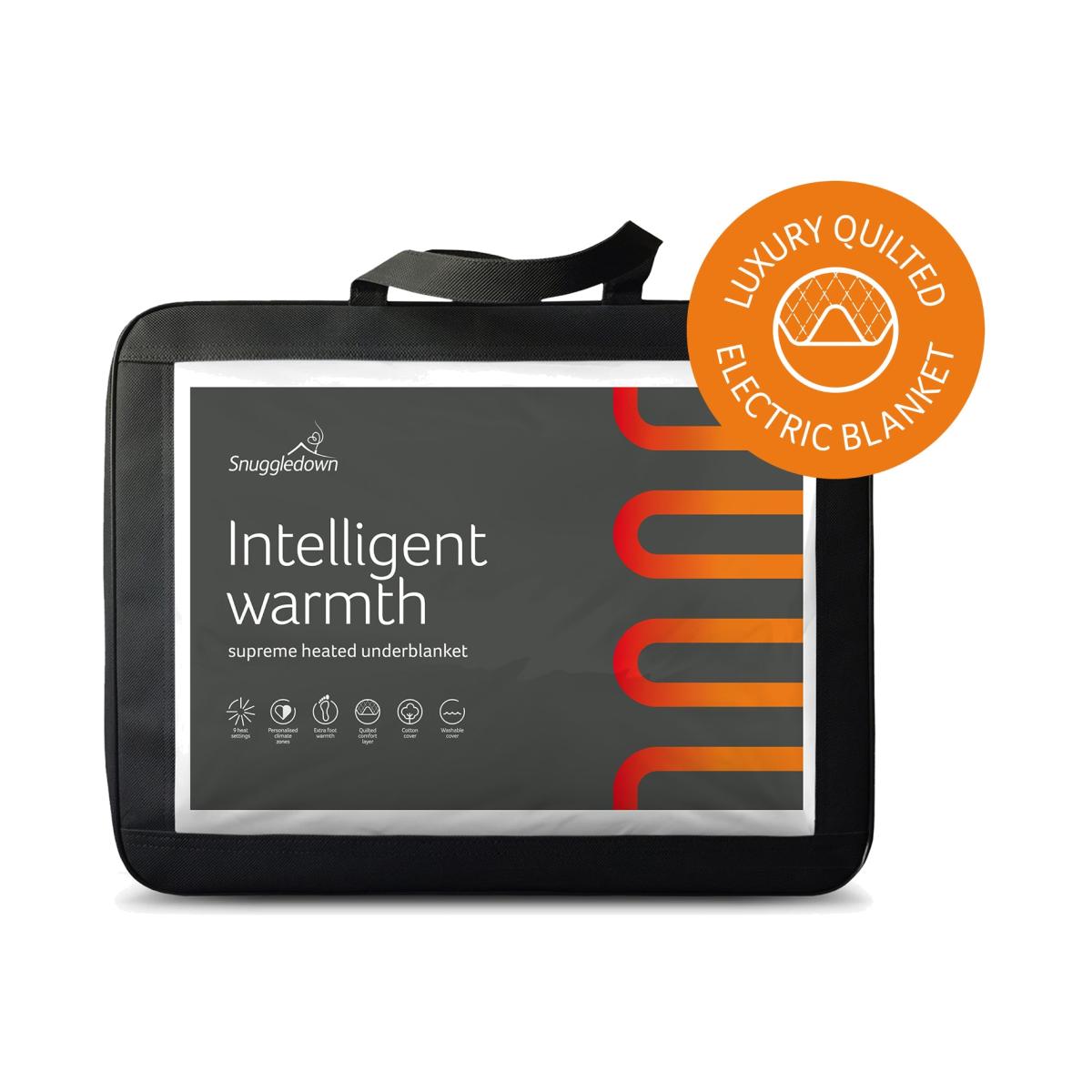 The Snuggledown Intelligent Warmth Supreme Heated Topper offers all the benefits of an electric blanket with the comfort of a topper. The 3cm luxury cotton topper offers maximum comfort. The easy-use dual detachable controller has 9 heat settings and four time settings 1hr, 5hr, 8hrs, 12hrs. The Climate Comfort technology allows you to set a separate temperature for body and feet. Whats more the product is Easy Care it can machine washed, tumble dried and comes with reinforced easy-fit elasticated straps suitable for a mattress depth of 35cm. Features: Made from cotton. Corner straps. Dual digital detachable controls. 9 heat settings. Timer with auto shut off. Suitable for all night use. Extra foot warmth. Multi-zone heating areas - allows the heat setting to be different on each quarter of the bed. Low energy consumption. Safety features: Overheat protection. BEAB approved - safety verified by an independent third party. General information: Reusable storage bag. Size W150, L200cm - suitable for king size bed. Machine washable and suitable for tumble drying. 2 year manufacturer's guarantee.