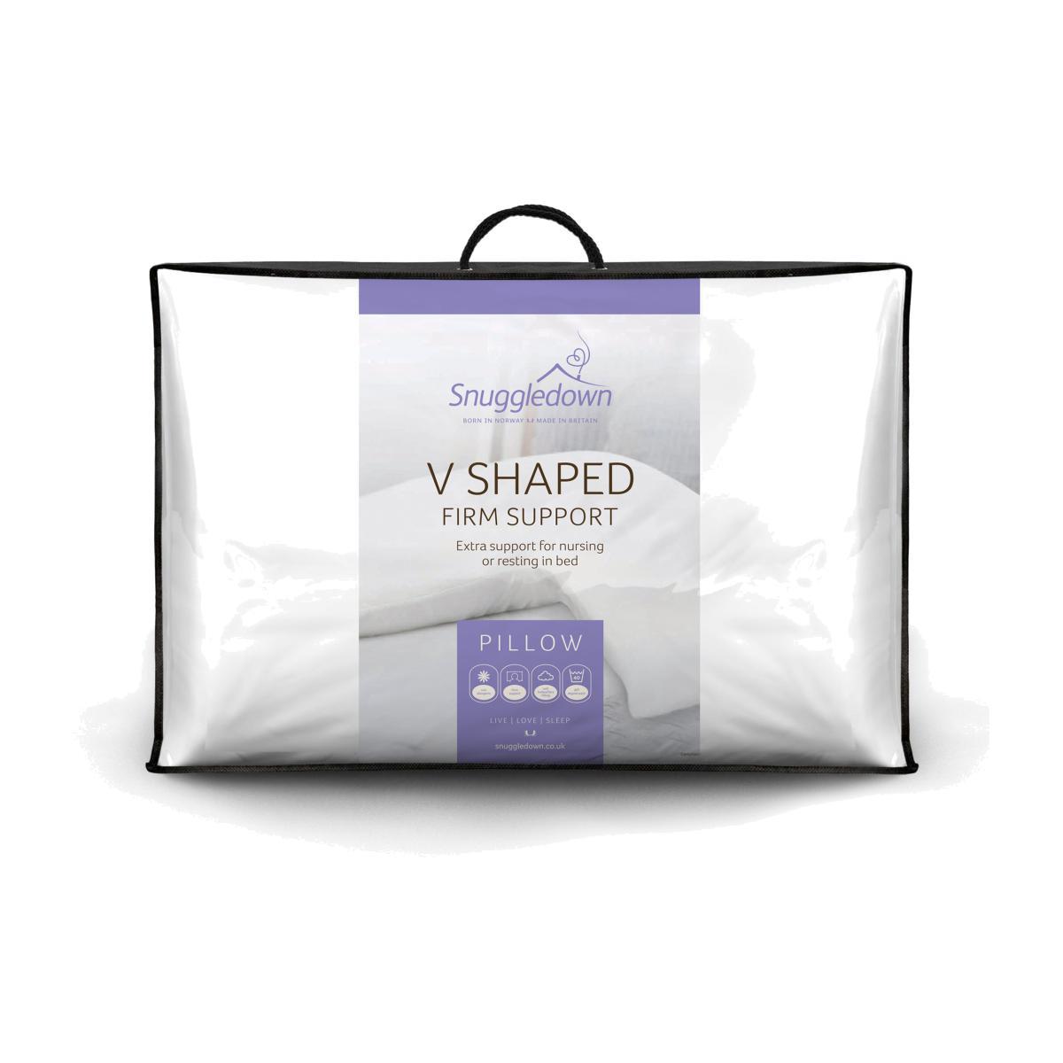 Providing extra support for nursing or resting in bed, Snuggledown's v-shaped pillow has a firm-support and non-allergenic properties, ideal for sufferers. Covered in a quality breathable cotton fabric which is machine washable for easy care, this pillow is filled with soft hollowfibre for ultimate comfort while you rest. Contains a blend of recycled fibre.