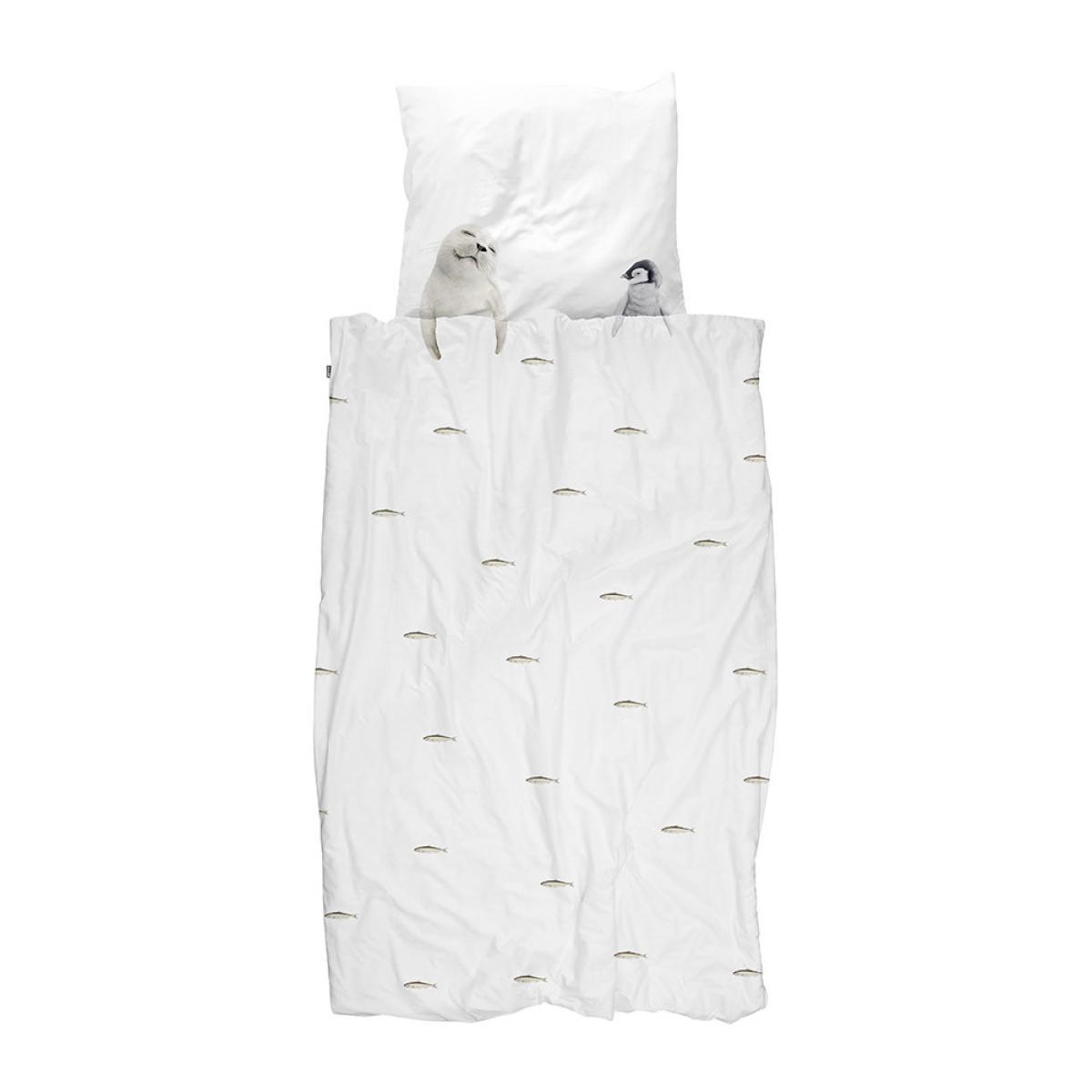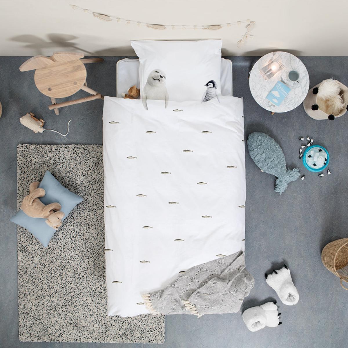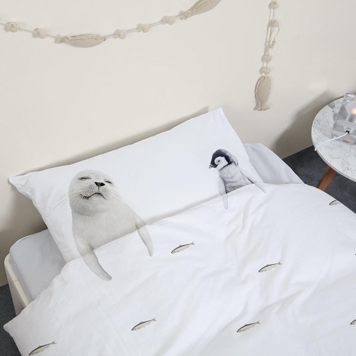 Enjoy a cool slumber party with this Arctic Friends duvet set from Snurk. Made from 100% cotton, this duvet set includes a pillowcase adorned with a sleeping baby seal and penguin and single duvet cover featuring a pattern of sardines. Unlike the arctic, this set is super cosy and will your little one and their new friends snuggled up all night long.