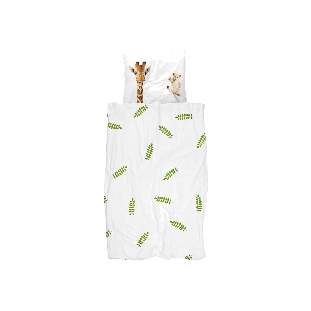 Add a touch of the wild to bedtime with this duvet cover set from Snurk. Perfect for animal lovers, this duvet set is printed with a photographic design featuring a giraffe, lion cub and leaves. On a fresh white background, it has been made in Portugal from 100% high-quality soft cotton.
