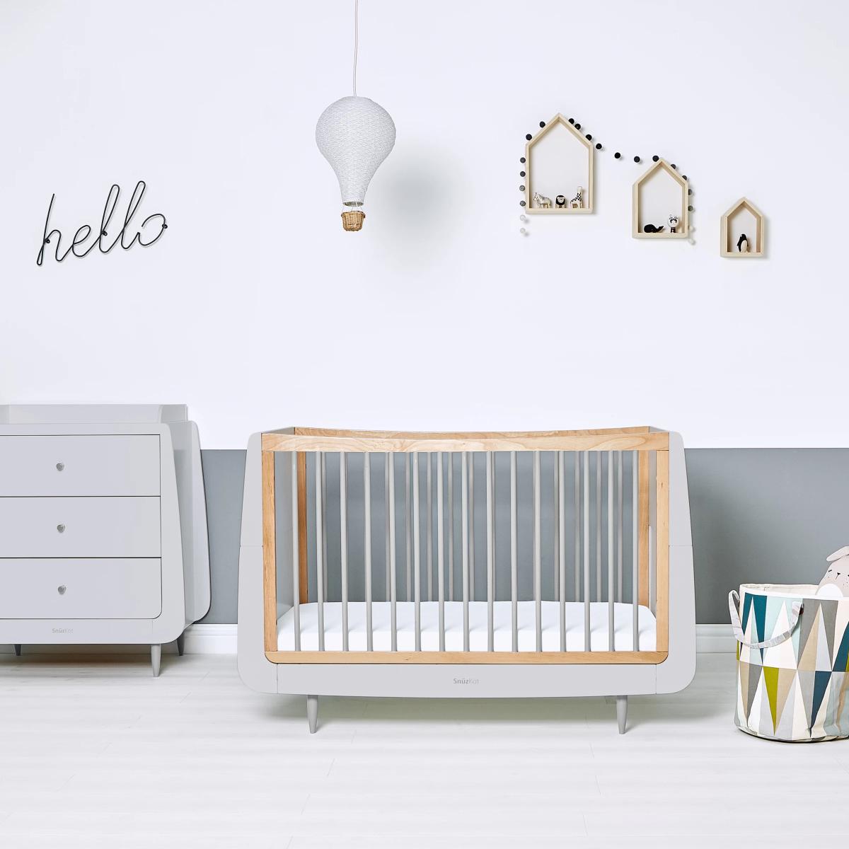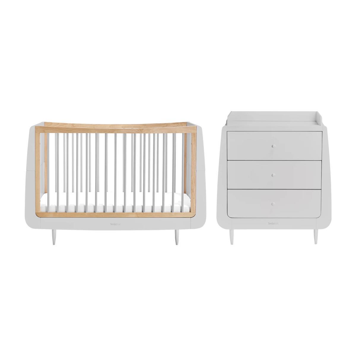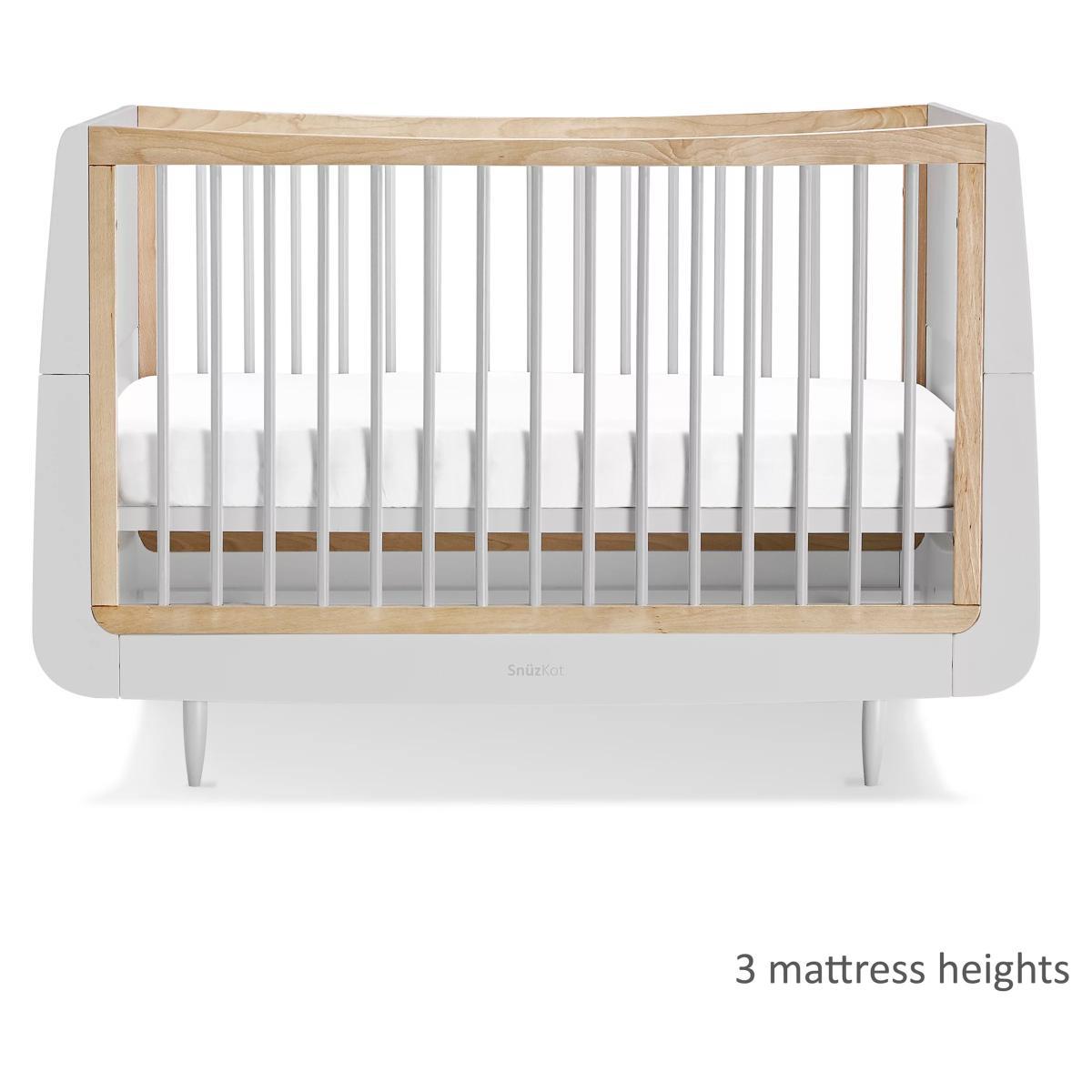 Create and customise your nursery with this beautiful Skandi Cotbed and Changing Unit from Snüz. Kot. It grows with your child from birth to approximately 4 years, and when used with the extension kit (sold separately), your child will have a comfy and cosy place to sleep until they're 10 years old. There are three mattress height settings for ease of access, and a low level bed which will help your toddler when getting in and out. Designed to last, every Snuz Kot is made using natural beech wood, without the use of MDF or veneer. The highest mattress position makes it easy to lift your newborn baby in and out, and as they grow and learn to sit and stand, the base can be lowered to help prevent them climbing out. The matching Skandi Changing Unit features three spacious drawers and a useful changing area with a removable frame, ideal for when baby becomes a toddler and they need a standalone dresser. Please note: The cot bed and changing unit comes flat packed in 8 boxes. Self-assembly required.