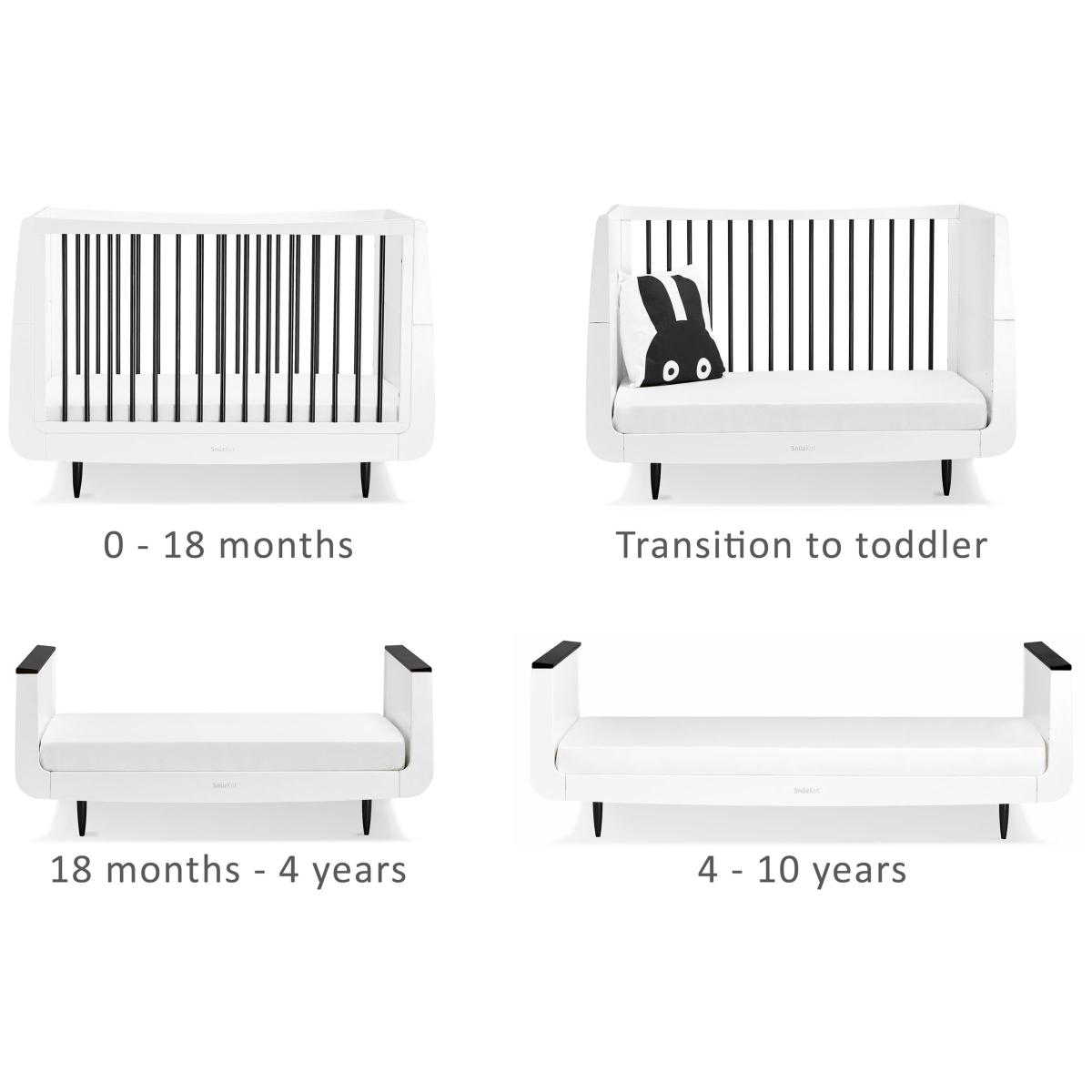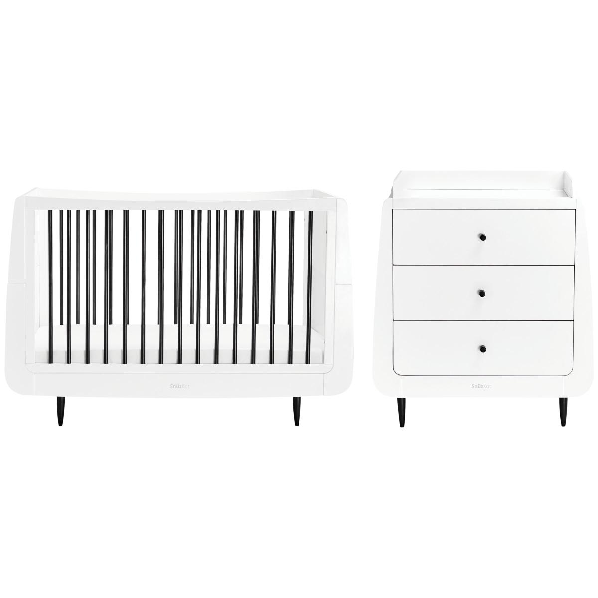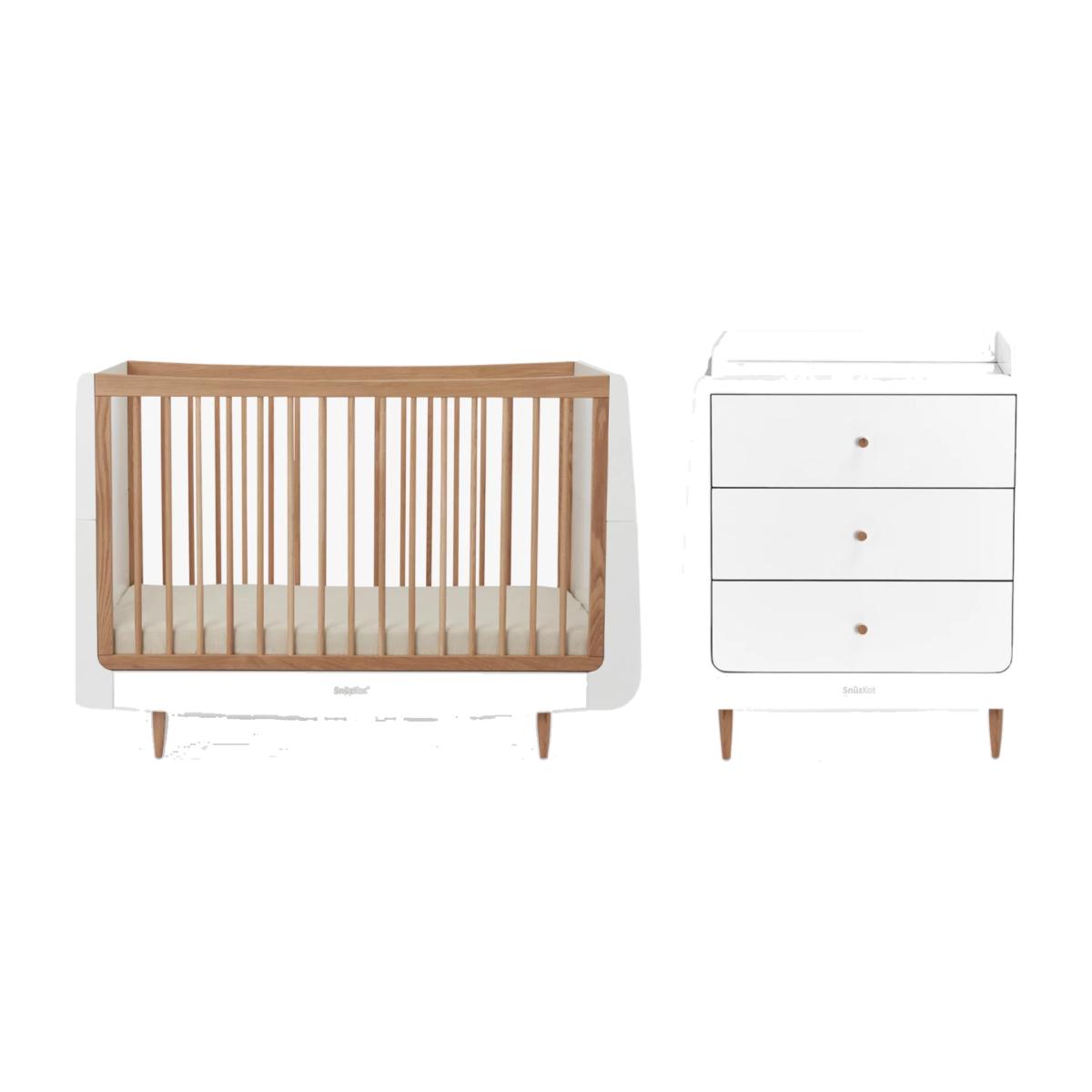 Create and customise your nursery with this beautiful Skandi Cotbed and Changing Unit from Snüz. Kot. It grows with your child from birth to approximately 4 years, and when used with the extension kit (sold separately), your child will have a comfy and cosy place to sleep until they're 10 years old. There are three mattress height settings for ease of access, and a low level bed which will help your toddler when getting in and out. Designed to last, every Snuz Kot is made using natural beech wood, without the use of MDF or veneer. The highest mattress position makes it easy to lift your newborn baby in and out, and as they grow and learn to sit and stand, the base can be lowered to help prevent them climbing out. The matching Skandi Changing Unit features three spacious drawers and a useful changing area with a removable frame, ideal for when baby becomes a toddler and they need a standalone dresser. Please note: The cot bed and changing unit comes flat packed in 8 boxes. Self-assembly required.