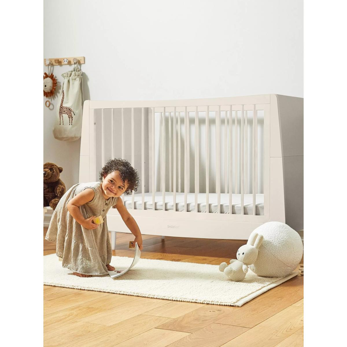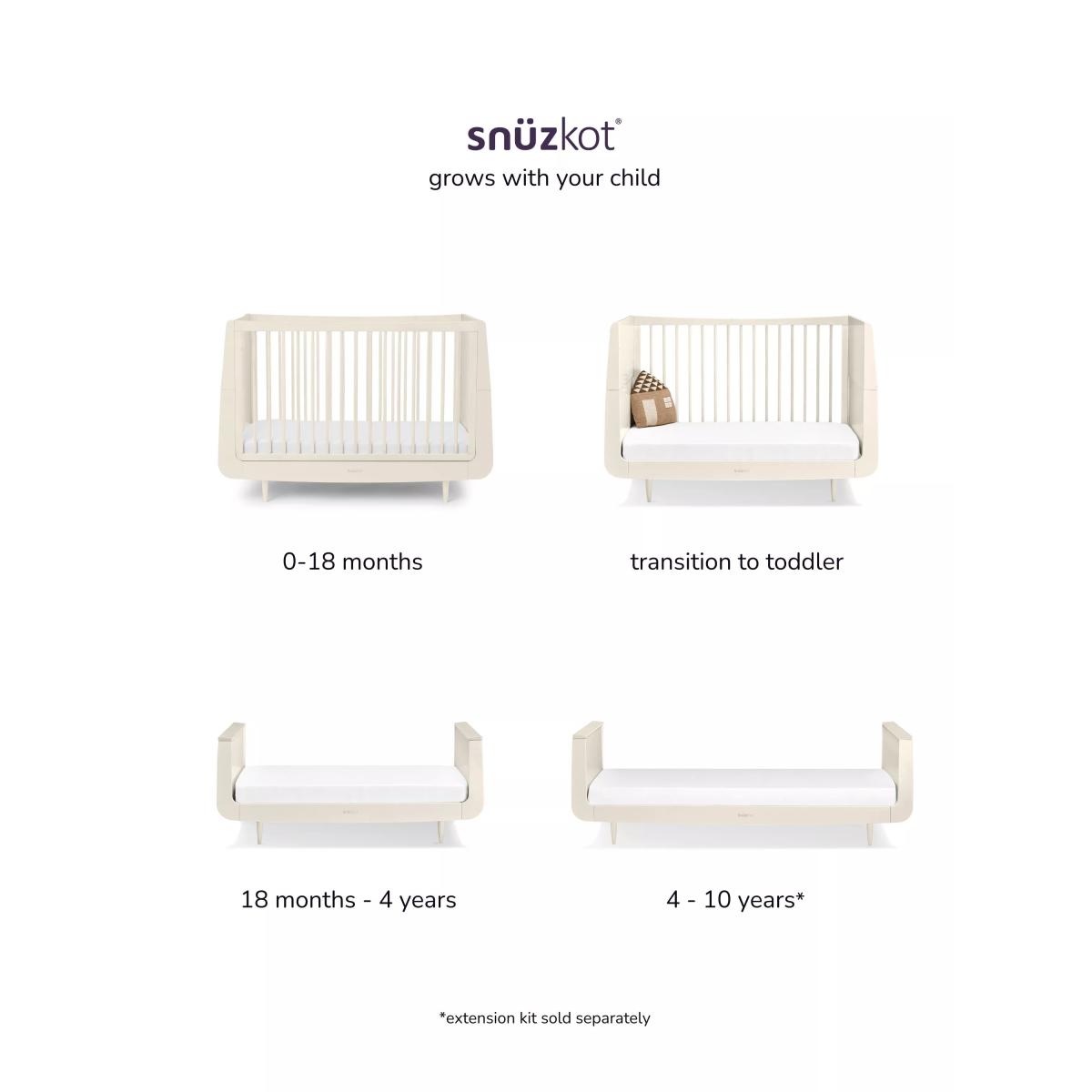 Meet the newest addition to the Snüz Kot collection. With so many styles and colours to choose from, create the dream nursery for your little one. Designed with 3 mattress heights to see your little one through their first 18 months, as they grow and learn to sit upright unaided. Transition to toddler:As your little one learns to walk, this stage provides the perfect transitional bed to see them to toddlerhood. With the freedom to climb in and out of bed unassisted, the back rail offers an element of comfort, familiarity, and security. At 18 months to 4 years, as their ability to walk and sense of balance improves, so too will their confidence. With this comes a readiness to try an open-sided bed, making this the ultimate transitional sleep space. From 4 - 10 years*: As your child grows in height, their bed can grow with them. Extend the length of the bed to suit their needs and see them through up to 10 years of age. *Junior extension kit required (sold separately) Features: Modern and minimal – True Scandinavian style in nursery furniture. Grows with them – Converts to a toddler and junior bed, for up to 10 years, with a separate extension kit. Designed to last – No use of MDF or veneer. Toddler Bed suitable up to 4 years old. Cot conforms to BS EN 716-1:2017 & BS EN 716-2:2017. Toddler bed conforms to BS 8509:2008+A1:2011. SnuzKot is made from both solid and ply beech wood. Requires self-assembly. Requires Snuz Surface Snuz Kot Mattress for stage 0 - 18 months (68 x 117cm) - sold separately. Warning: Do not leave anything in the cot or place the cot close to another product which could provide a foothold or present a danger of suffocation or strangulation, e.g. strings, blind/curtain cords, etc. Contact Snuz for replacement parts and instructional literature if needed All assembly fittings should always be tightened properly, and fittings should be checked regularly and retightened as necessary. Do not use the product if any part is broken, torn, or missing, and use only spare parts supplied or approved by the manufacturer. DO NOT substitute parts. Do not leave anything in the cot or place the cot close to another product which could provide a foothold or present a danger of suffocation or strangulation, e.g. strings, blind/curtain cords, etc.