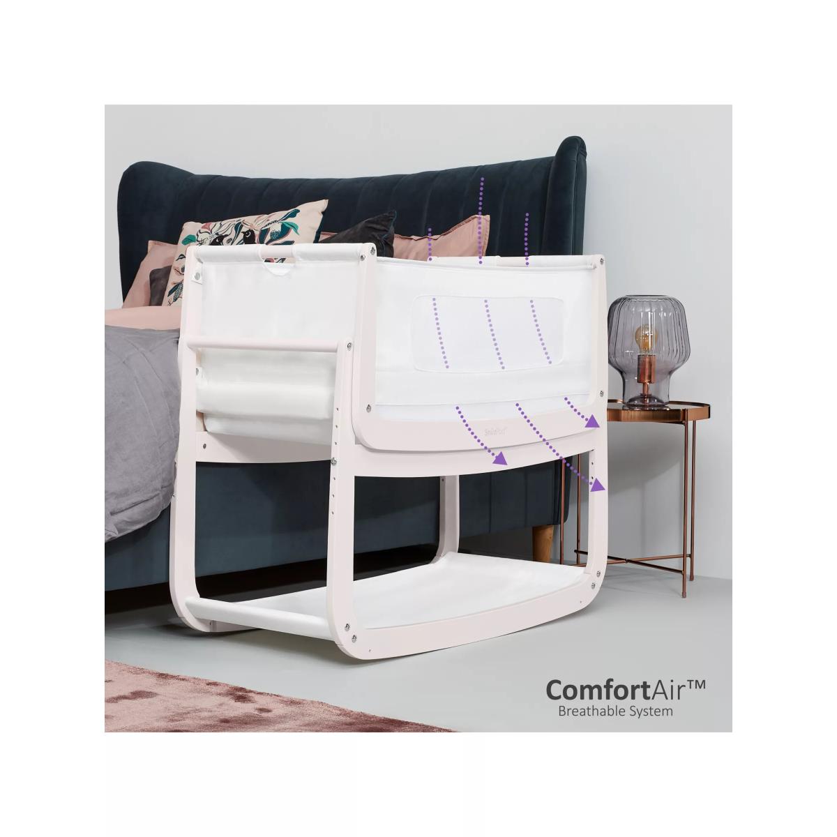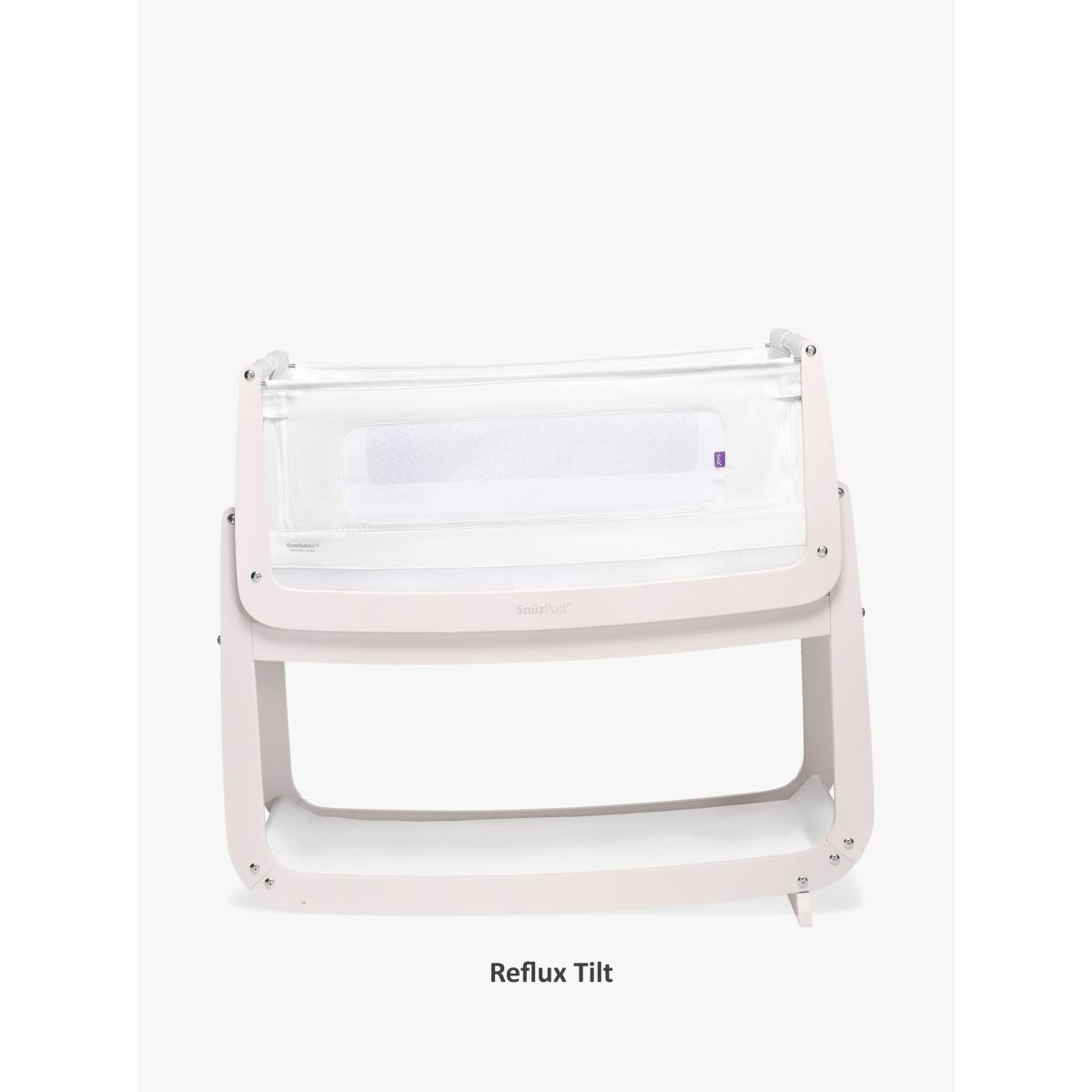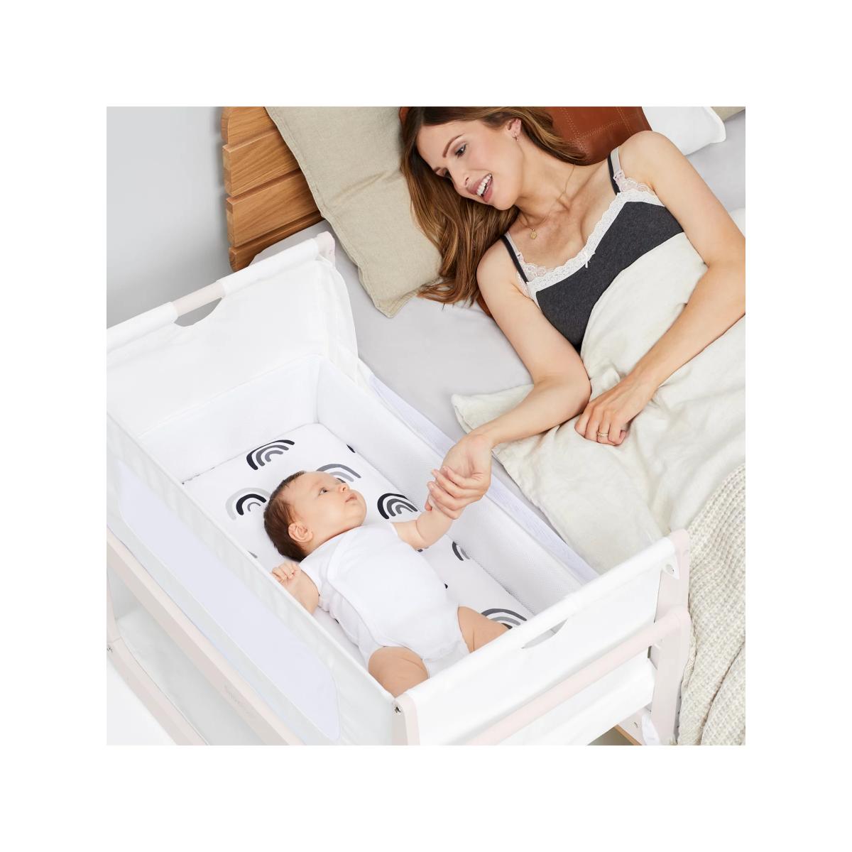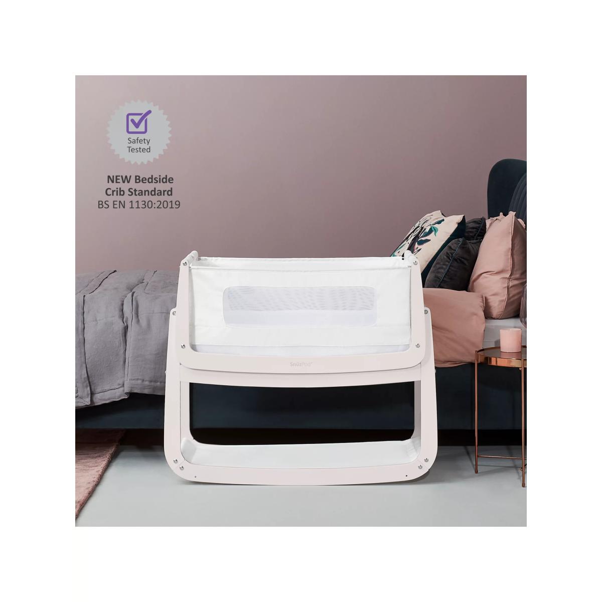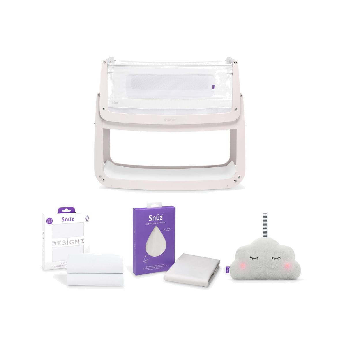 Get everything you need to create a cosy sleeping environment for your little one with this Snüz Pod 4 bundle from Snüz. A great starter set the bundle includes: 1 x SnuzPod. 4 Bedside Crib 1 x Snuz Cloud Baby Sleep Aid 1 x Waterproof Crib Mattress Protector 1 x Two Pack of Fitted Crib Sheets Sleep well, feed easily and be closer to your baby with the all-new Snuz Pod 4 Bedside Crib. Now even more breathable thanks to its innovative new Comfort Air system, with unique air-flow vents, machine-washable mesh liner, and improved base ventilation that help to regulate your baby's temperature for a good night's sleep. The Snuz Pod 4 also boasts a lightweight removable bassinet and new breathable mattress with a 3D mesh cover for all round better support. Key features: Sleep well, feed easily and be closer to your baby Comfort Air breathable system to help regulate temperature for a good night's sleep Mattress level air-flow vents 3D breathable mattress included Machine washable mesh liner Half-height zip-down wall Dual-view mesh windows and improved base ventilation Rocking stand with gentle reflux incline option Meets new bedside crib safety standard BS EN 1130:2019. The Comfort Air mesh liner has been tested to BS 4578 for breathability and air-flow Fits more beds than any other traditional bedside crib (new max. height 73cm) Lightweight lift-off bassinet for use around the home Can be used as a bedside crib or standalone crib Benefits of Bedside Cribs: Safe alternative to co-sleeping Comfort, feed and bond, being close to your baby Ease of breastfeeding No need to leave your bed during the night Ideal for C-section mums Allows you to keep baby in your room for the first six months, as recommended by experts Safety information: Maximum recommended weight of child 9kg Suitable from birth to 6 months, or until baby can sit up, kneel or pull themselves up unaided