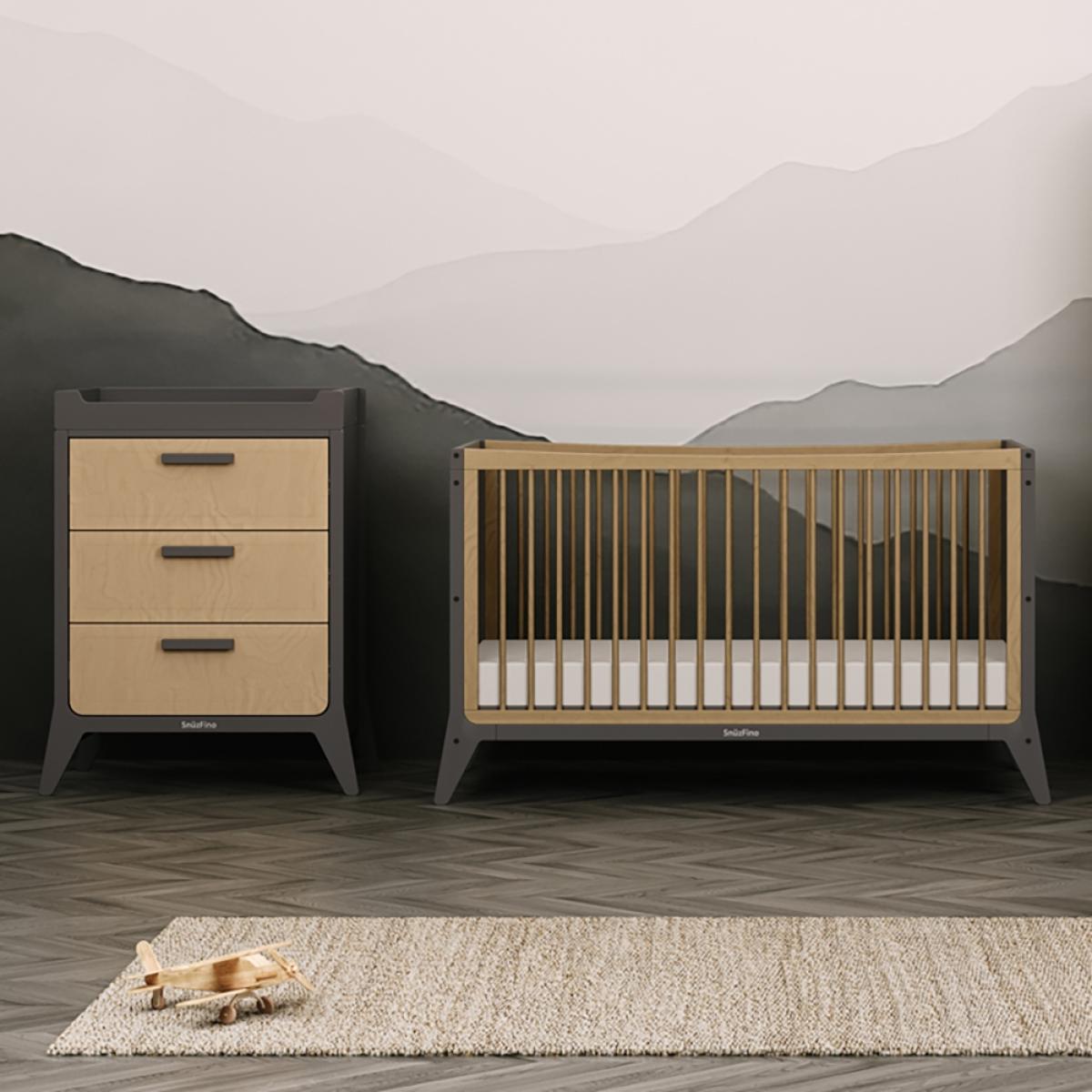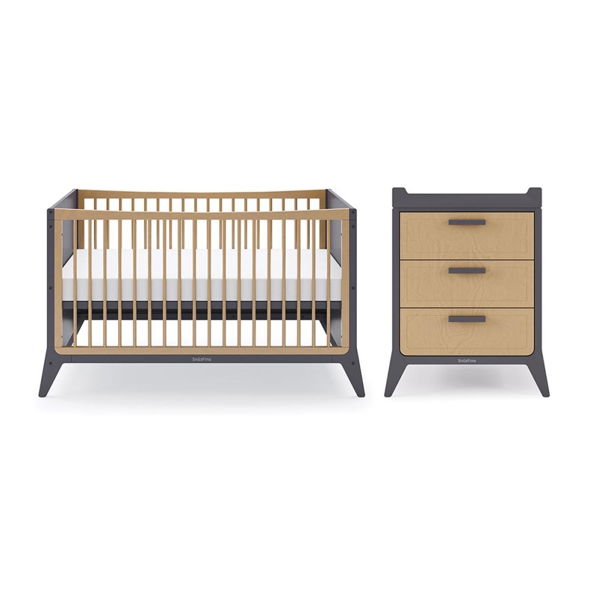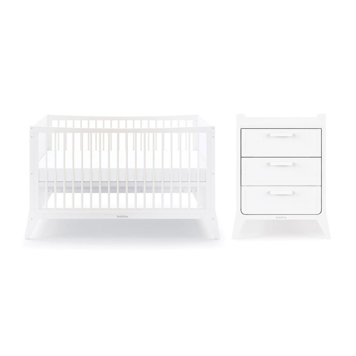 Call 'Fin' on your nursery furniture search with the Snuz Fino Cot Bed 2 Piece Nursery Furniture Set! Suitable from birth, the Snuz Fino cot bed features a height adjustable mattress base and can be transformed into a toddler bed with the conversion kit available separately. Creating a reassuring cocoon at bedtime, the junior bed is a great transition from cot to single bed, and can be used up to the age of 4. Part nappy changing station, part chest of drawers - the baby changing unit features spacious soft close drawers for essentials. And when the changing top has been outgrown, simply remove to continue using the furniture throughout their childhood. Available in a choice of neutral shades, this gorgeous and contemporary wooden nursery set would be perfect if you're expecting a little lady or fella. Pair with the coordinating two door wardrobe if you're still stuck for storage - the adjustable hanging rails and shelves are such a handy addition!.