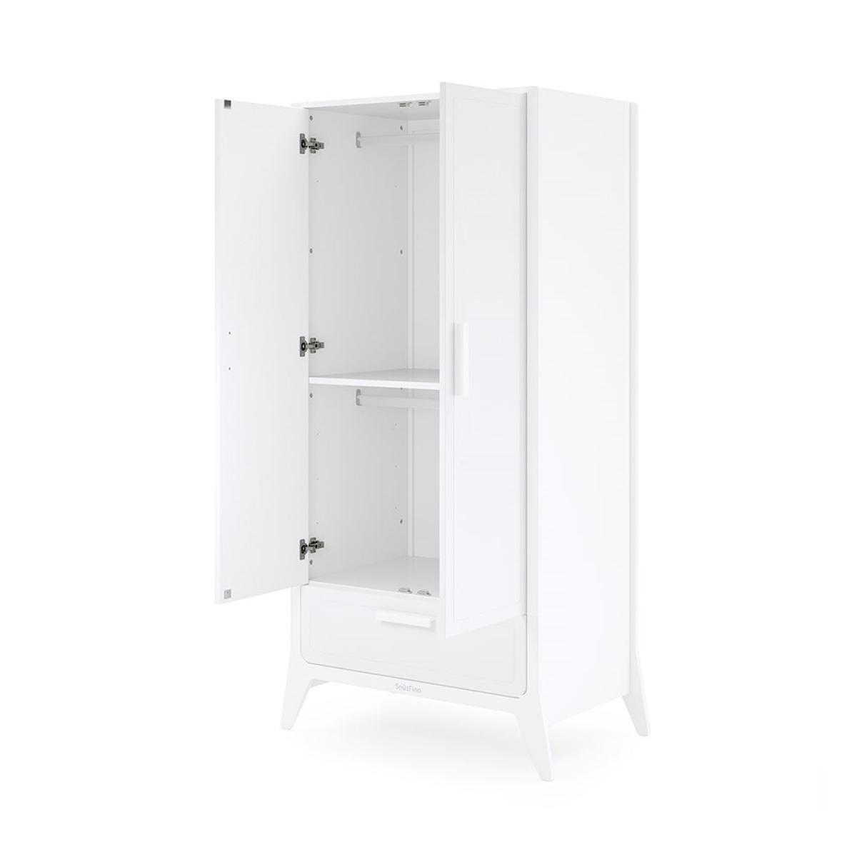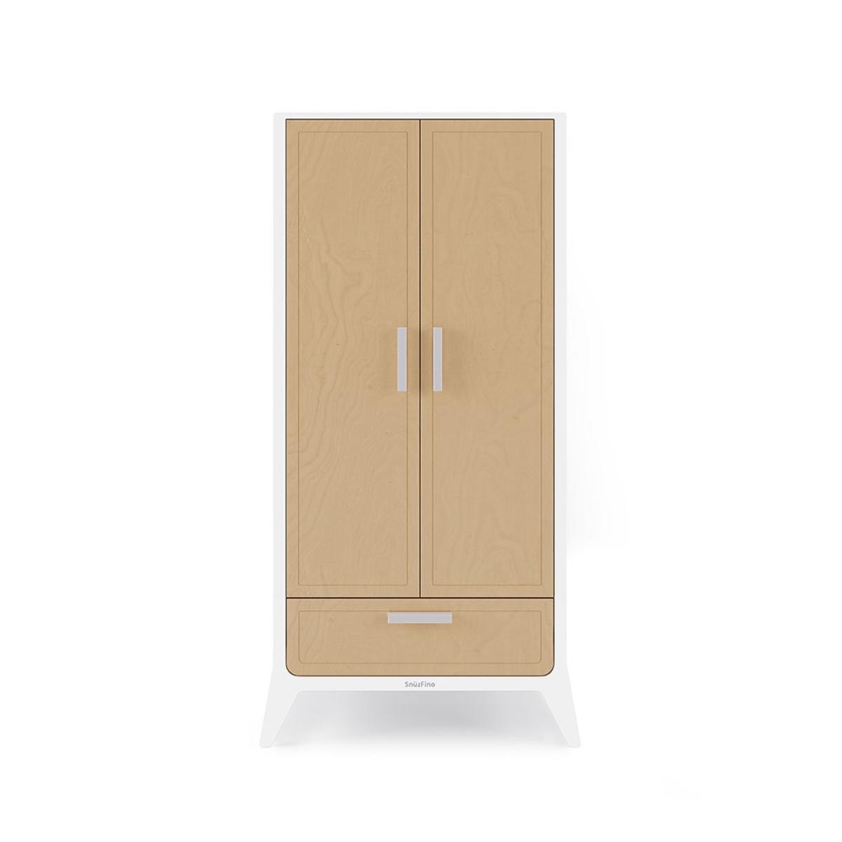 The SnuzFino Two Door Wardrobe can be adapted to suit your storage needs! Available in a choice of neutral colours, behind the wooden double wardrobe doors you'll find adjustable shelves and hanging rails. Simply adapt the interior configuration to house outfits, bedding, toys and more. The extra storage drawer below keeps other essentials separate. All doors and drawers are soft close too, so there's no fear of waking your tuckered out tots while you're tidying up. The Snuz Fino collection features contemporary handles and stylish details - pair the 2 door wardrobe with the coordinating cot bed and changing unit for a cohesive nursery setup!.