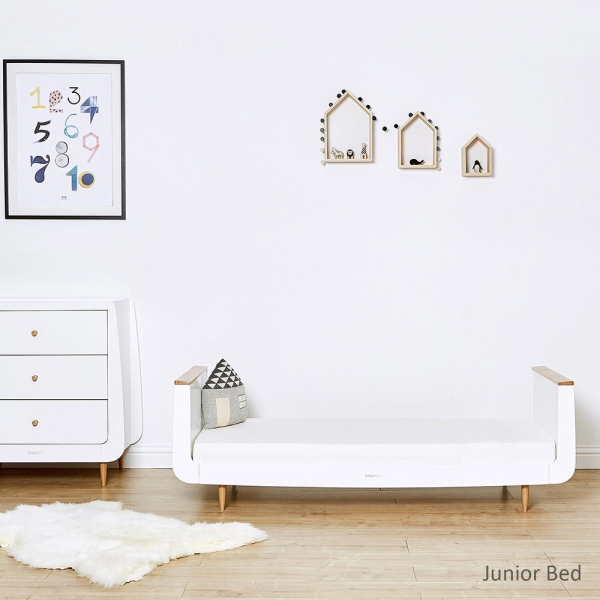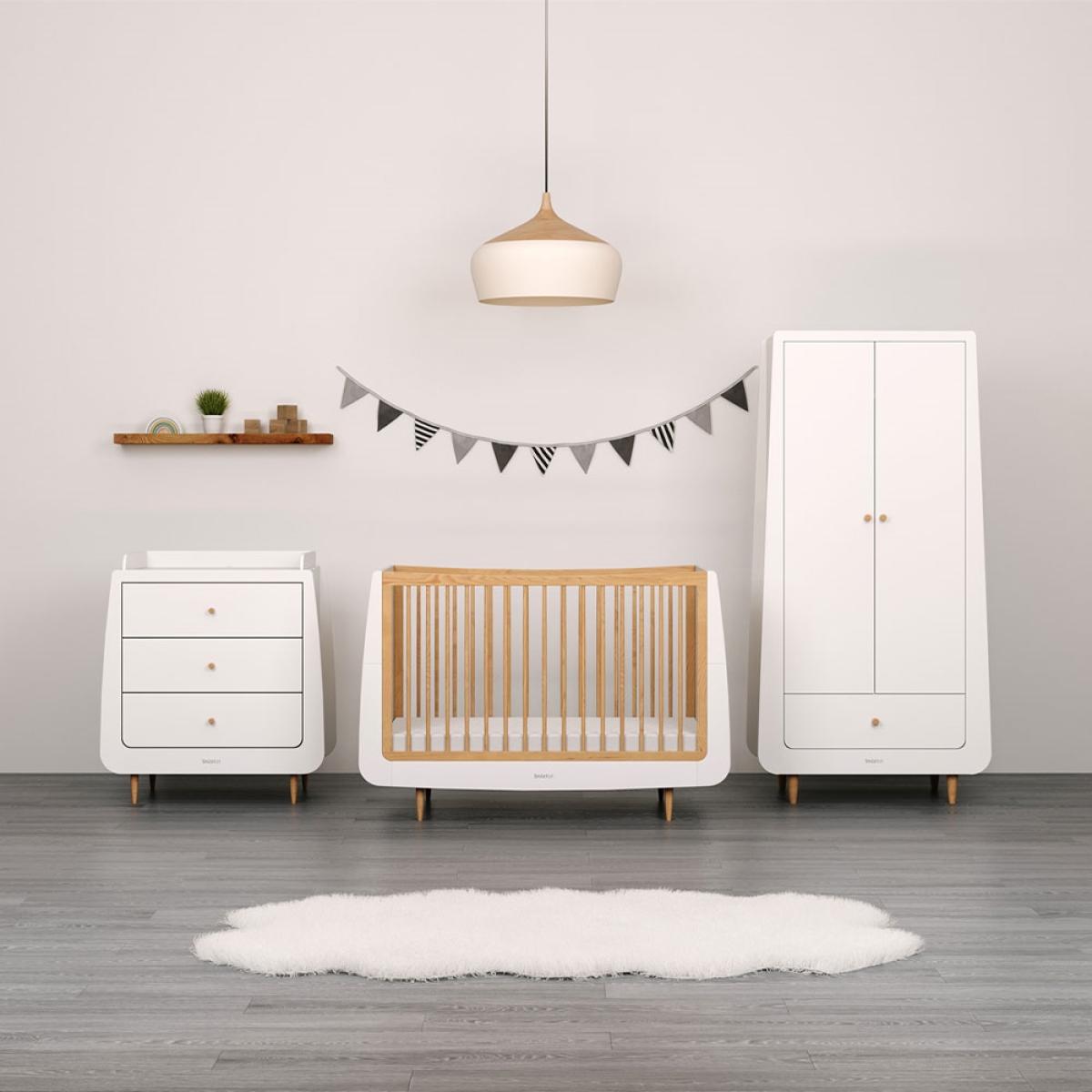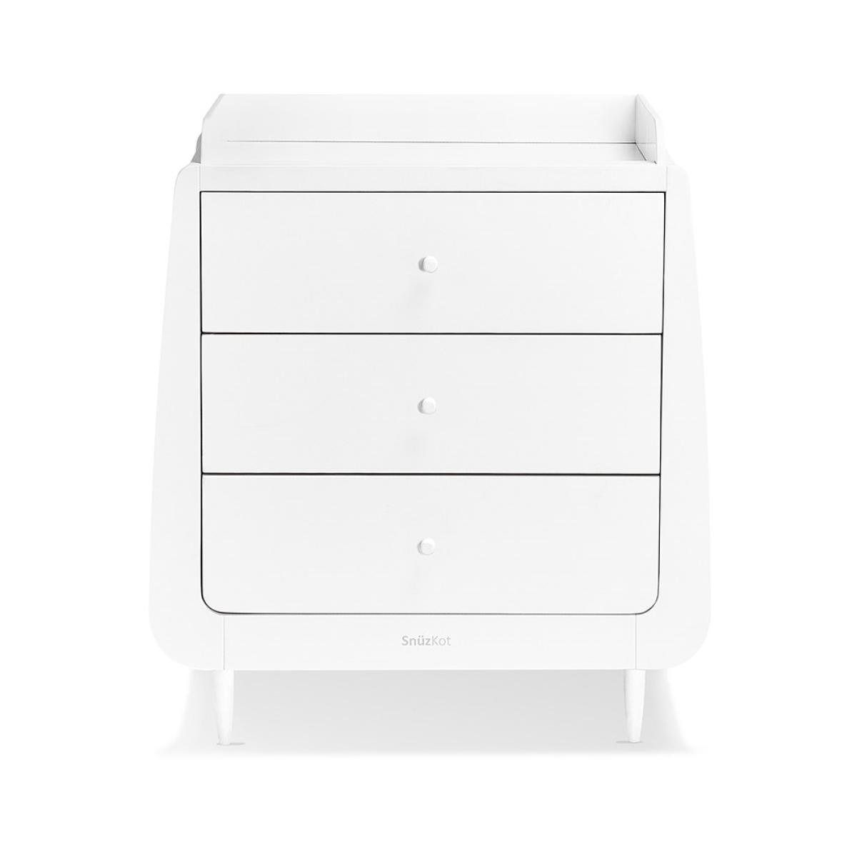 Sustainably made, stylish and with plenty of storage - the Snuz Kot Skandi 3 Piece Nursery Furniture Set is the perfect choice for new arrivals! Designed with longevity in mind, the adjustable 4-in-1 cot bed can be used from birth up to 10 years of age with the additional conversion kit. Simply raise or lower the mattress height to suit your babies development and when they're ready, transform the cot into a toddler bed, day bed and then a full sized single bed with the optional kit. The changing unit and wardrobe are adjustable too! When your baby is going through nappies like nobody's business, having a changing station is essential. With 3 spacious drawers below the changing top - keep clothing, lotions and wipes ready for your next visit. And when it's no longer needed, remove the changing top and continue to use a chest of drawers throughout their childhood. Inside the two door wardrobe you'll find two adjustable clothes rails and an adjustable shelf with a spacious storage drawer below. Change the configuration to suit your needs and adapt as your little one grows. Designed with soft-close doors and drawer, tidying away is made a little quieter! Available in white with a choice of coloured handles and feet, this Scandi inspired set has it all!.