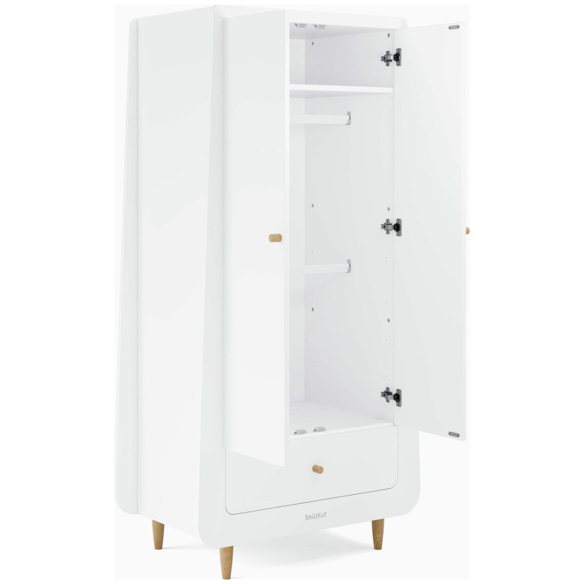 Introducing the Snuz Kot Skandi Wardrobe, perfect for all your little one's storage needs. Modern and minimal, it boasts a spacious interior, and features adjustable shelving and rails plus a large drawer perfect for bedding or essentials. No MDF or veneer 2 adjustable hanging rails and 1 adjustable shelf (user-configuration dependent) 1 large lower drawer, perfect for bedding or essentials The wardrobe must be fixed to the wall, with the kit provided, for safe use of the product and to avoid tipping. Coordinates with Snuz Kot Skandi Cot & Snuz Kot Skandi Changing Unit. Soft-close drawer and doors. Part of the Snuz Kot collection. 2 doors. 2 hanging rails. 1 adjustable shelf. 1 drawer. Package Dimensions: Package 1 dimensions: H177.5, W98.5, D11cm. Package 1 weight: 25kg. Package 2 dimensions: H177.5, W63.5, D10.5cm. Package 2 weight: 24kg. Package 3 dimensions: H77.5, W62.5, D15,. Package 3 weight: 24kg. General information: Size H180, W89, D57cm. Weight 72kg. Packed flat. If this product is over 60cm height it must be securely attached to the wall to prevent overturning. Home assembly: 2 people recommended. Manufacturer's 1 year guarantee.