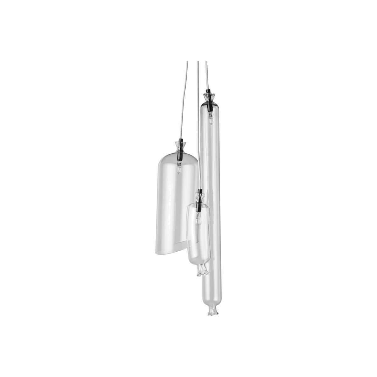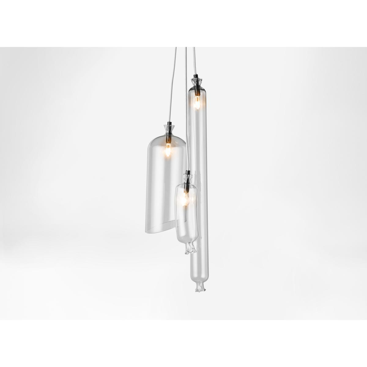 "SO-SAGE is the new story invented by Sam Baron and Petite Friture. They appear like glass sausages hanging as they would in a traditional butchers, of different sizes and forms, that illuminate mischievously thanks to a levitating light. Each is unique. Created in borosilicate the SO-SAGE come in threes, fives and six or live their life as a lone sausage. ""Suspended from the ceiling, in groups or alone, these lights playfully remind us of the strings of sausages we see hanging in traditional butchers or. The innocent flight of a par ty balloon. Their transparency reveals the contours of their dif ferent designs and allows the light to dif fuse through this magnificent and fascinating material. "" Sam Baron ".
