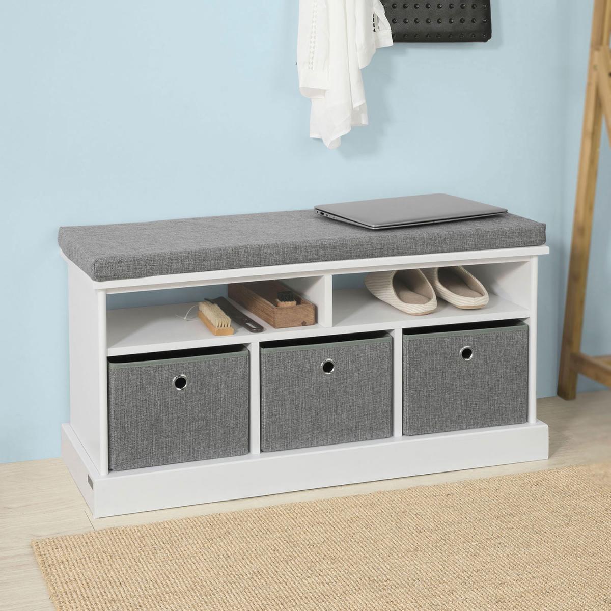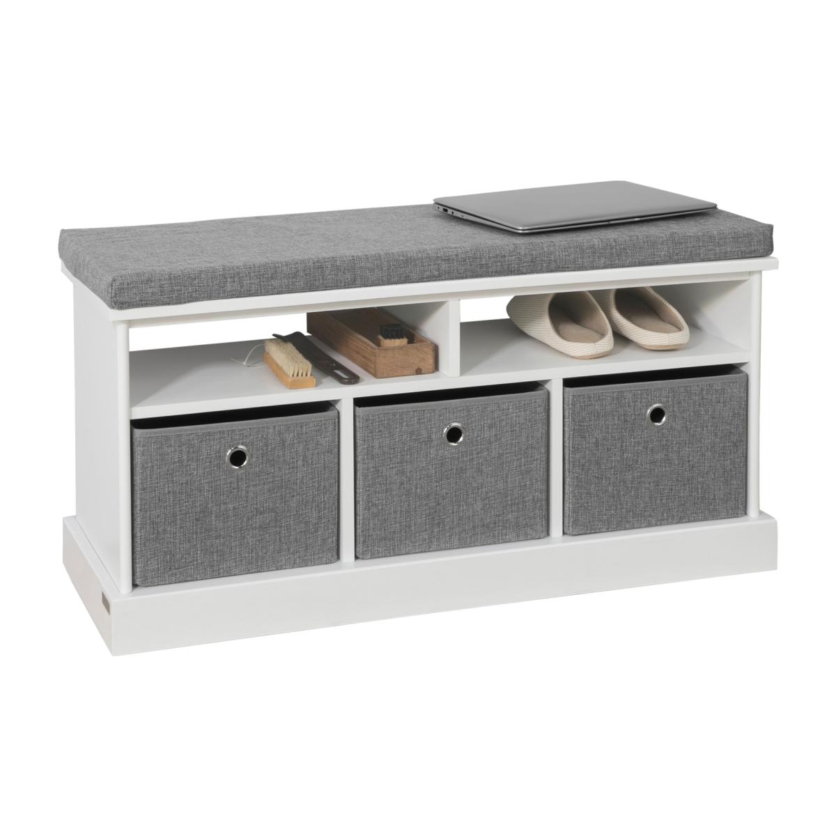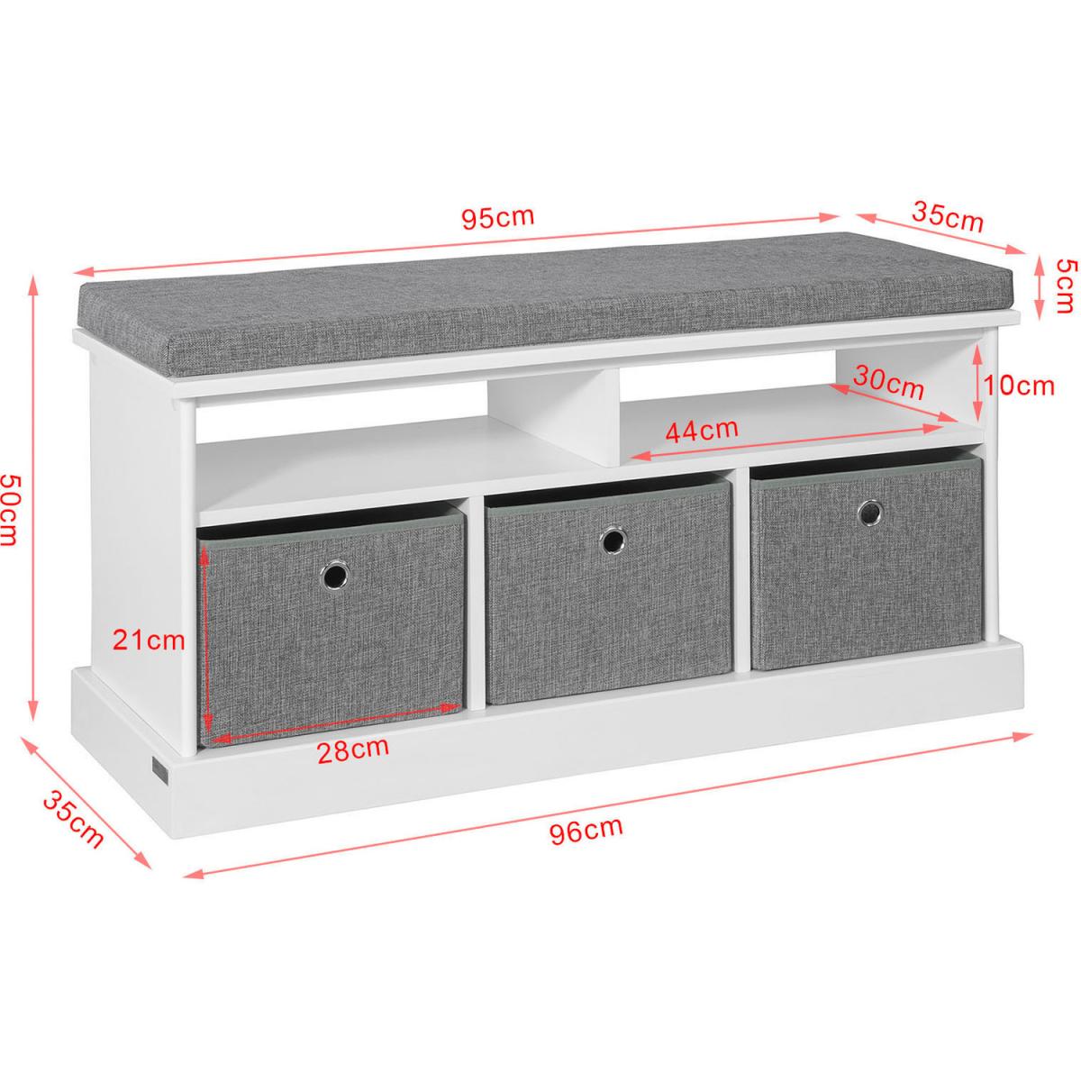 Modern design shoe cabinet storage bench is a good choice for hallway and bedroom, etc. The padded seat which is removable is ideal for comfortable sitting while putting on and taking off shoes. 3 baskets provide ample storage space for shoes, linens, toys, etc. In addition, they can be pulled out completely as a great storage solution. Modern design, the storage cabinet will blend perfectly with your modern or traditional decor. You can combine this storage bench with the Wall Coat Rack (FRG282-W) as a hallway set. Detailed instructions supplied.