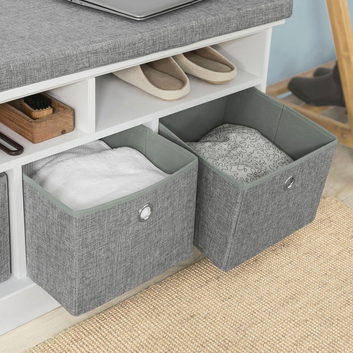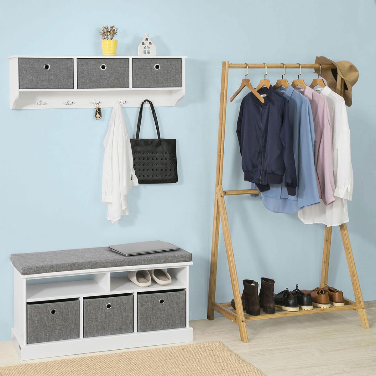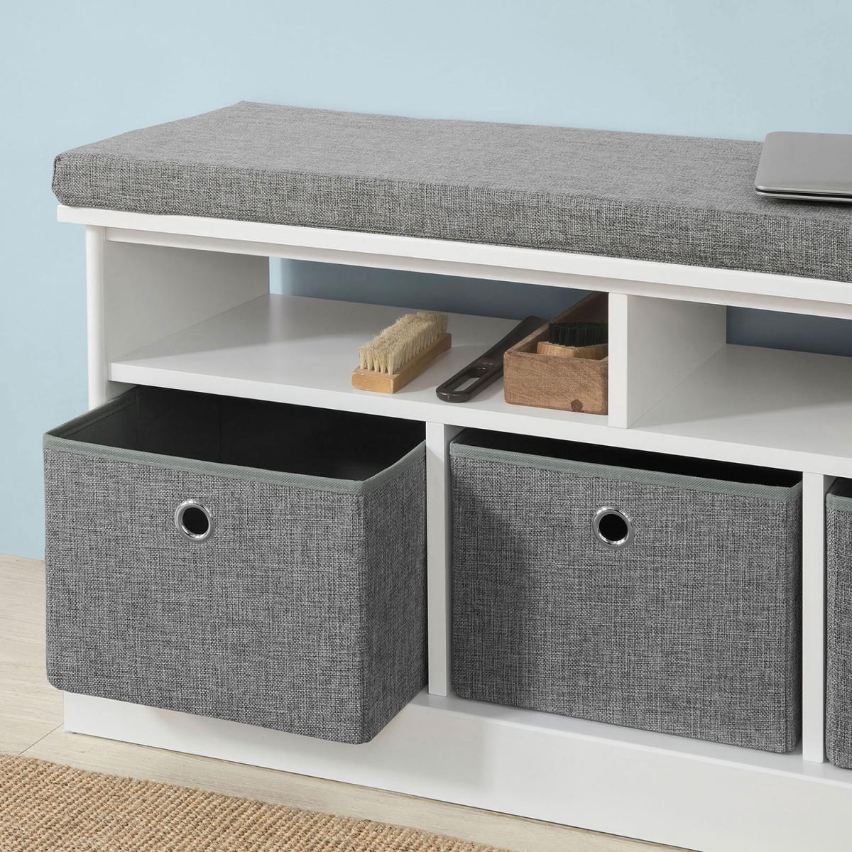 Modern design shoe cabinet storage bench is a good choice for hallway and bedroom, etc. The padded seat which is removable is ideal for comfortable sitting while putting on and taking off shoes. 3 baskets provide ample storage space for shoes, linens, toys, etc. In addition, they can be pulled out completely as a great storage solution. Modern design, the storage cabinet will blend perfectly with your modern or traditional decor. You can combine this storage bench with the Wall Coat Rack (FRG282-W) as a hallway set. Detailed instructions supplied.