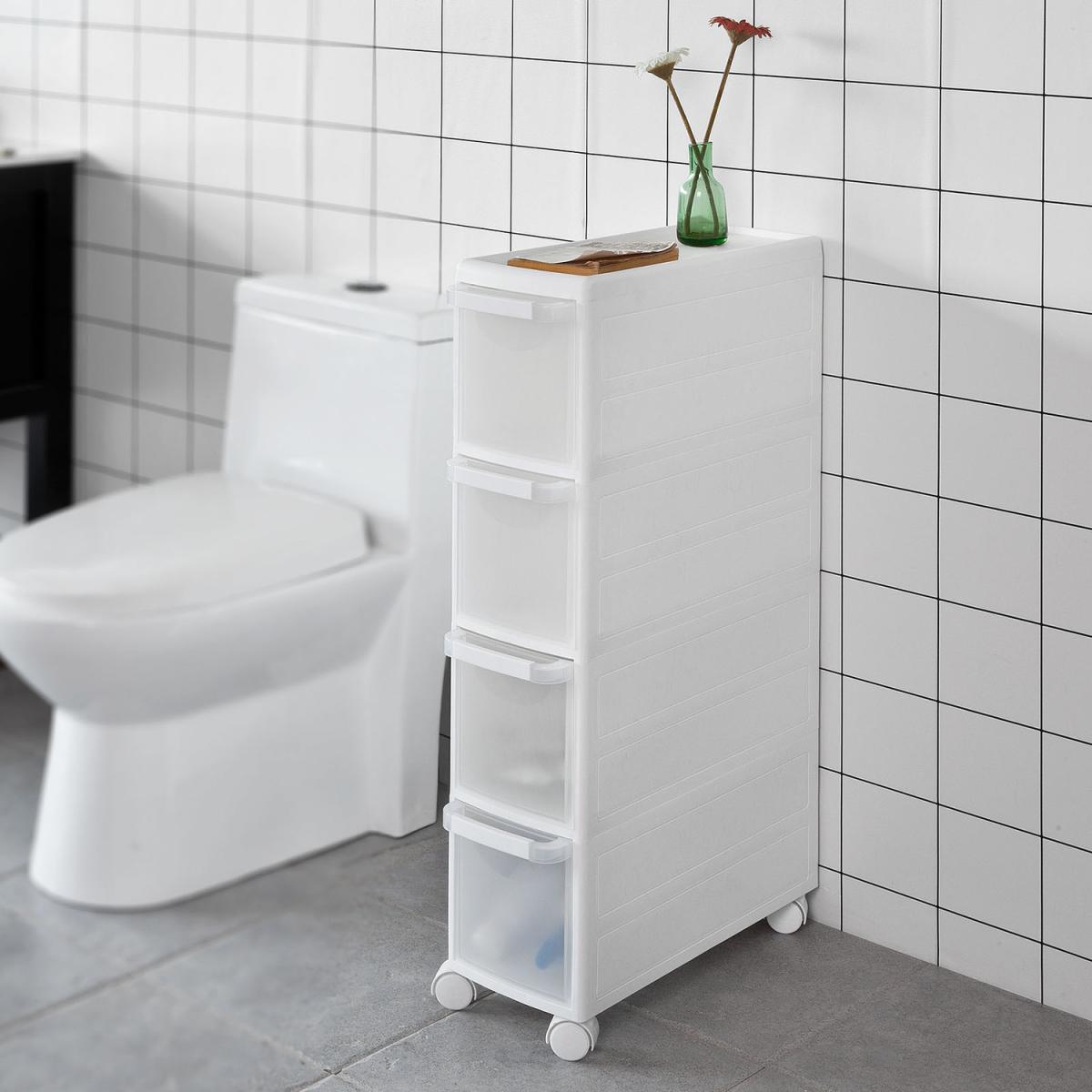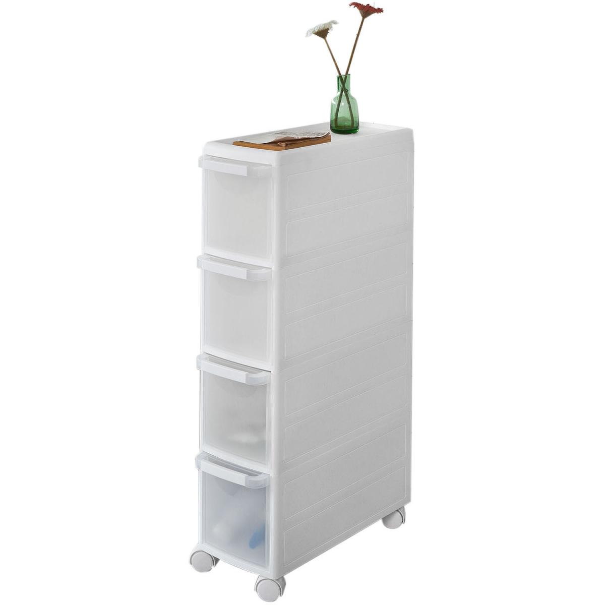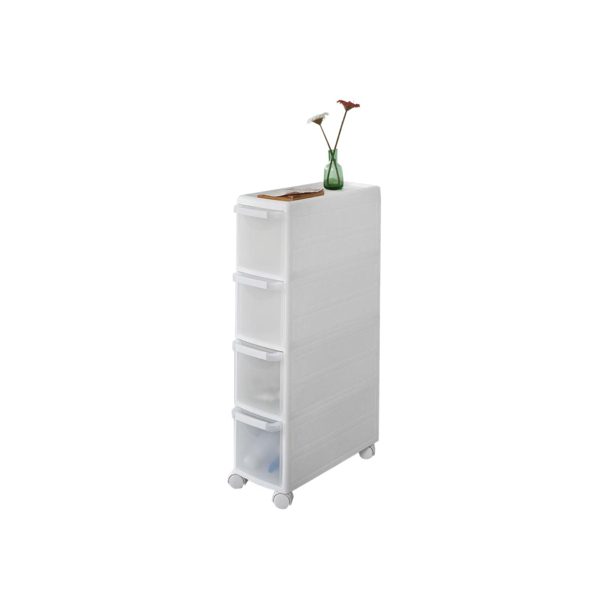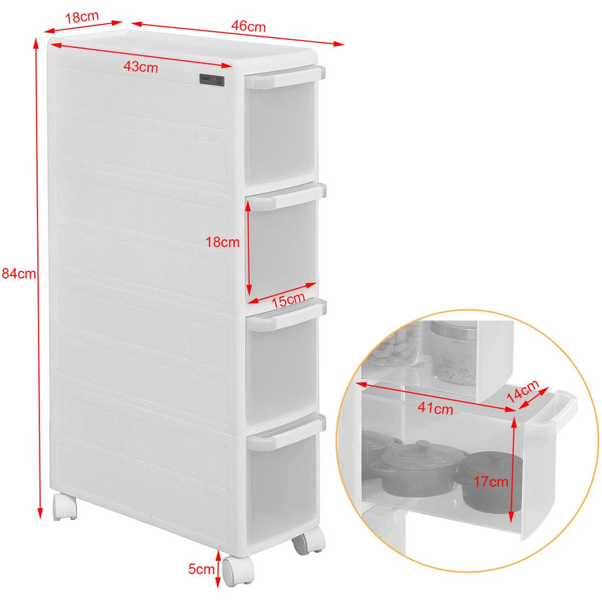 A super convenient storage cabinet on wheels with 4 drawers provides considerable amounts of storage space for your items. A handy cabinet in the kitchen or bathroom finds its place in all tight corners where you need extra storage or serving facility. 4 castors made of nylon for easy movement. Quick and easy assembly. Easy to clean and maintain. The decorative elements are not included in the delivery.