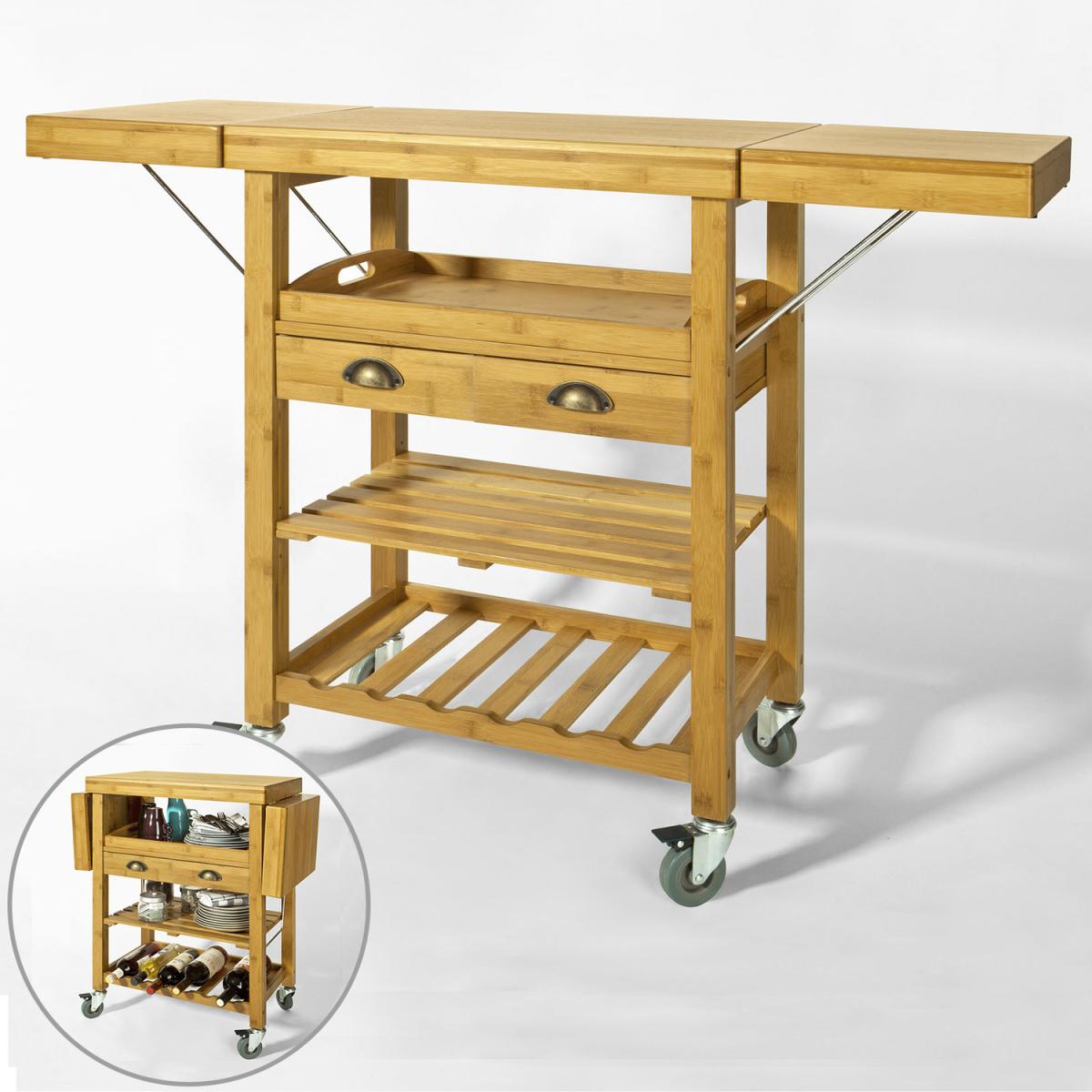 This luxury kitchen cart is made of high quality and robust bamboo. Top with 2 folding hinged sideboards, 1 removable tray, 2 drawers, 1 open shelf, 1wine bottle rack, 4 rubber wheels and 2 with brake. Bamboo is a rapidly renewable resource, which is characterized by its exceptional stability and beautiful interface. The work surface provides plenty of space to store and prepare food and if more space is required two extra fold-up sideboards that are 6cm thick will add an extra 30cm respectively to the length of the trolley.