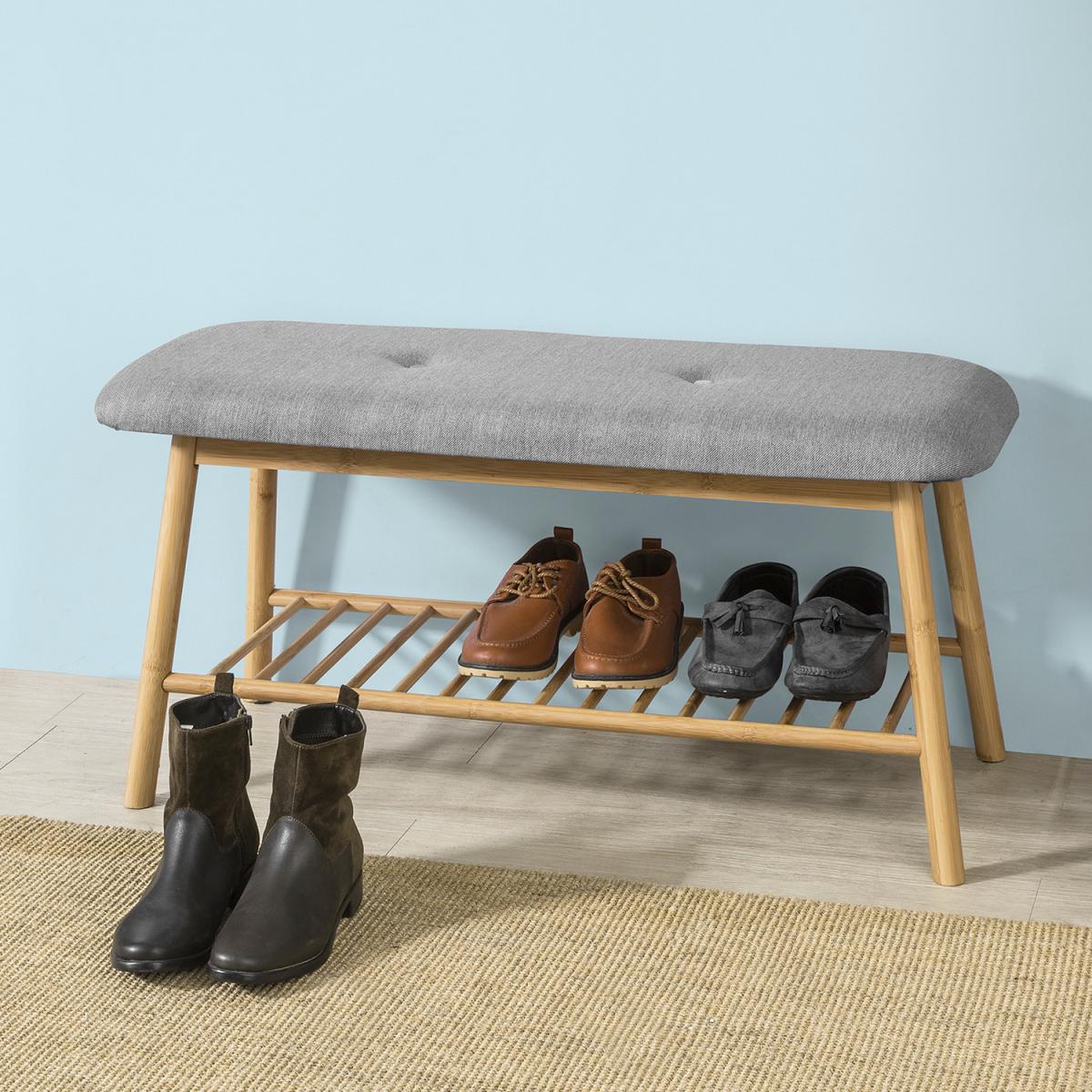 Modern design shoe rack, offering storage for shoes as well as extra seating space, good choice for hallway, living room and bedroom. It features 1 tier shoe storage rack beneath the comfortable seat cushion. The padded seat is ideal for comfortable sitting while putting on and taking off shoes. Good quality bamboo, stable and sturdy!