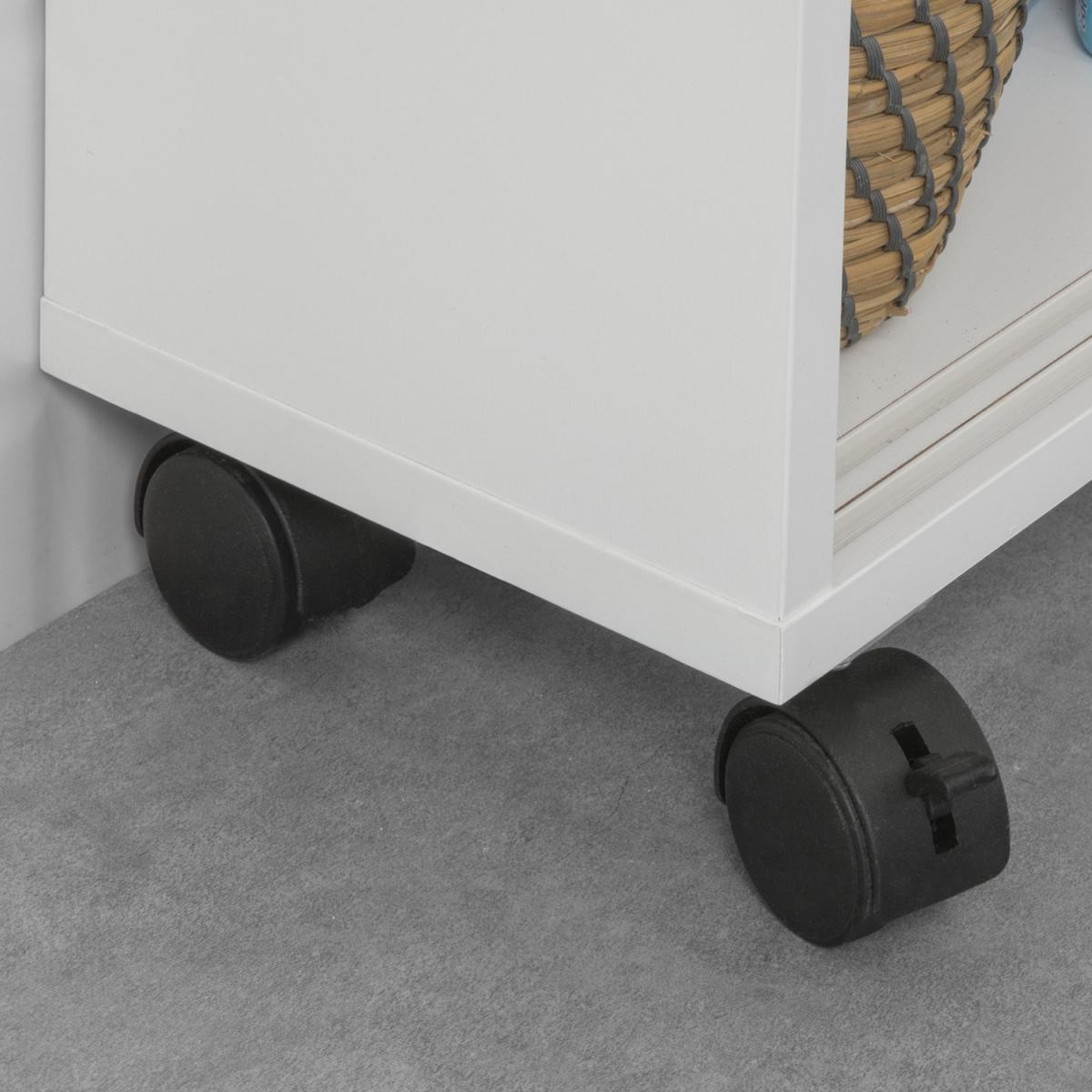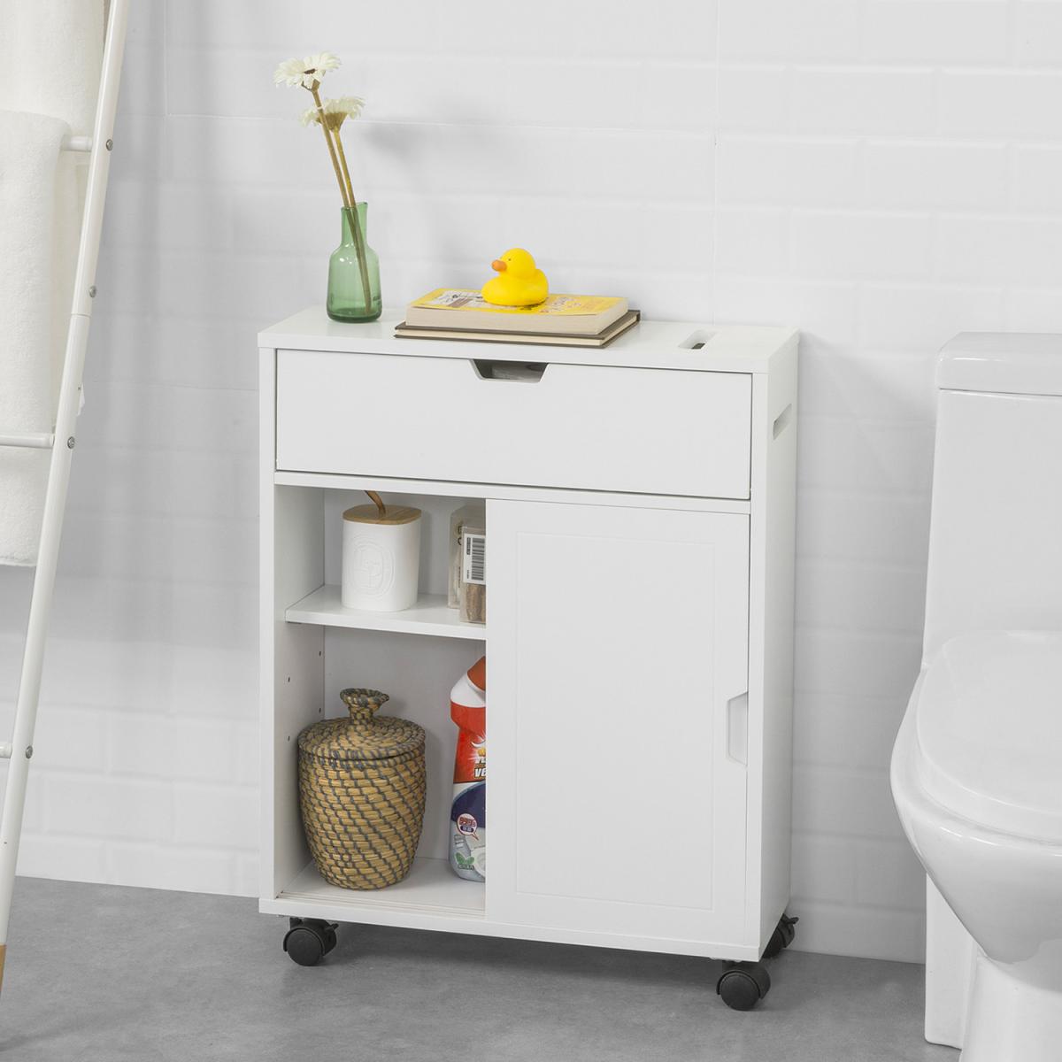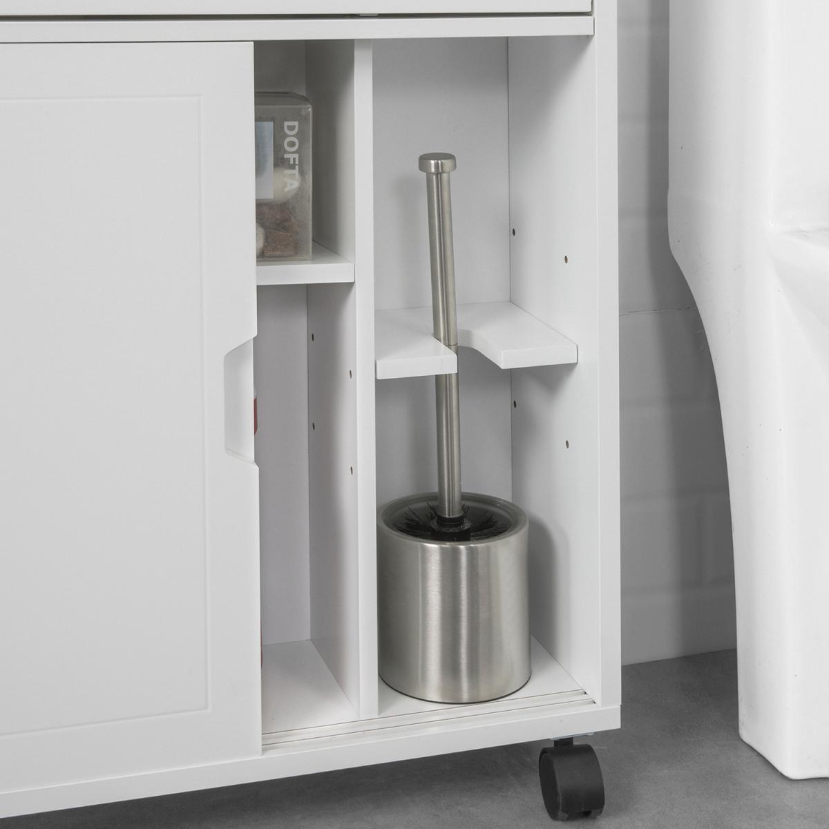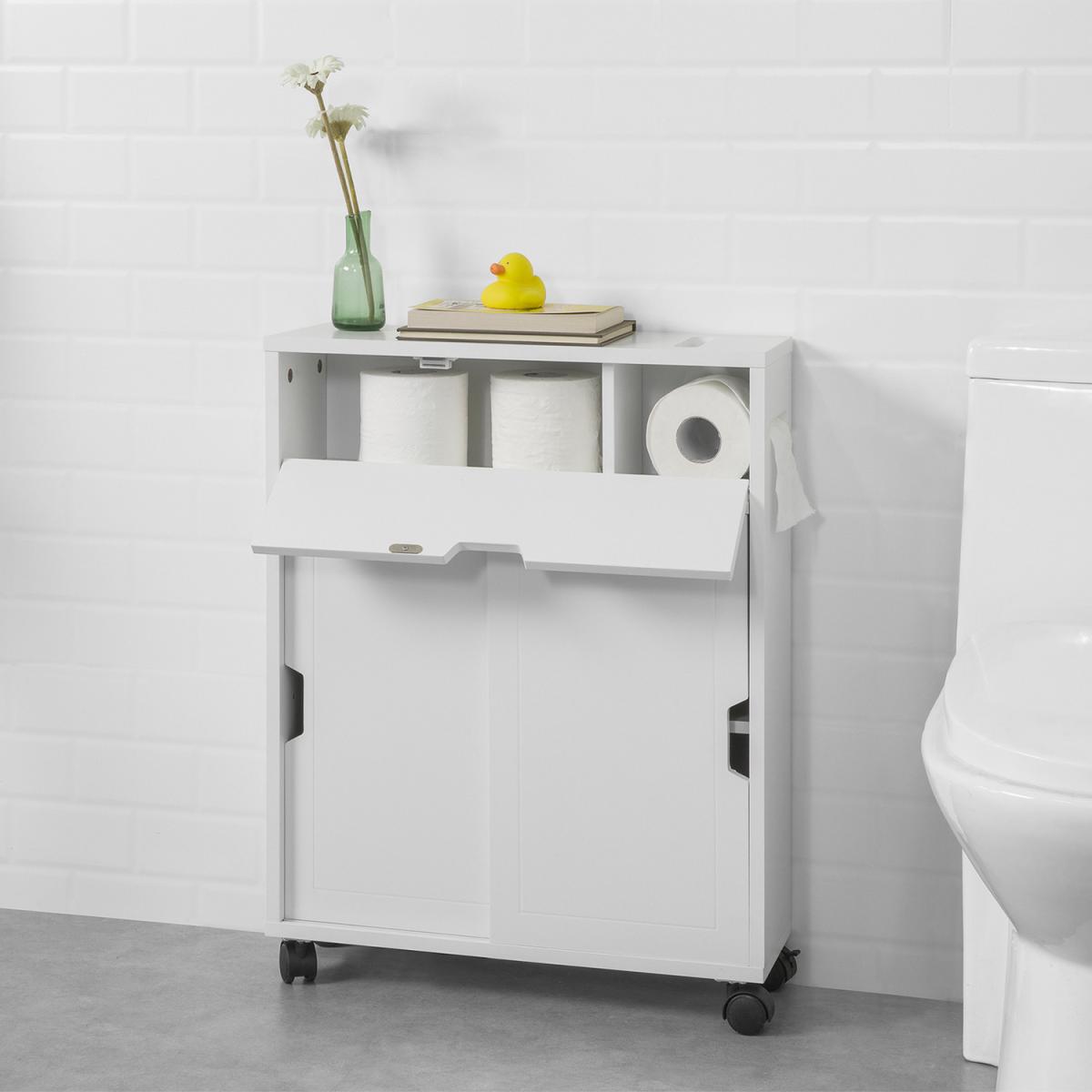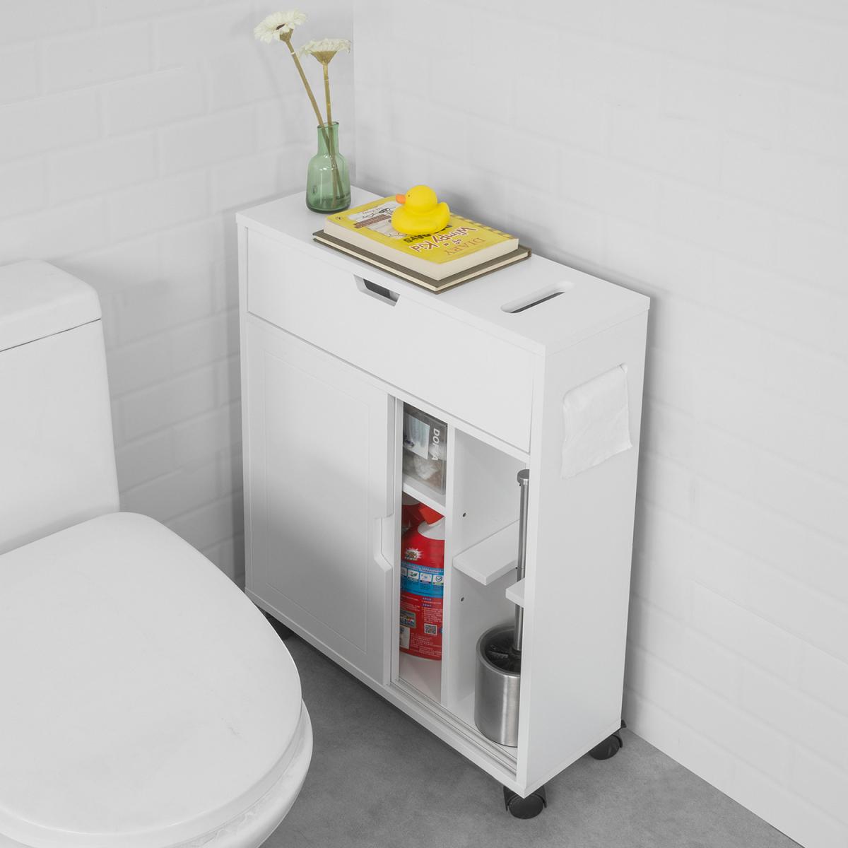 This cabinet is the perfect bathroom storage solution!Its slender design fits into those small spaces in bathrooms. With the storage component on the top, your favorite reading material will be kept clean, tidy and will always be on hand for when you need it. The storage cabinet has sliding doors with internal adjustable shelf is perfect for keeping toilet paper and detergent, etc. The cabinet on the right hand side is suitable for storing toilet brush & holder.4 swivel castors (2 with brake) for easy movement. Space saving storage solution that will help keep your bathroom tidy and organized.
