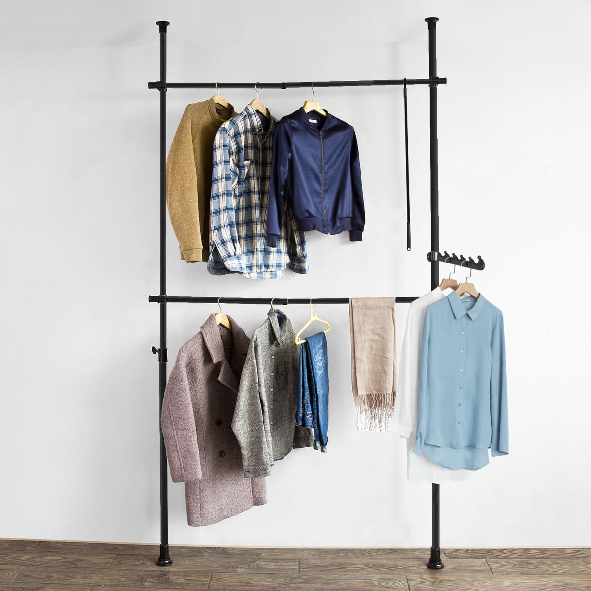 Telescopic Wardrobe Organiser, Hanging Rail, Clothes Rack, Storage Shelving is great for value. This shelving system offers a lot of storage space for clothes and other accessories. Through the telescope system, this shelf saves space in each room. This shelving system made out of 2 telescopic rods (103-278cm), 2 telescopic hanging rails (77-112cm) and 1 clothesline pole. It needn't be screwed onto the floor or the ceiling. All mounting hardware is included for easy self-assembly.
