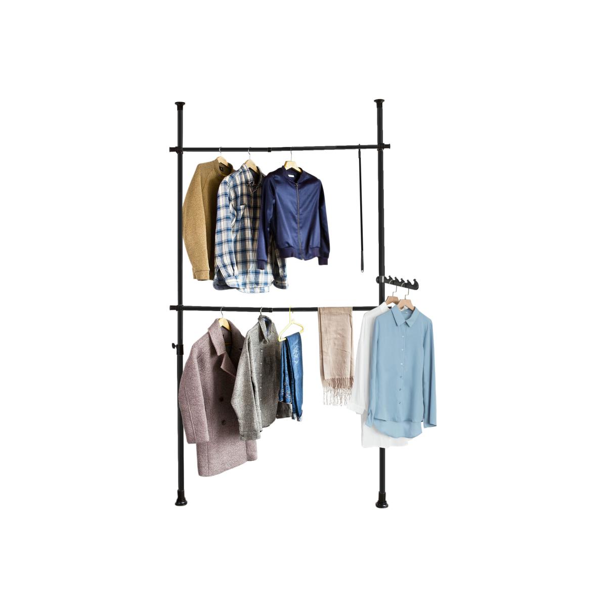 I’m a big fan of this black telescopic rail for its clean lines and instant extra hanging space - ideal if you’re renting or just need a flexible solution. It sits neatly in urban flats, minimalist bedrooms or industrial-style hallways, and the adjustable poles mean you can tailor it to awkward alcoves or full-height walls. For styling, stick to uniform hangers (either all black metal or slim wooden ones) and group clothing by colour or type to keep it looking intentional. Use the lower rail for heavier items like coats and the top for shirts or lighter layers. Slide in a few woven baskets at the base for scarves and accessories, and you’ve got a compact, showroom-style display rather than just another storage unit.