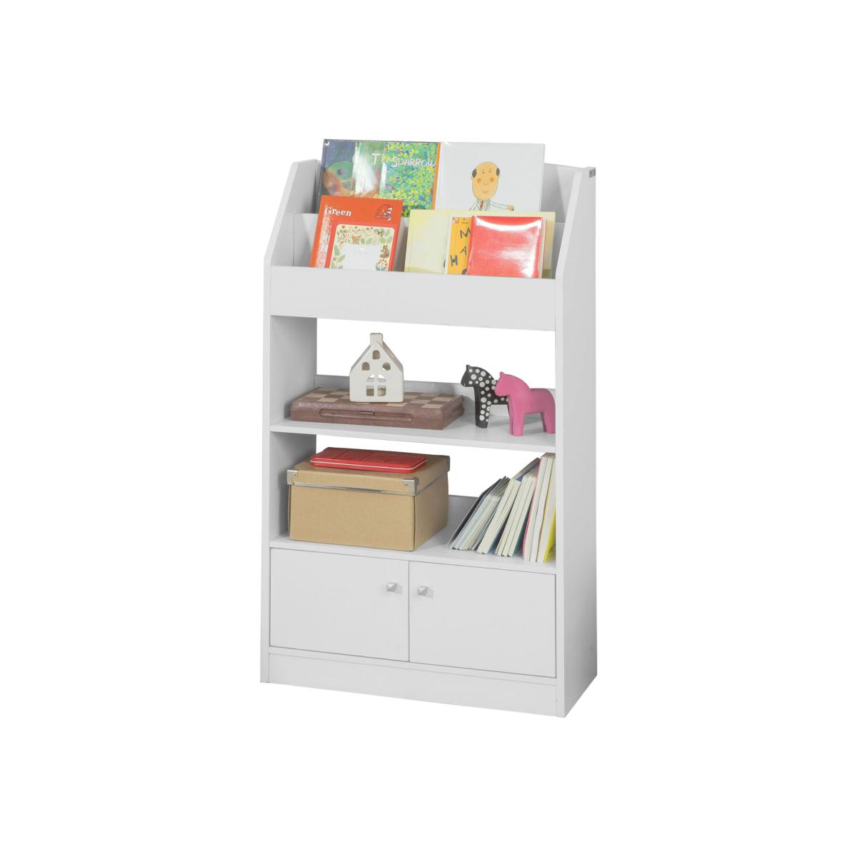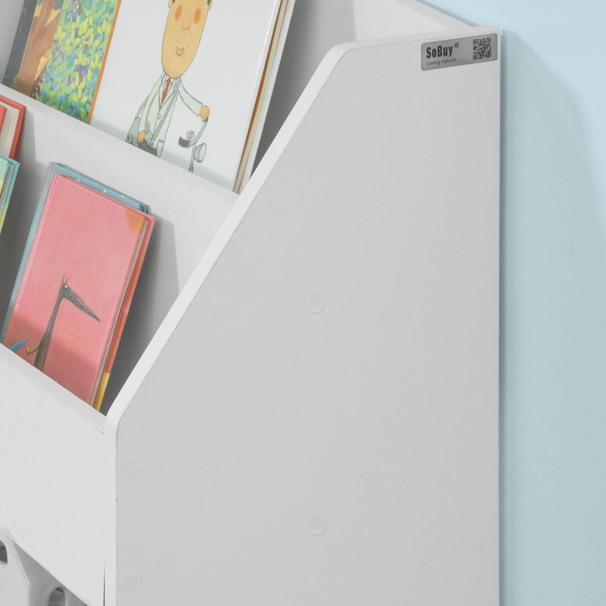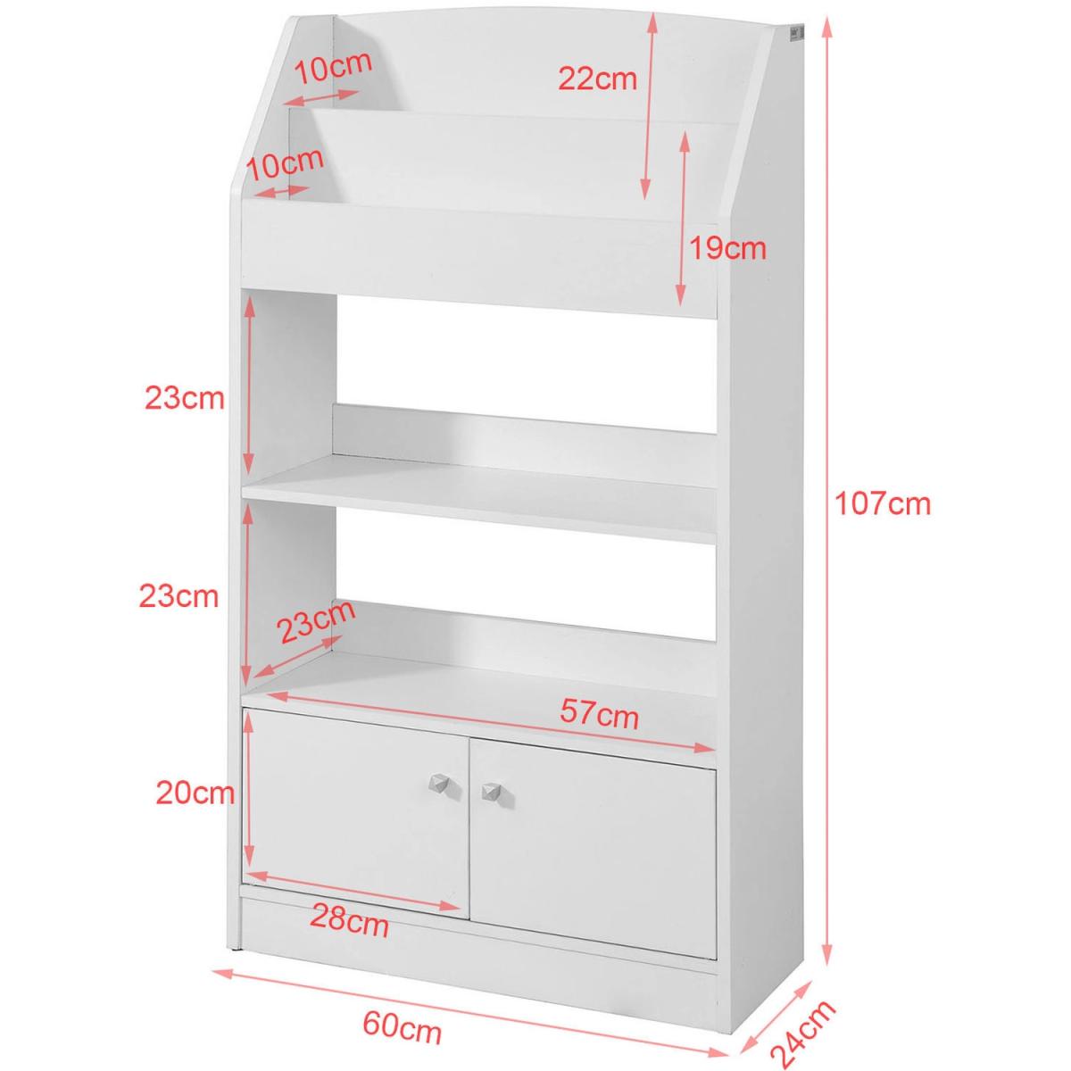 Modern design freestanding bookcase is perfect for children room. Top: 2 tiers keep books from being damaged, flexible for books of varying size and thickness. Middle: 2 storage shelves provide additional storage space. Bottom: A cabinet with a double door offers extra space too and keep items out of sight. Suitable for children ages 3 and up, promotes organisation and reading skills. Space-saving and easy installation, good choice for organizing books.