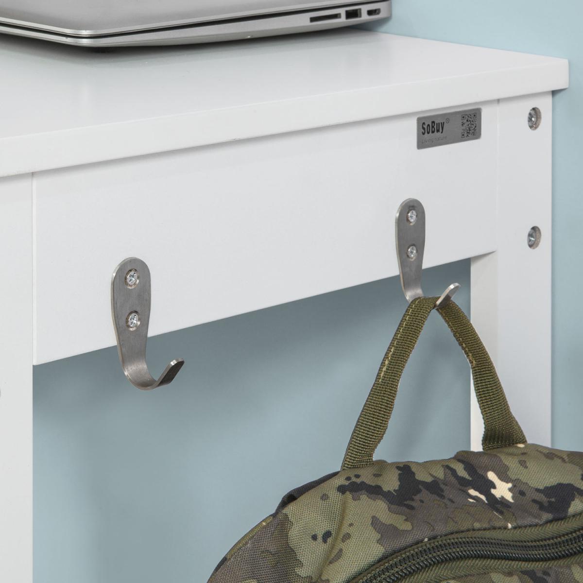 I appreciate how this compact white desk brings clear, uncluttered lines to a small corner, making it ideal for home offices in minimalist, Scandi or contemporary schemes. The built-in hook and lower shelf are practical touches for hanging bags or stashing books without eating into desktop space. To style, keep the surface tidy with a slim desk organiser or a single monochrome pen pot, and introduce a small potted plant to soften the look. If you have wall space, hang a simple floating shelf or magnetic board above it to corral notes and free up the tabletop even more.