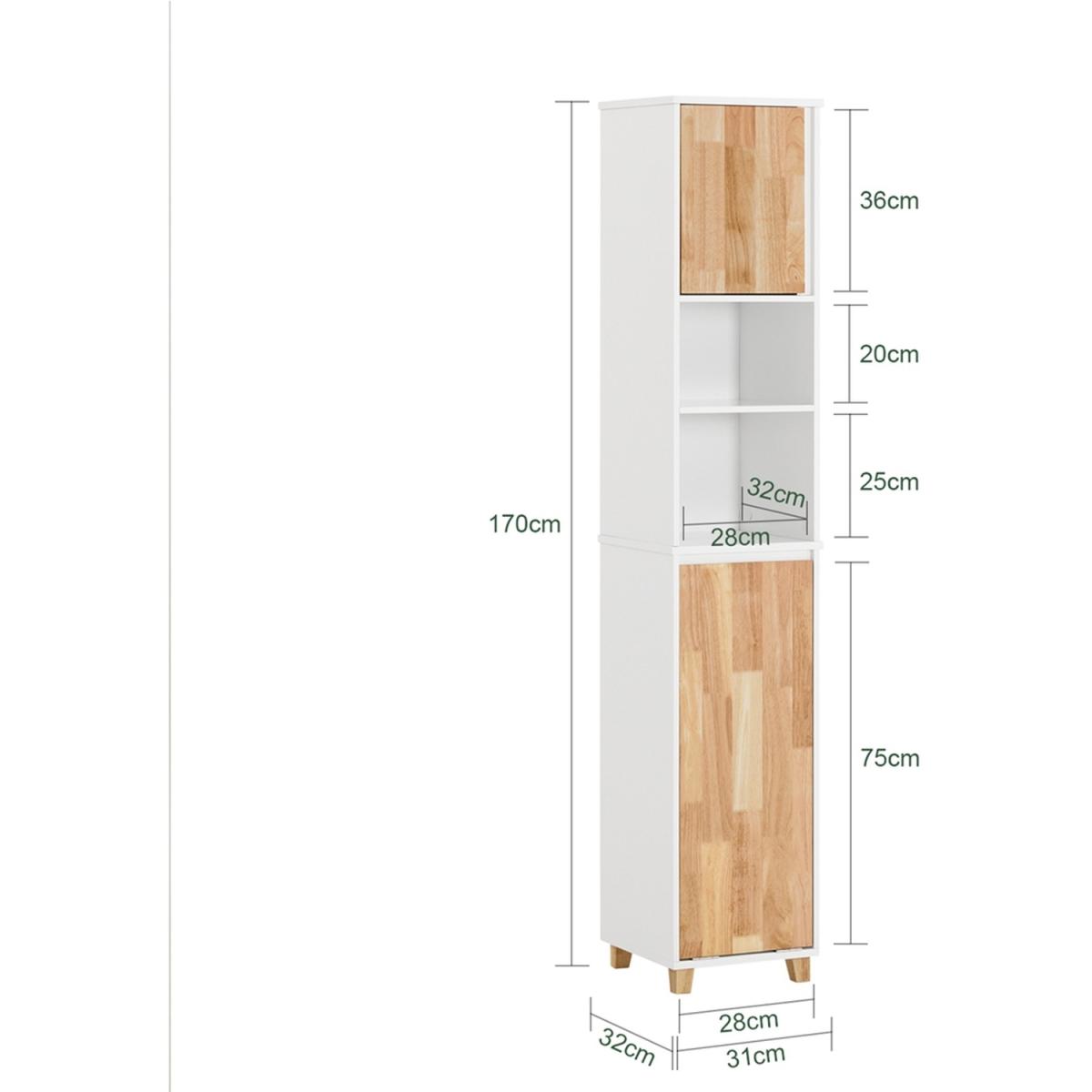 Modern design bathroom tall cabinet features 2 open compartments, 2 doors and 1 concealed laundry basket. The laundry basket is removable and foldable. Wardrobe feet ensure a stable hold. Ideal for protecting stored items from moisture. Bathroom furniture column with 1 doors and 2 shelves. It offers a space large enough to store your daily accessories in the bathroom. Comes without handles, making a hollow design on doors for comfortable opening.