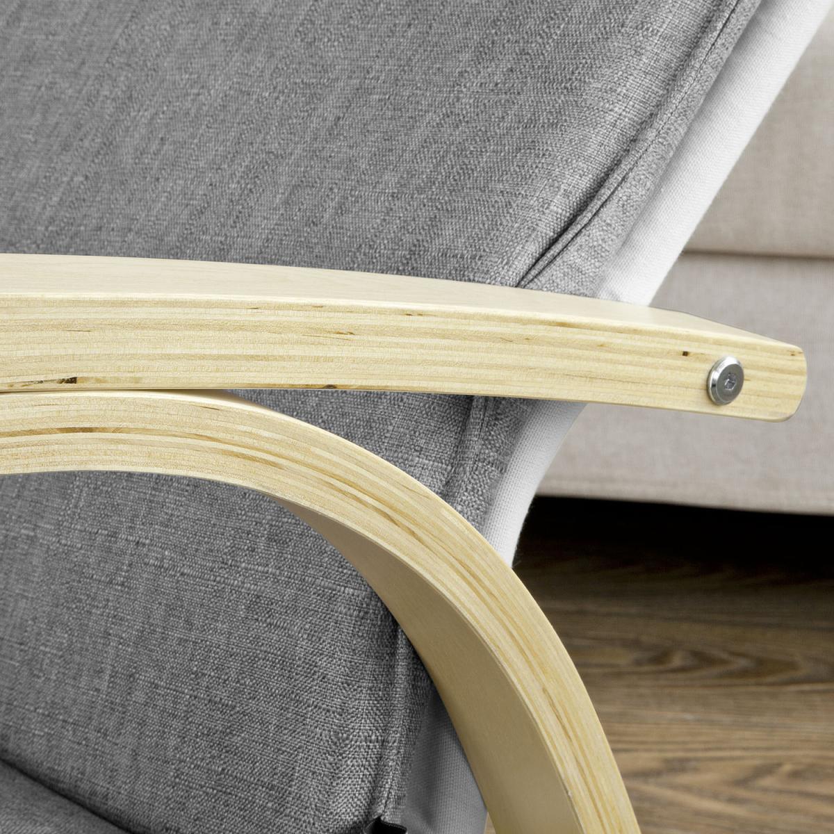 Comfortable relaxed lounge chair, rocking chair with cotton fabric cushion. The rocking chairs provide an exceptionally comfortable, relaxing, and enjoyable place to sit. Stable frame made of birch wood with varnished coating. Cotton cover with zipping that is removable and washable. Through the beautiful appearance and the simple colour scheme, the rocking chair is ideally suited to modern furniture.