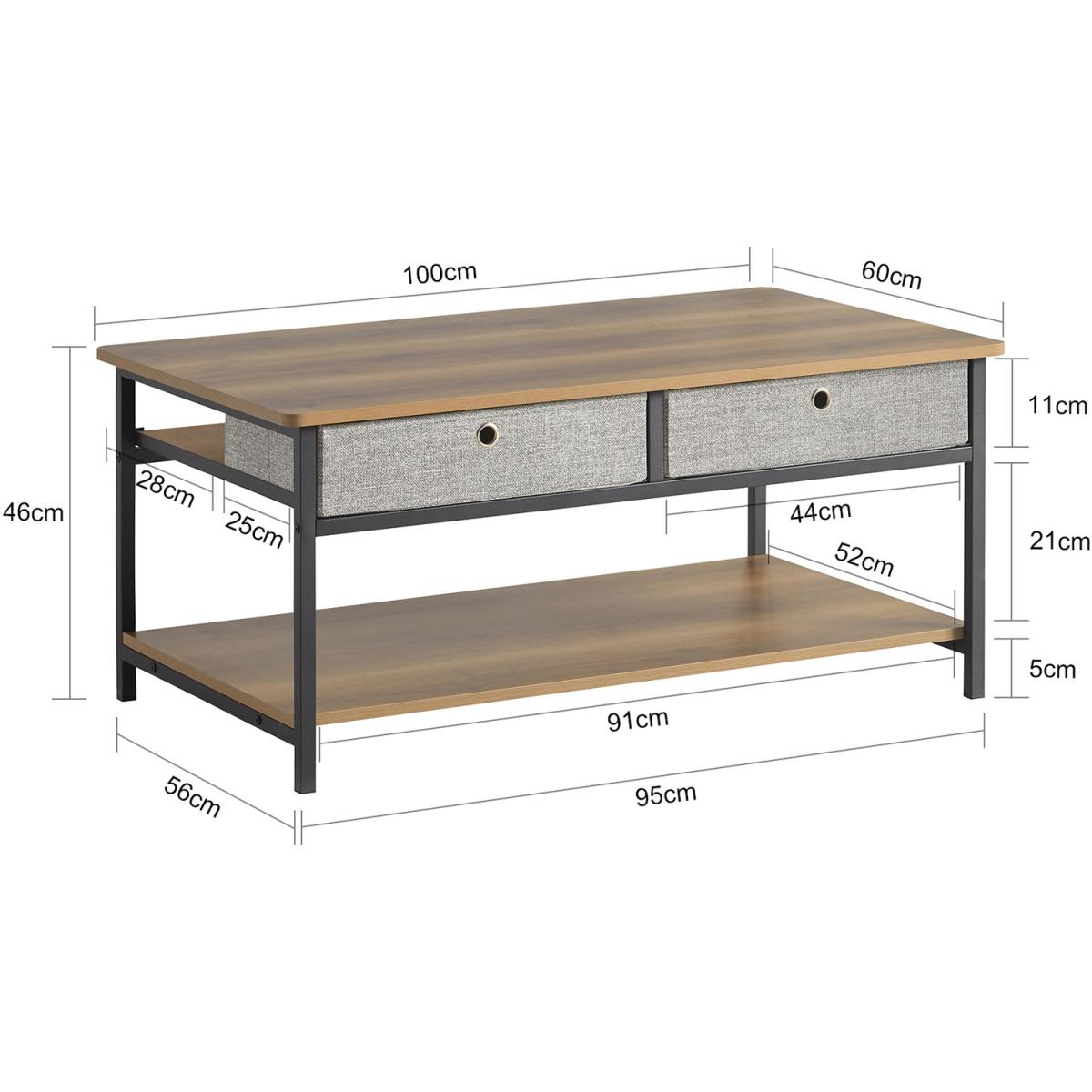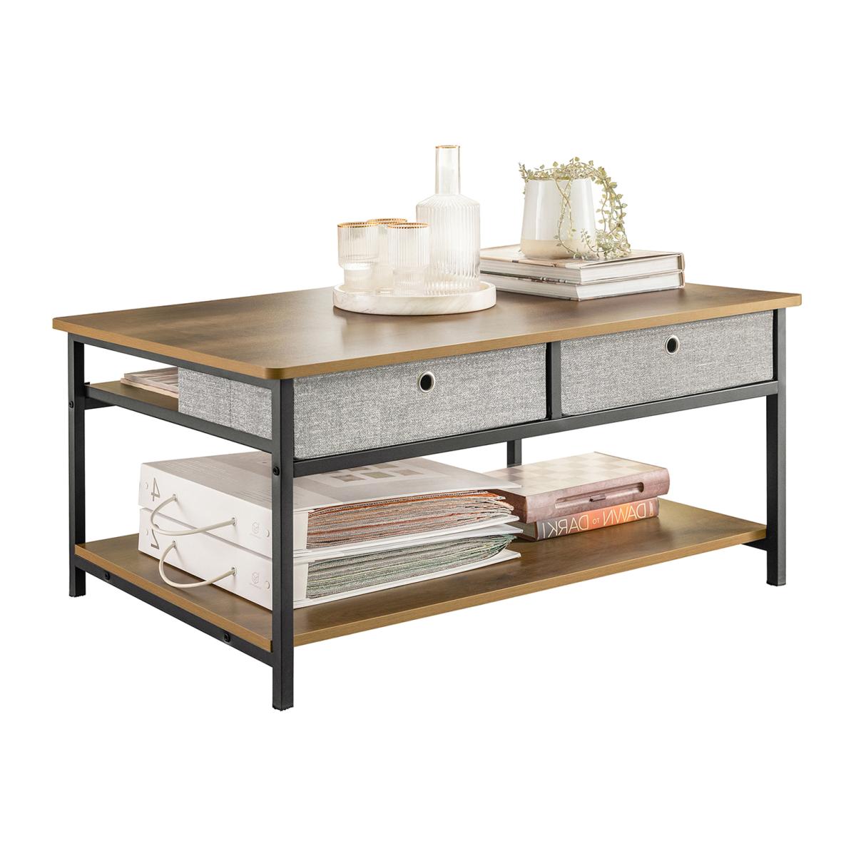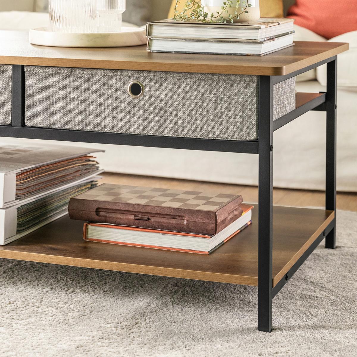 This Industrial Vintage Style Coffee Table creates a distinctive and modern atmosphere and adds more storage space to your home. Modern and simple design, it is suitable for a variety of locations, like living room, waiting room and office. Made of high-quality MDF with a wooden effect and black powder-coated steel frame. Stable and durable. 2 drawers made of non-woven fabric offer additional storage space for you. Thanks to its versatile design, it also can be used as a TV stand for your electronic devices. Item comes in a flat pack and requires self-assembly. Detailed instructions supplied. The decorative elements are not included in the delivery.