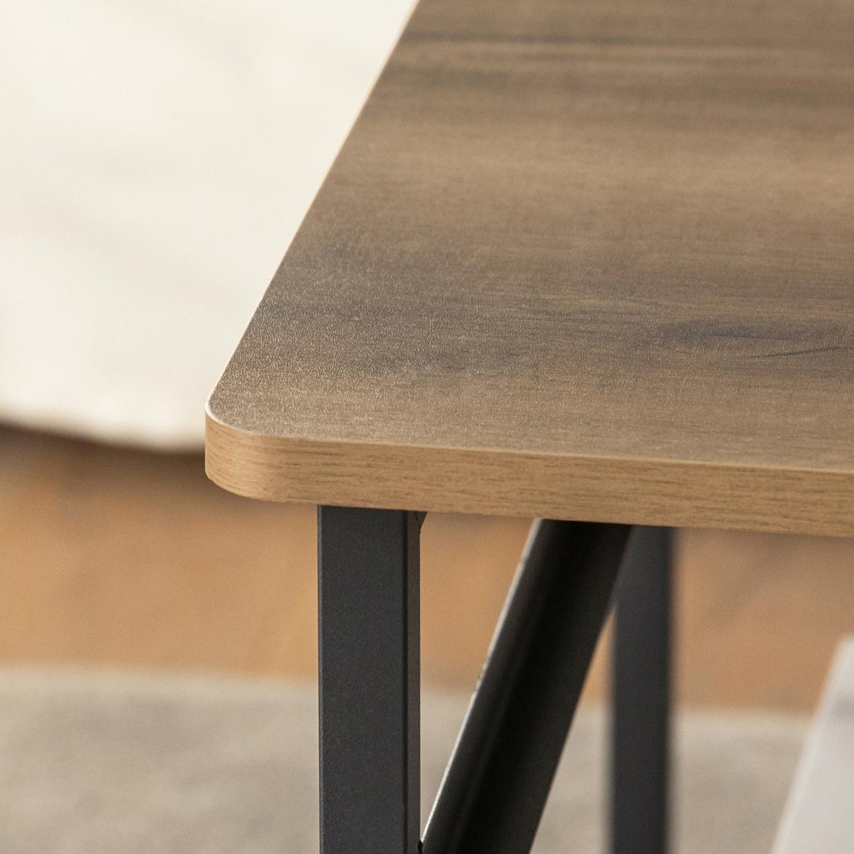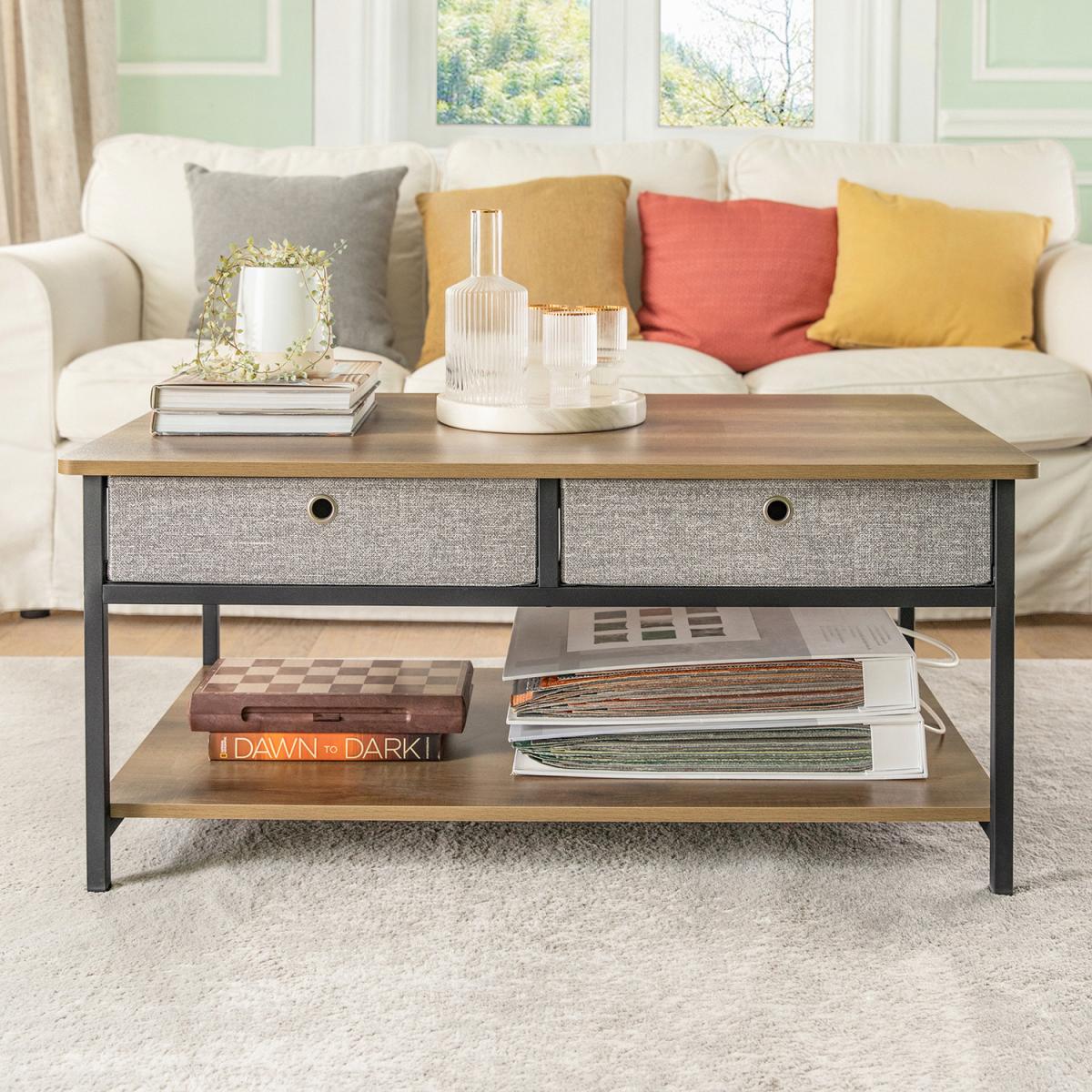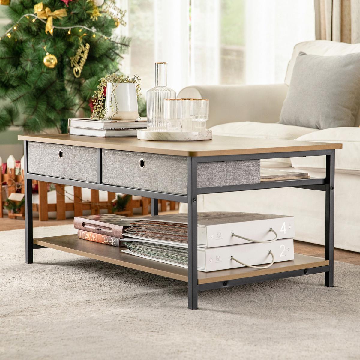 This Industrial Vintage Style Coffee Table creates a distinctive and modern atmosphere and adds more storage space to your home. Modern and simple design, it is suitable for a variety of locations, like living room, waiting room and office. Made of high-quality MDF with a wooden effect and black powder-coated steel frame. Stable and durable. 2 drawers made of non-woven fabric offer additional storage space for you. Thanks to its versatile design, it also can be used as a TV stand for your electronic devices. Item comes in a flat pack and requires self-assembly. Detailed instructions supplied. The decorative elements are not included in the delivery.