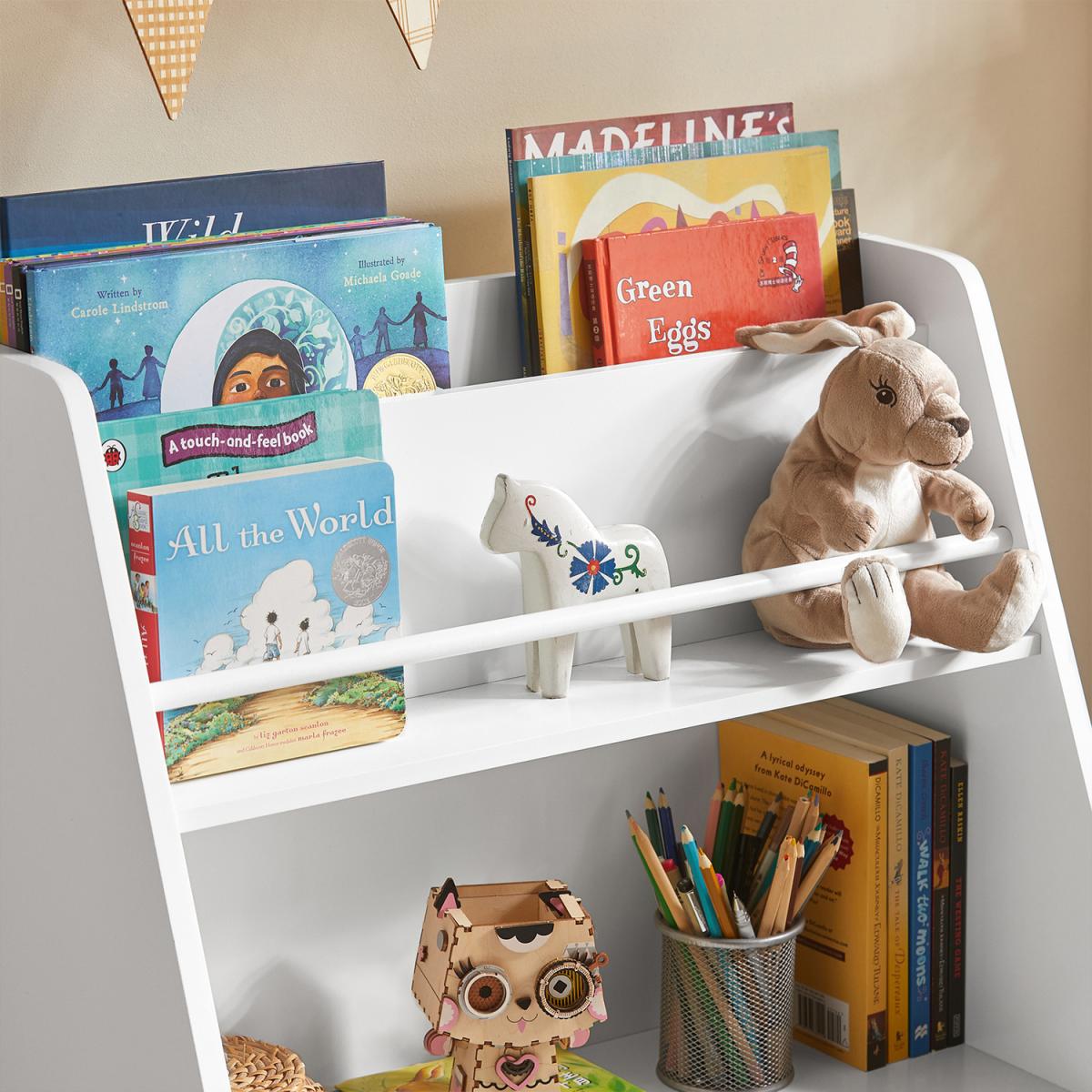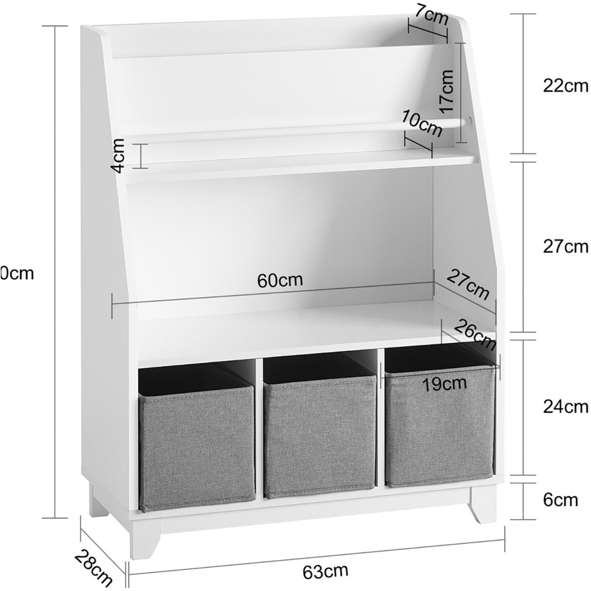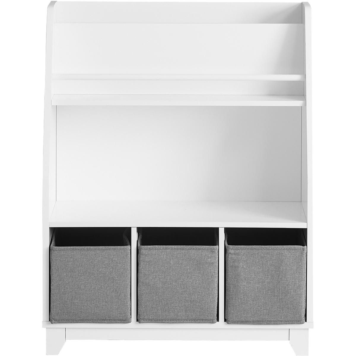 Modern design children storage shelf will blend perfectly with any decor. It will keep your room nicely organized.2 tiers on the top keep books from being damaged, flexible for books of varying size and thickness. A large storage compartment in the middle offers ample storage space.3 fabric drawers on the bottom can be pulled out completely as a great storage solution. Made of high quality MDF in white lacquer. The drawers are made of non-woven fabric in grey. Sturdy wood with environmental protection paint and the anti-tipping device, ensure good stability and safety, an ideal choice for daycare, classroom and children's room. Good looking as well as space saving, good choice for organizing books and toys.