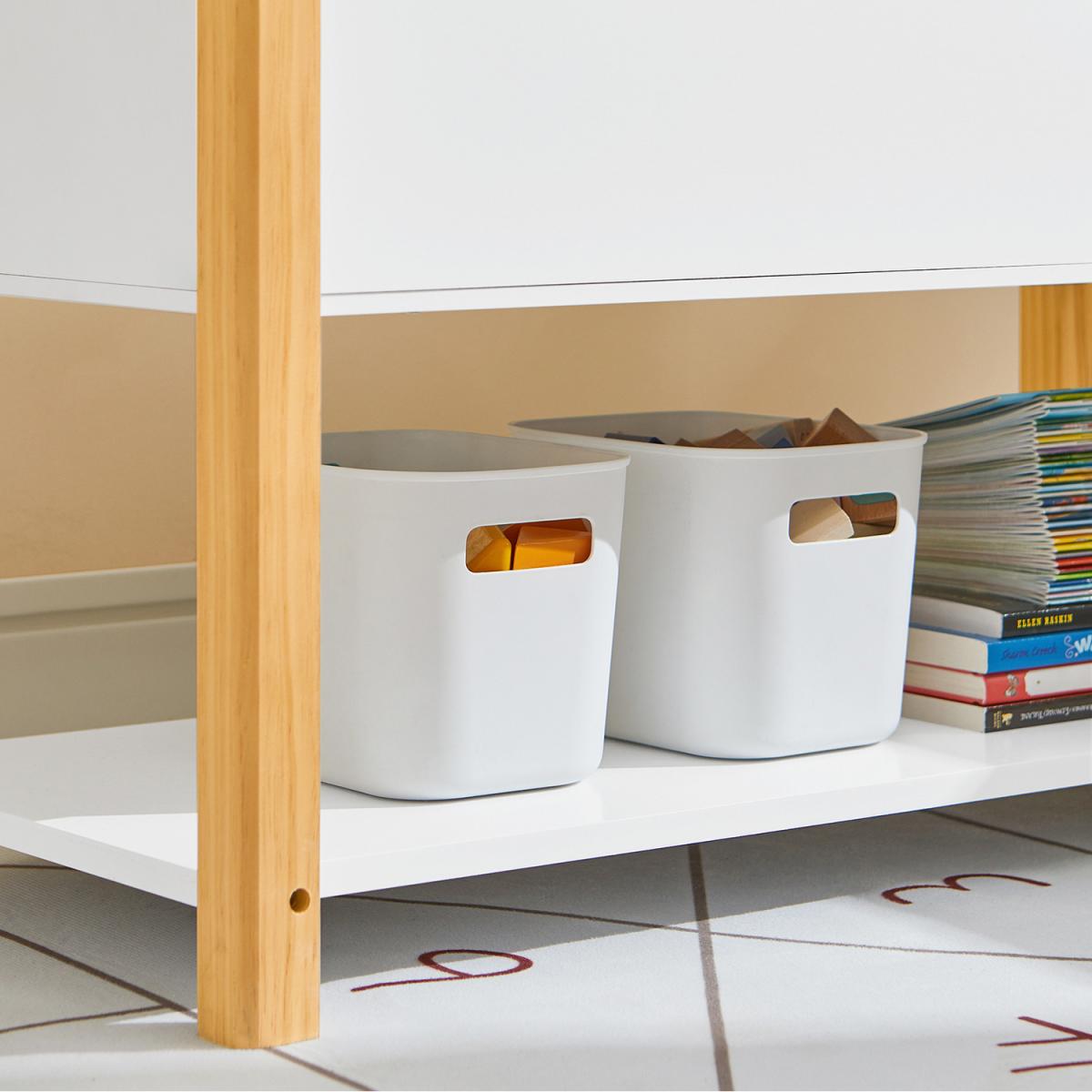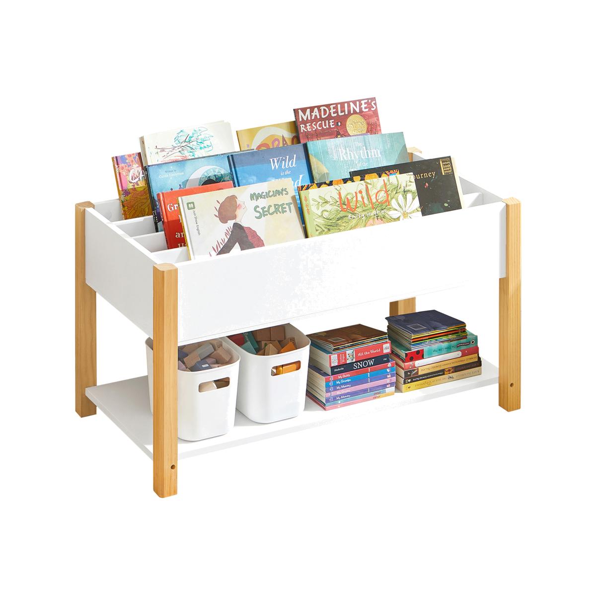 Modern design children storage shelf will blend perfectly with any decor. It will keep your room nicely organized. The box is divided into 4 storage compartments by 3 panels, so children's books can be sorted by topic. The 4 storage compartments will keep books from being damaged, flexible for books of varying size and thickness. A shelf at the bottom offers additional storage space for the books and toys. Made of high quality MDF in white lacquer. The 4 legs are made of pine wood with varnished coating. Stable and durable. Good looking as well as space saving, good choice for organizing books and toys.